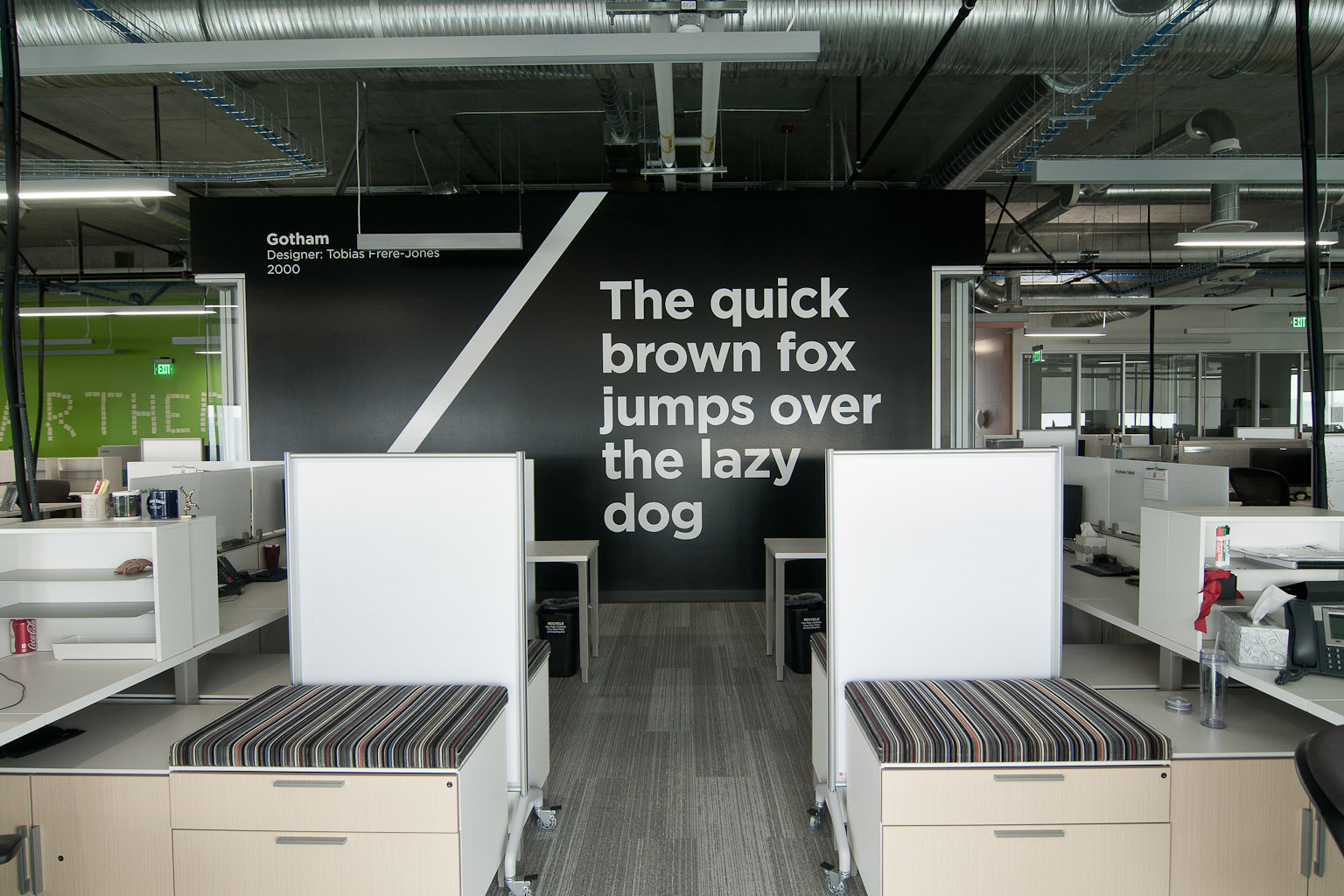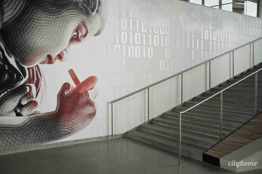 For our piece, however, we love that Adobe appears to have gone at the interior with creative guns blazing. It’s a vast expanse of employee-pleasing details [we assume the annual holiday party will be awesome]. The furniture and basic design are a win; simple, modern, easy on the eyes. Some of the more eclectic details stand out as random [say, the biggest lava tubes on earth or the piano room carpeted in turf], but they’re no less stellar for it. The building is filthy with amazing artwork, and every last piece of it carries some manner of Adobe-meaning. One example is the giant work of El Mac in the atrium. As a photo-realist graffiti artist, El Mac utilizes Adobe Photoshop to create giant murals the world over with spray paint. Appropriately, Adobe set him to it, resulting in an incredible piece of a little girl coloring, which is meant to “inspire the child in all of us to dream, explore, invent and create the future”. Mike Giant, a graffiti artist with a bent for lettering, was asked to grace the walls of the café; in brilliant fashion, it’s perfectly littered with terminology that reflects the Adobe values and culture.