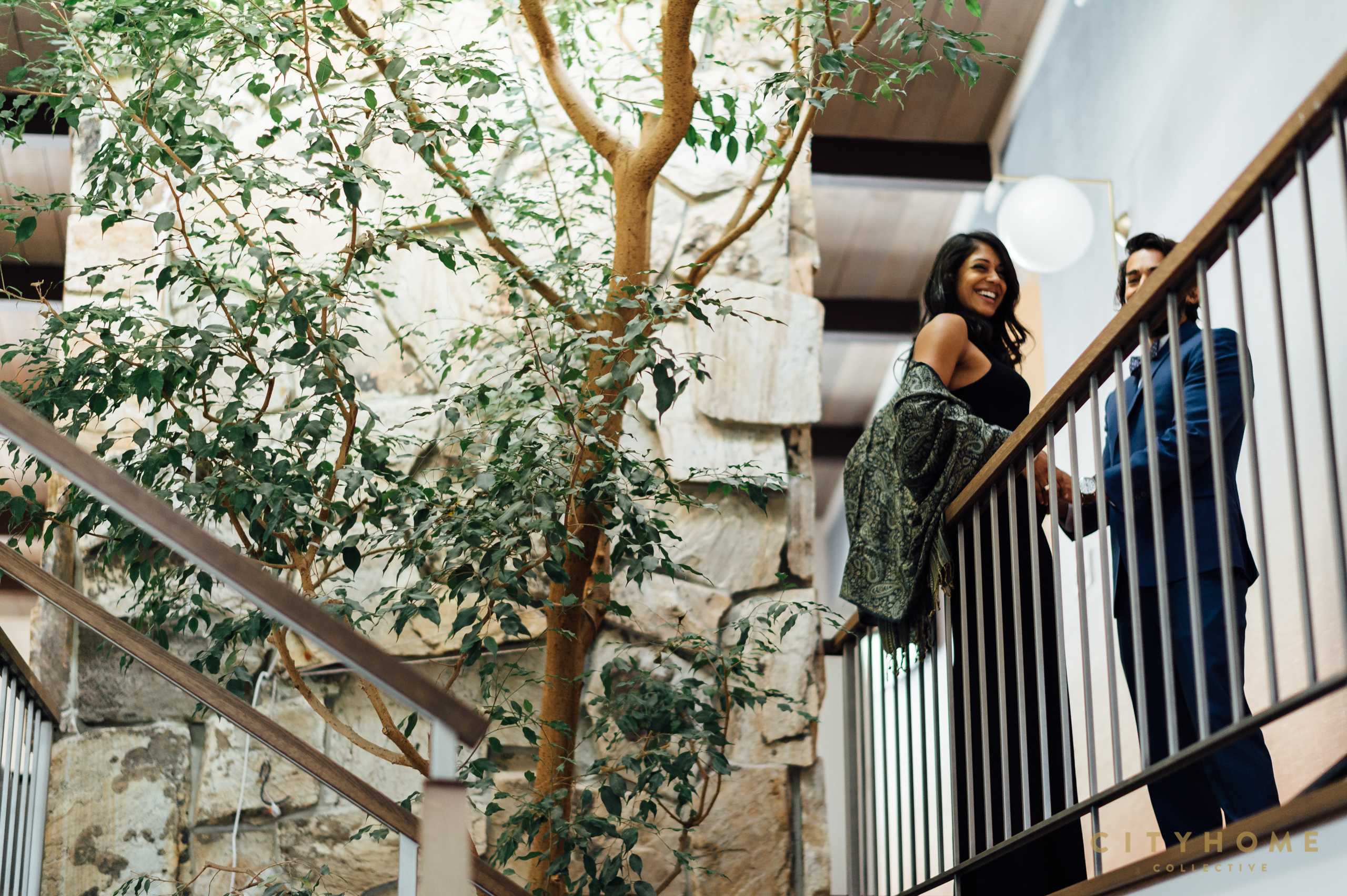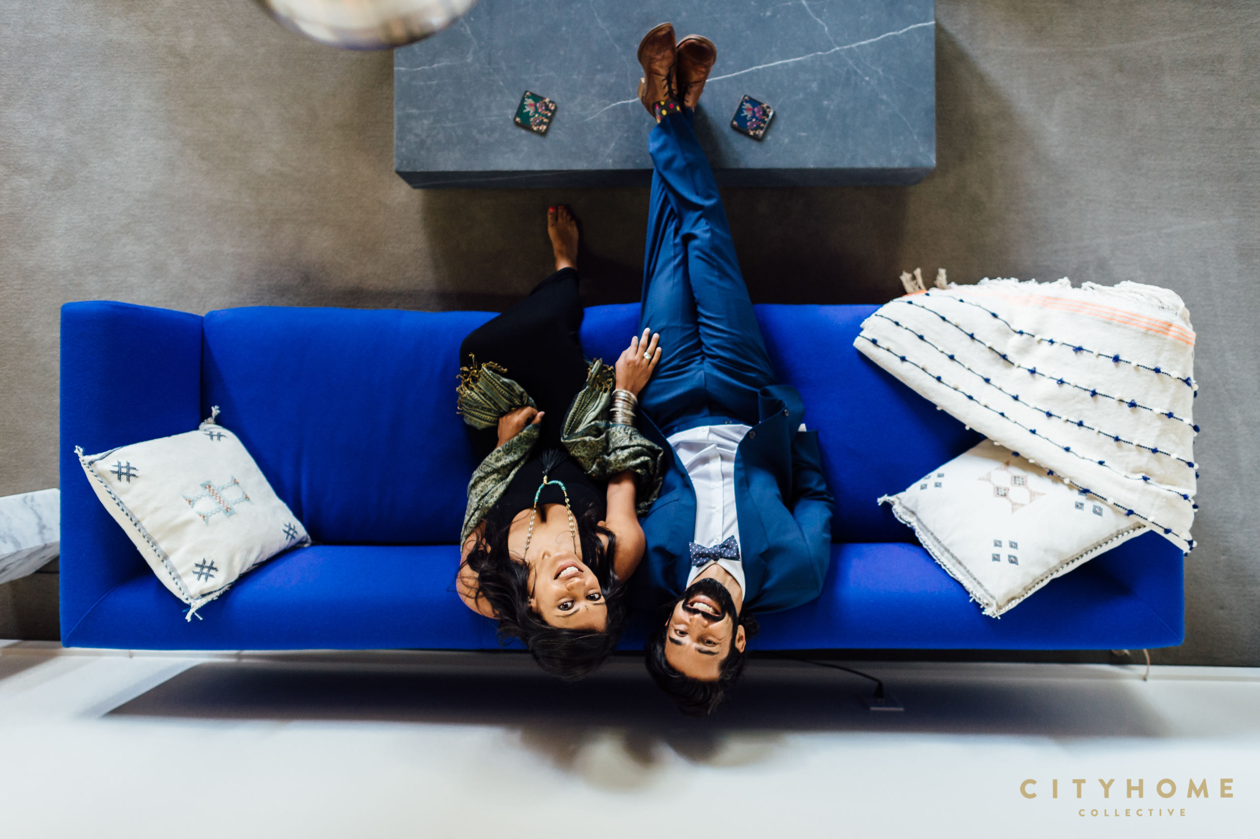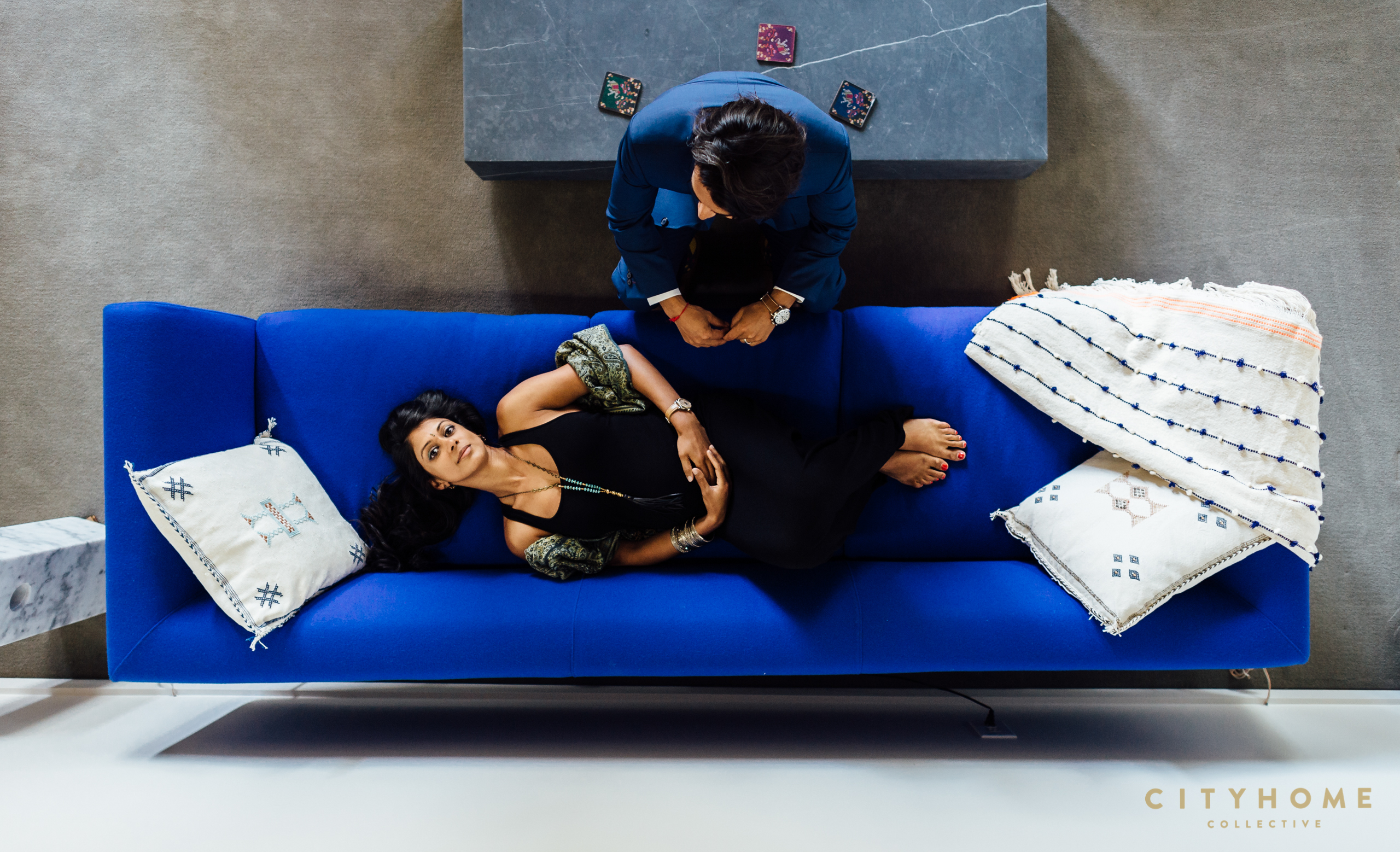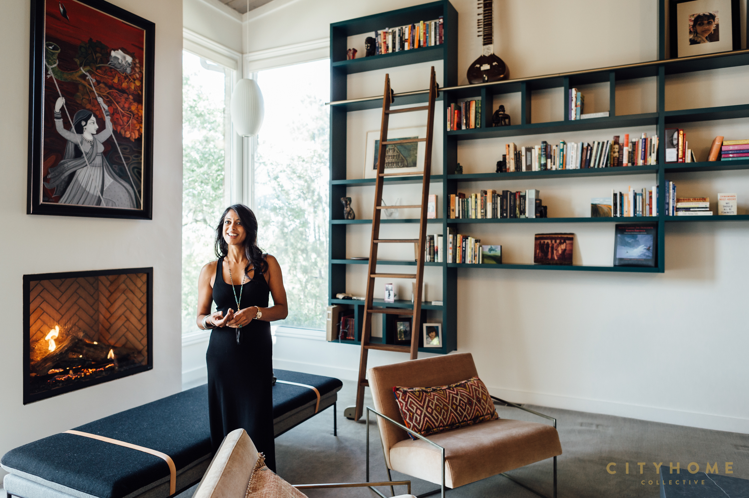 We first met the couple you see in the images here when they the elected the talented hands of our COLLECTIVE design crew to jazz up the interior of their new home. The cityhomeDESIGN team was more than happy to oblige, and the resulting space is one of our favorites. The pair of doctors (yes, pair. Of doctors.) wanted to maintain many of the features of the original, but also needed to bring it up to date and add some substantial color to the palette. The layout, exposed beams, existing rock wall and indoor tree would, of course, stay. Both Shaneen and Saloni are avid climbers, and to that end, it was imperative that we keep them more than a titch connected to the outdoors. Says lead designer, Susannah Holmberg, "The tree was a really substantial part of our design. Ultimately, it's the reason we chose the sunrise wallpaper and corresponding globe lights (that are kind of emblematic of the moon)."