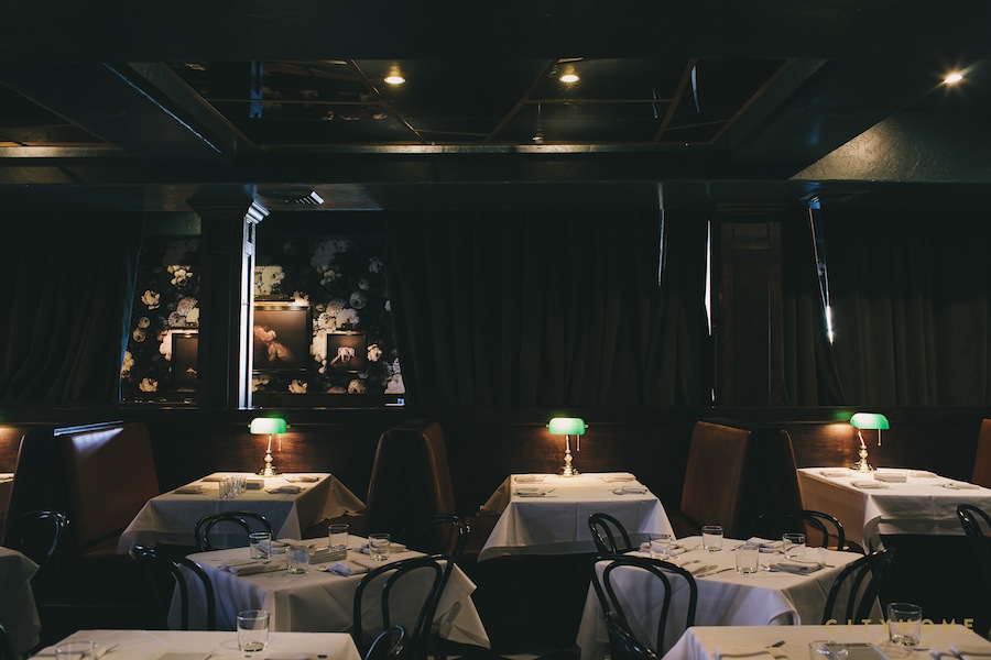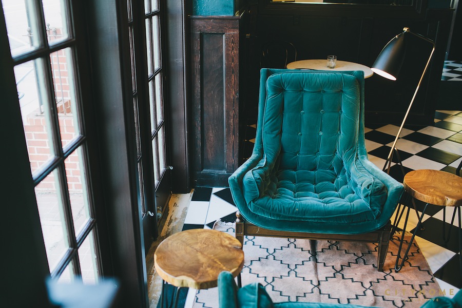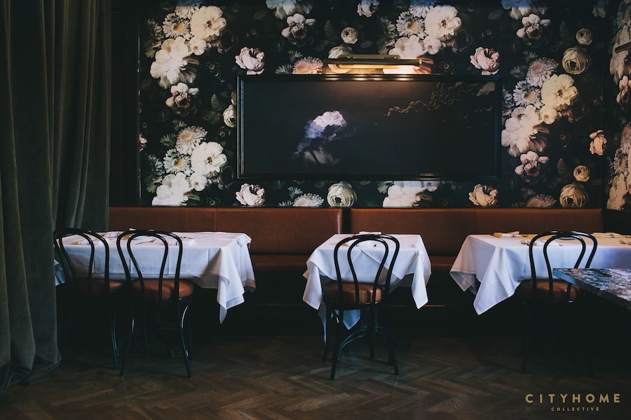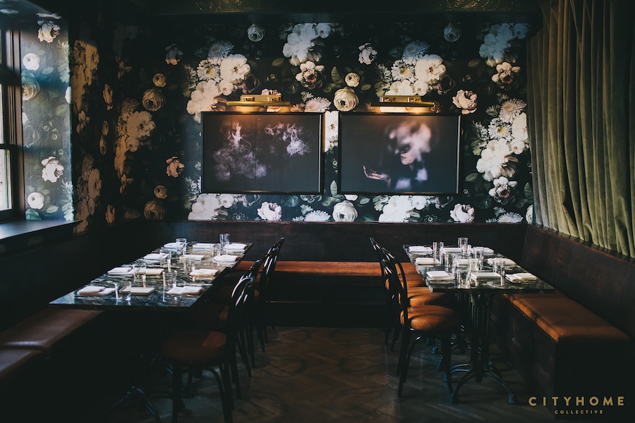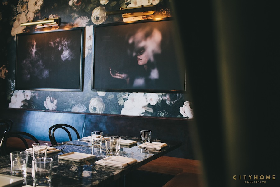 The private dining rooms at Finca were one of the first things to be designed. Even before the paint color was chosen for the restaurant, Cody knew he had to have that floral wallpaper. It's bold, it's sexy, and it's as multidimensional as the tapas on the menu. After sourcing for countless hours, we finally tracked down the paper to British graphic designer, Ellie Cashman. Well worth the flight across the pond. These rooms are dark, brooding, cloaked in grey crushed-velvet curtains, and my favorite space to dine. Everything looks sexy in these rooms.