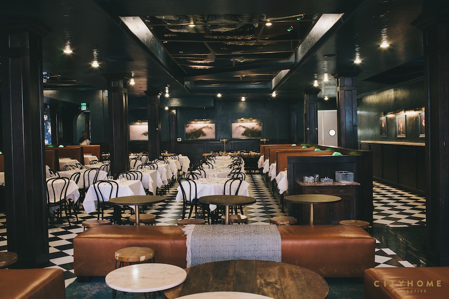 We went to work mapping out the overall layout, and Cody made sure there were plenty of layers to the design. We wanted to create an effortless combination of found antiques [that mantel behind the bar!], classic restaurant style, and pops of modern. The checkerboard floor, white linens, and bistro chairs have been restaurant staples for years. Combined, these elements create the perfect backdrop for the modern and unexpected touches--custom sofas, an array of pink, green, and black marble pieces, and neon lighting. Anyone who knows Cody or has stepped foot into our COLLECTIVE office knows that this particular facet of design--lighting--is everything to this man. He knows his shit, too. There are no fewer than ten different types of lighting in Finca, and this acute attention to detail makes for a sexy, moody, vibey, environment where you can spend hours, regardless of the time of day. Vintage brass art lights are met with ornamental brass chandeliers, tubes of neon, and classic green library lamps. The drop-down geometric ceiling grids serve to spruce up that oft-so-forgotten plane. And let us not forget candlelight--a must for any true Cody Derrick-designed space.