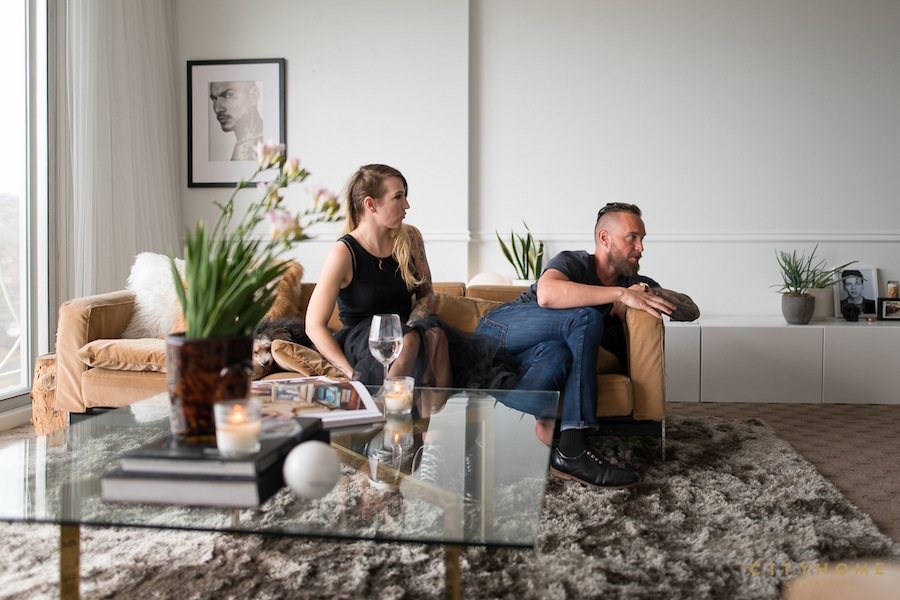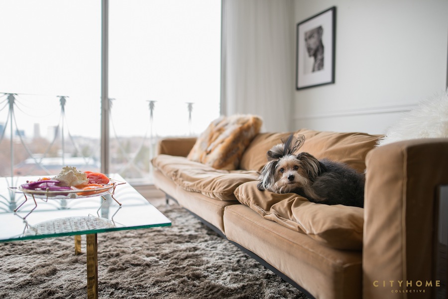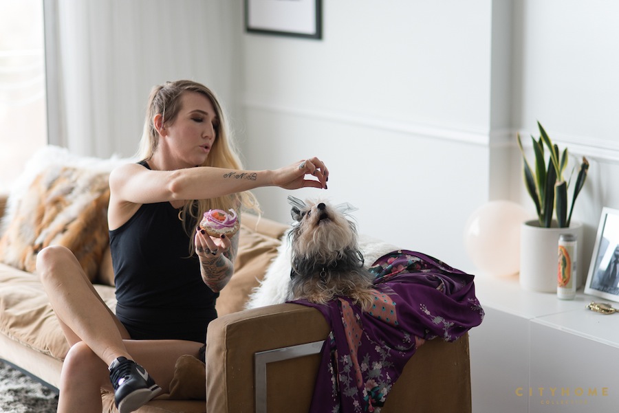 In each ad in this campaign, we like to showcase a client that we've helped--in some way--to finally find their space. We helped them buy and design a cozy family casa; we helped him find and design a posh downtown eatery, and we're currently helping them sell their dreamy, custom modern on the hill. Fact is, we like helping all types of folks buy, sell, and design their spaces. And if some of those folks happen to fall under the COLLECTIVE employee umbrella, well, then, hell yeah. Perhaps you've seen Miss Lauren Bald's pretty mug around our site a time or two before; she's been holding it down as a definitive task master extraordinaire around these parts for the past three and a half years. She's the veritable Peter Venkman of the office--the instinctual answer to "Who you gonna call?" Girl gets it done, and gets it done well. With a degree in interior design, she's also got quite the keen eye, to boot. She's aided our capitan Cody Derrick on a handful of design projects (see here and here), and has been known to spearhead a staging project (or 20). Woman is a worker, ain't no doubt, but she also knows the importance of loving where you live. Which is why, about this time last year, when a dreamy little unit at the Bonneville Tower came available for the right price, this first-time buyer enlisted Cody's help in snapping it up (read all about it here). All told, the beauty came in at just under 200k, but you wouldn't guess it was any less than five from the way she's styled it to perfection. With stark whites, vintage accents, and a few slightly-thuggish touches (for authenticity's sake), Lauren mostly lets the city views do the talking. Mixing velvet, glass, gold, concrete, and a rug of which dreams (and potentially clouds) are made, this soaring space hits every mark.