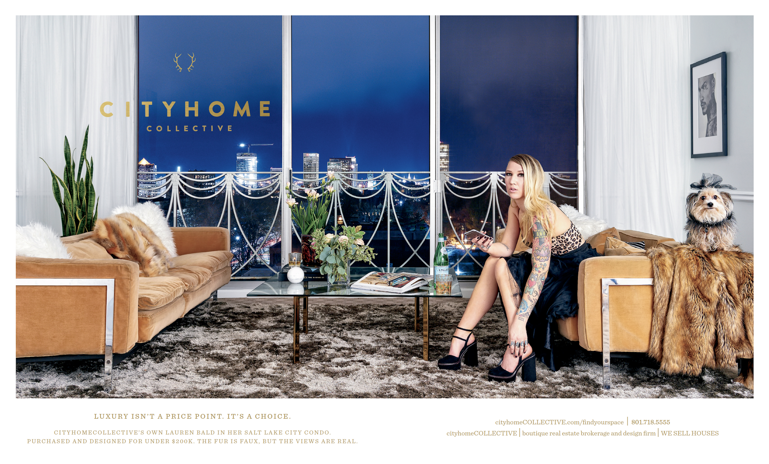 This shoot was inspired by the lady herself: silks, tattoos, succulents, (faux) furs, a token bottle of San Pellegrino, and--of course--her other half, Pickle the pup. It's a pretty but never-too-polished vibe, and you can safely assume that Best of '90s Hip Hop was coolly coming through the speakers mid-shoot. Mr. Matt McDowell snapped the beautiful behind-the-scenes shots for your perusal, and as ever, George Oakley came through with an enchanting end result. The final ad, which you'll find prettily printed in the spring edition of Utah Style & Design, is luxe, elegant, and quintessentially Lauren. And therein lies the concept: finding your space is all that matters. Big or small; old or new; bungalow or high rise. Living luxuriously doesn't have to cost it. We do it all, and we do it all for you.