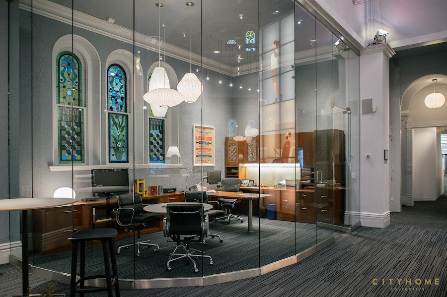The walls are lined with desks and a few gorgeous, glass offices, and two-story ceilings enable the stained-glass windows to do what they do best: a patchwork of green, blue, and purple is cast onto the carpet, enhancing the already-divine vibe inside. Maharam wall graphics offer touches of bright, clean color. Modular pieces of furniture from S.F. brand, Fuse, as well as pieces by Herman Miller allow for flexible meeting spaces and accommodate a shifting organization of teams. And, in one of our favorite details, walls are daubed with inspiring messages from the lexicon of Herman Miller: “We feel before we think," “The next big thing isn’t for you.”