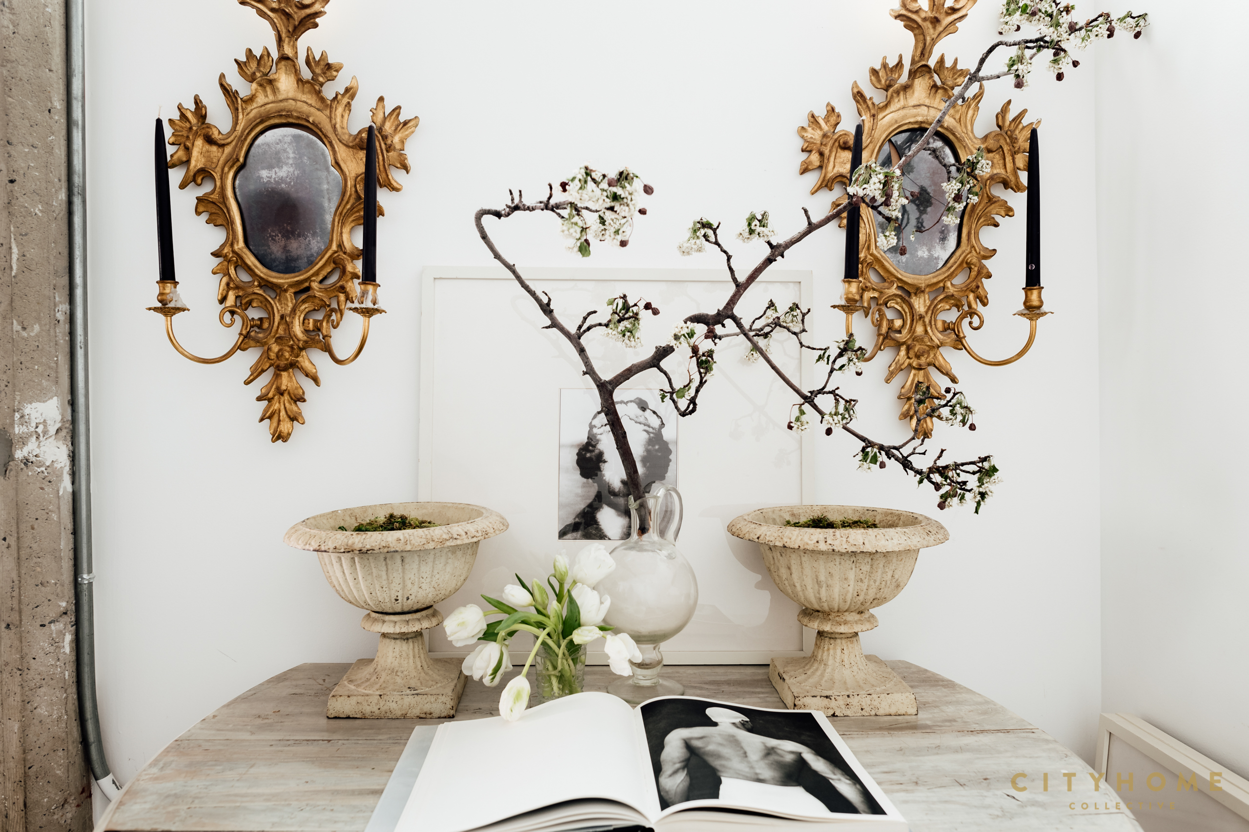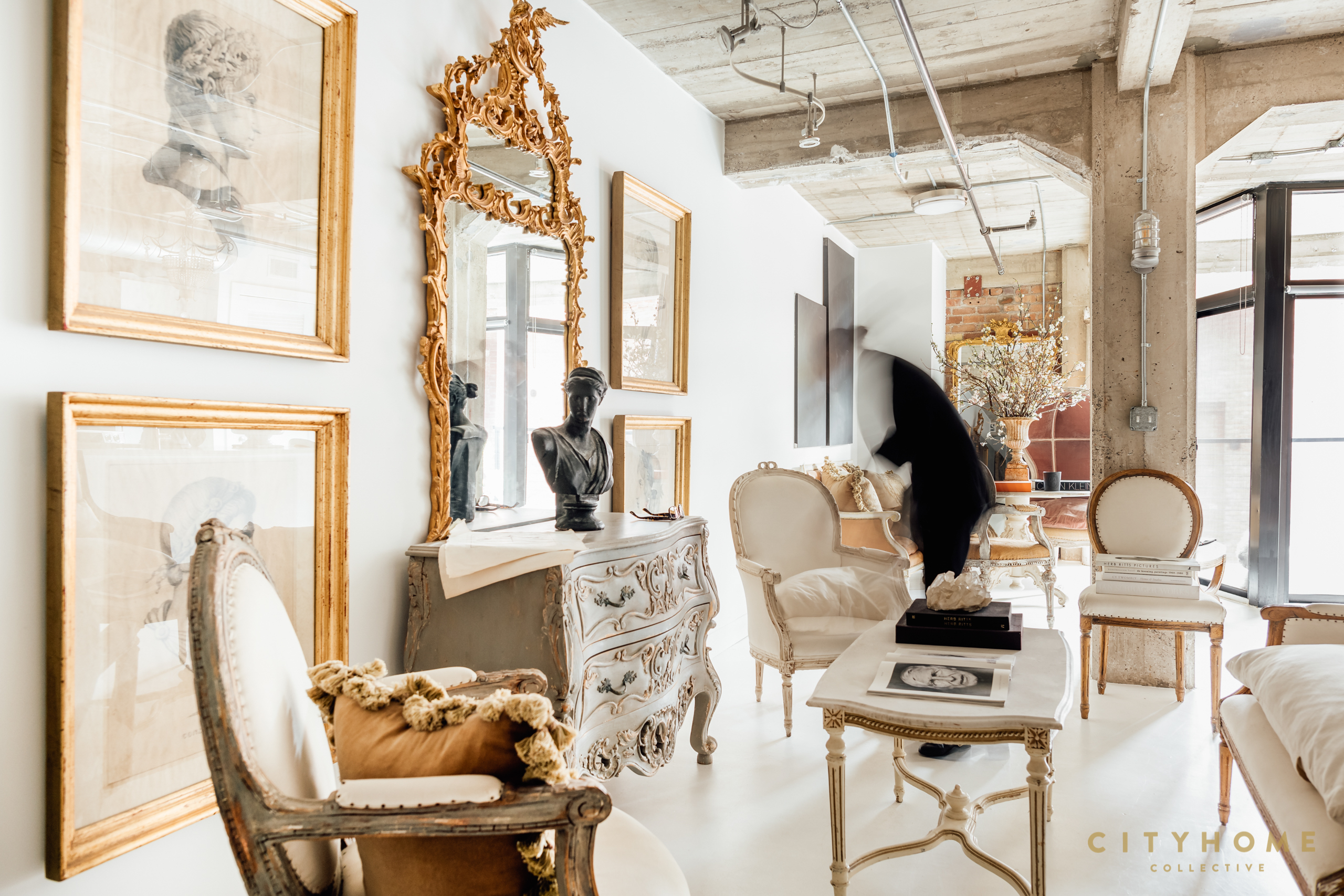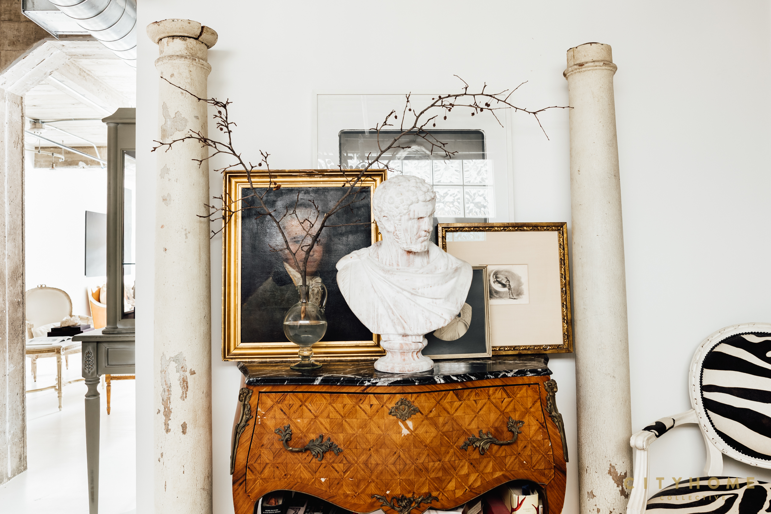 Collecting objects over the years, he has manifested a collection of pieces that enabled him to take an open space and make it into a palace in the city for him and his partner to share. As I enter the space, my breath is taken away, as—from the doorway—there is already enough to capture my attention for hours: an entryway decorated with brass candle sconces, a crystal pitcher filled with an arm of blooming branches, and, around the corner, a cloud-plush bed and a marble-top credenza holding a stunning photo of Marilyn Monroe beside a Grecian bust. The bright orange of an Hermès shopping bag vibrantly sits beside a zebra print chair. Each place the eye lands on is a vignette to explore.