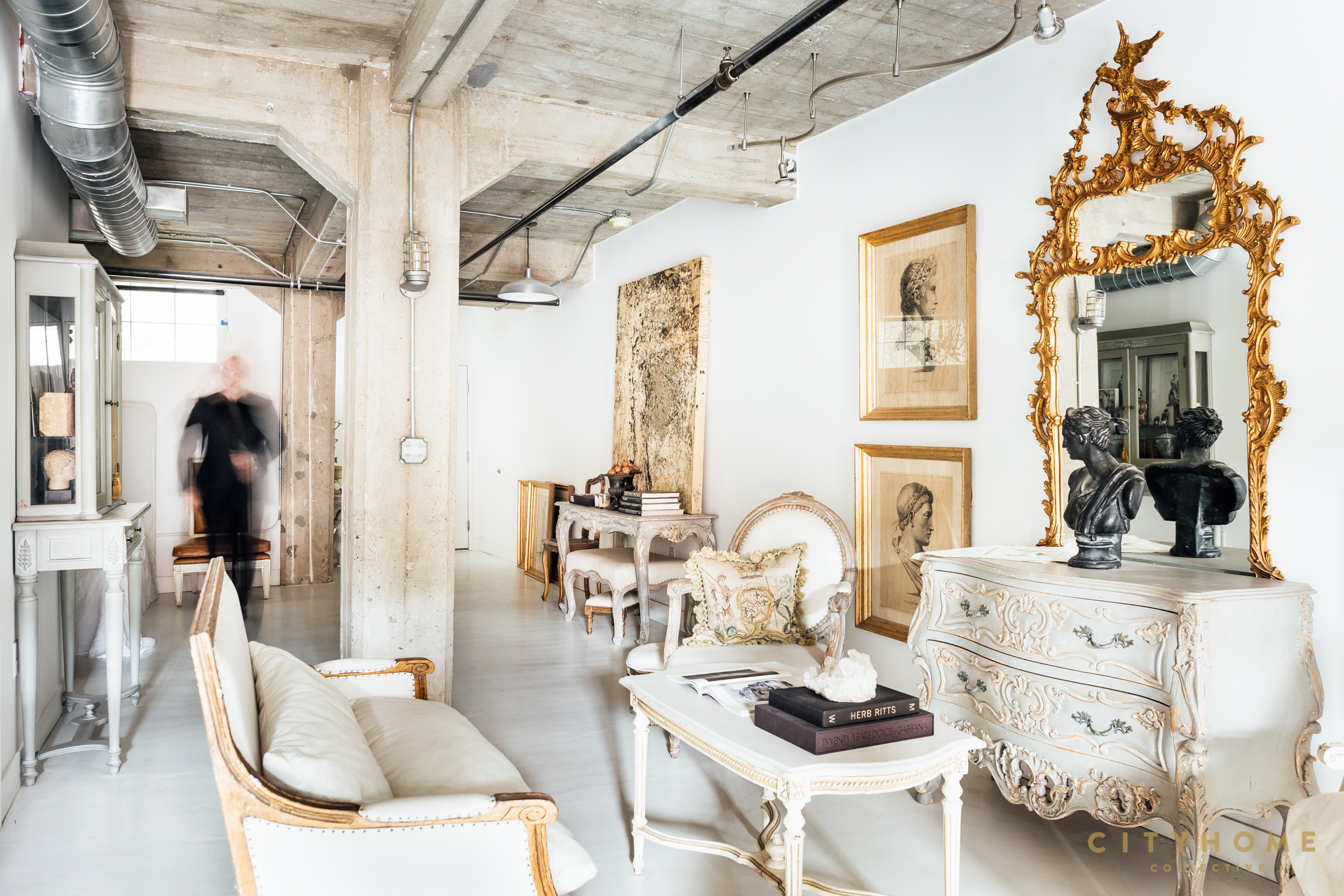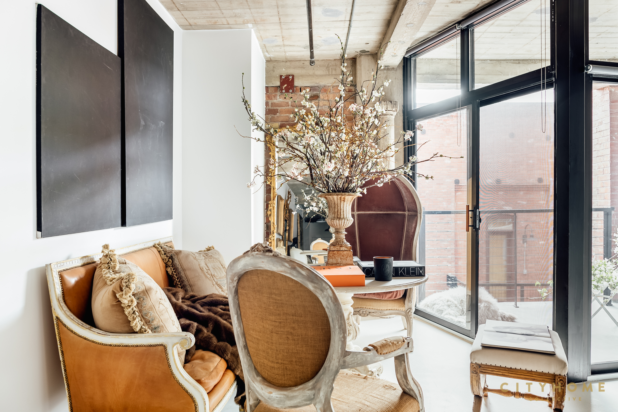 The stories here are as plentiful as the objets d’art: original work gifted from a New York artist, a glass cabinet filled with black and white modeling photos from back in the day. Little moments, each made of objects, art, and furniture, all meant to work in conversation within this industrial canvas or brick and concrete, all a blend of old-world European and modern-day life. Upon being asked what inspires his style, Robert responds that it’s his life experiences; he adds texture through layers of a worldly life lived. The styling of his home is simply putting his life on display in a way that one can look upon and feel. “I appreciate the textures,” explains Robert, pointing to a velvet and burlap French throne chair. “The contrast of high-end furniture profiled with lower-end material is something I have always loved.” The space is a collection of what was and what will be, moments to appreciate and spaces to lounge. Memories from the past and yet to be created. Robert and Francisco, welcome to Salt Lake City.
