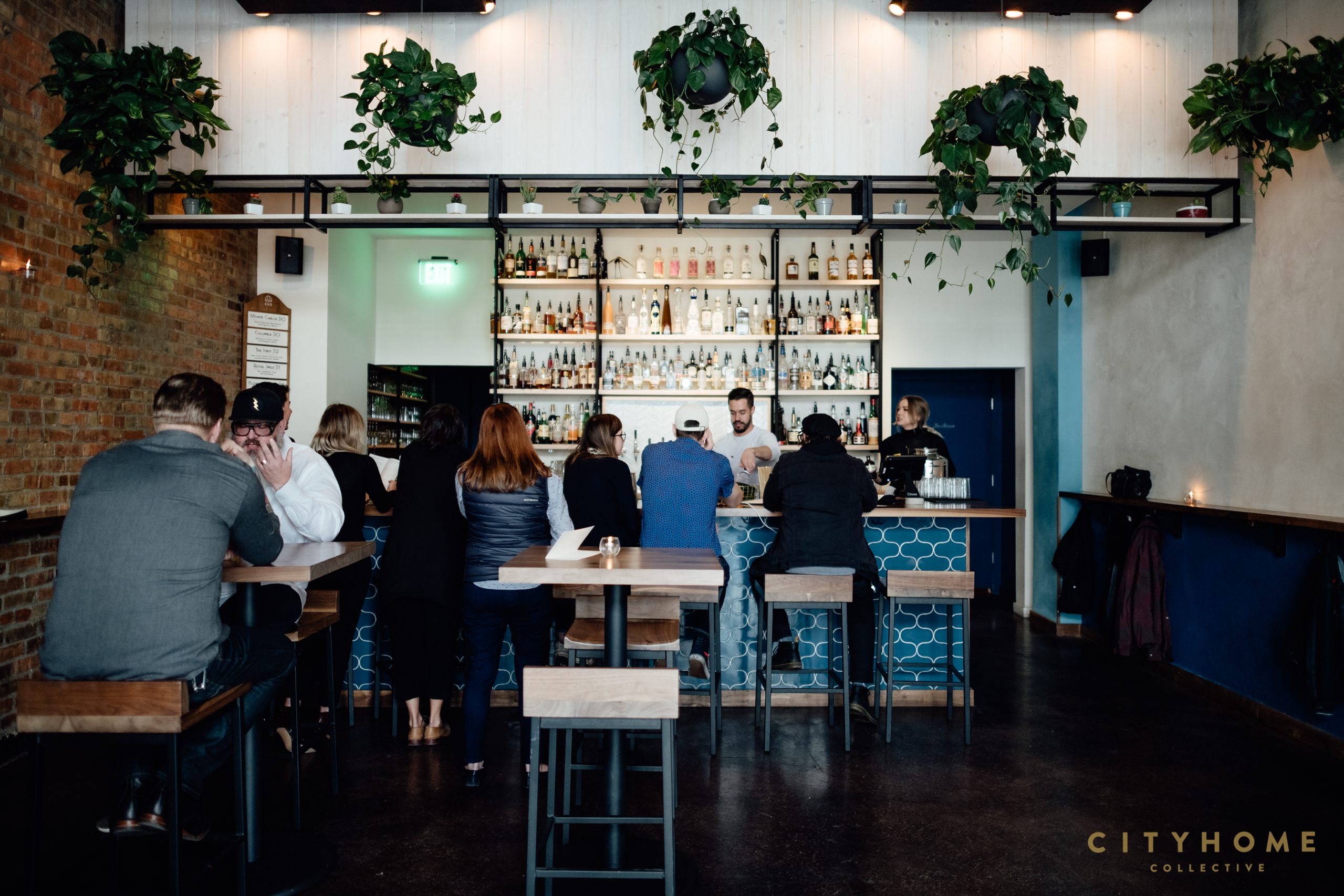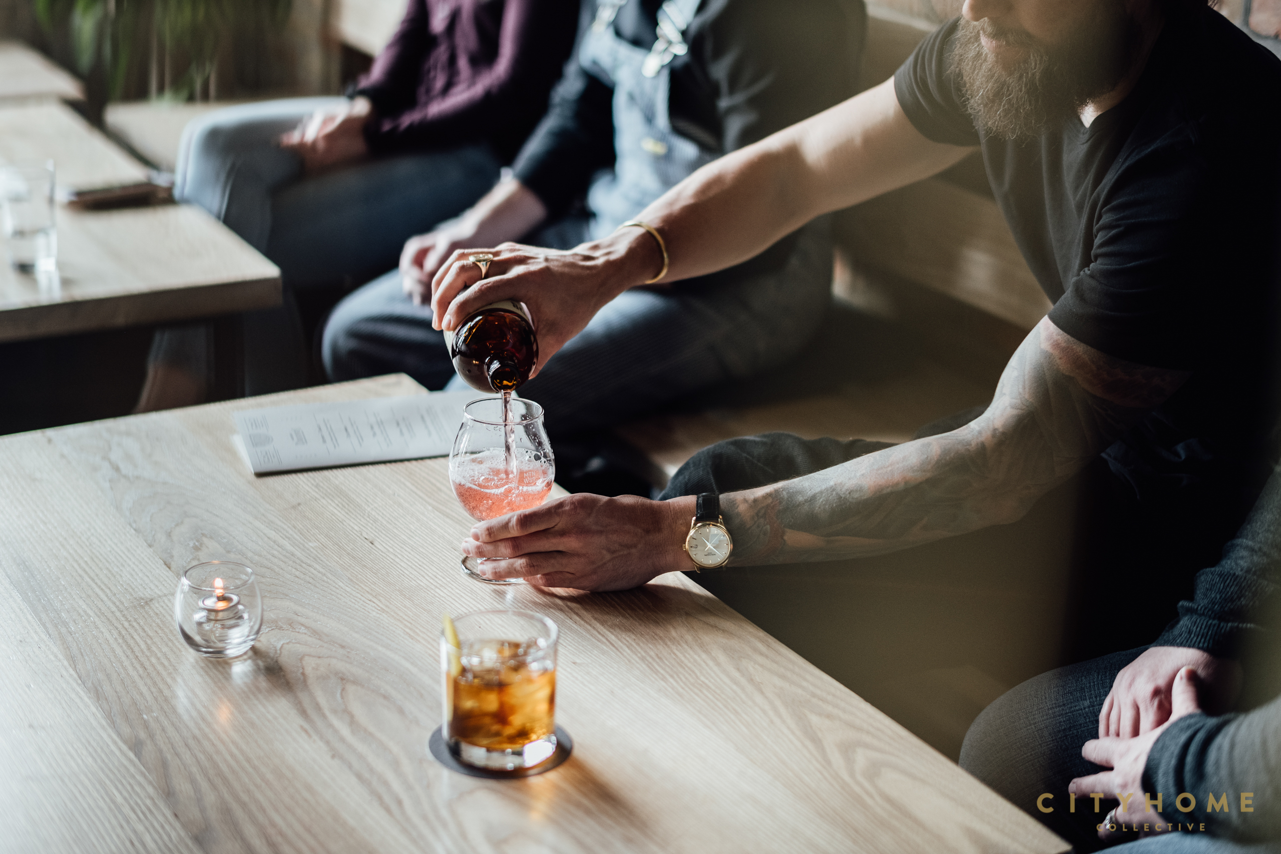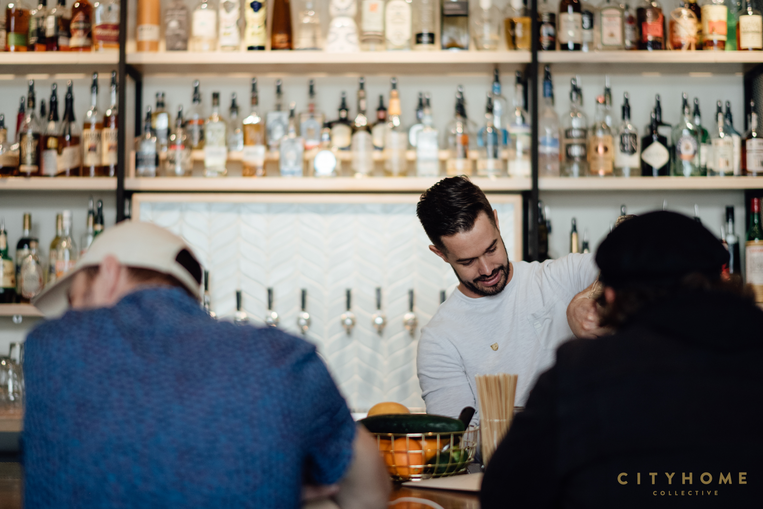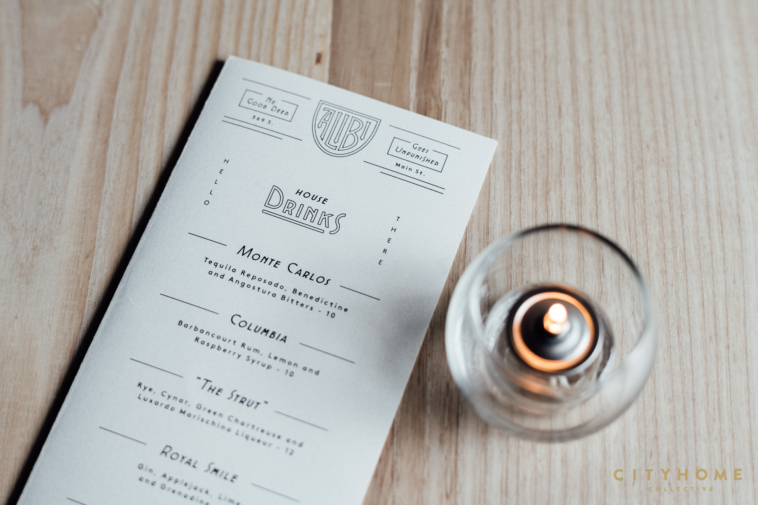 It doesn’t take much of an airtight excuse to get us in to Alibi. It’s the ideal trifecta of amazing cocktails, engaging design, and primo location that are a solid bet in our books. Lots of natural light if you want it, or cozy corners for snuggling equally abound. Clean lines mellowed and enhanced by the stellar mural by Dan Christofferson (a COLLECTIVE fav), who along with finish carpenter Oliver Lewis was given free reign with the bar design and aesthetic. The finished product reads as layered, urban, comfortable, and funky.