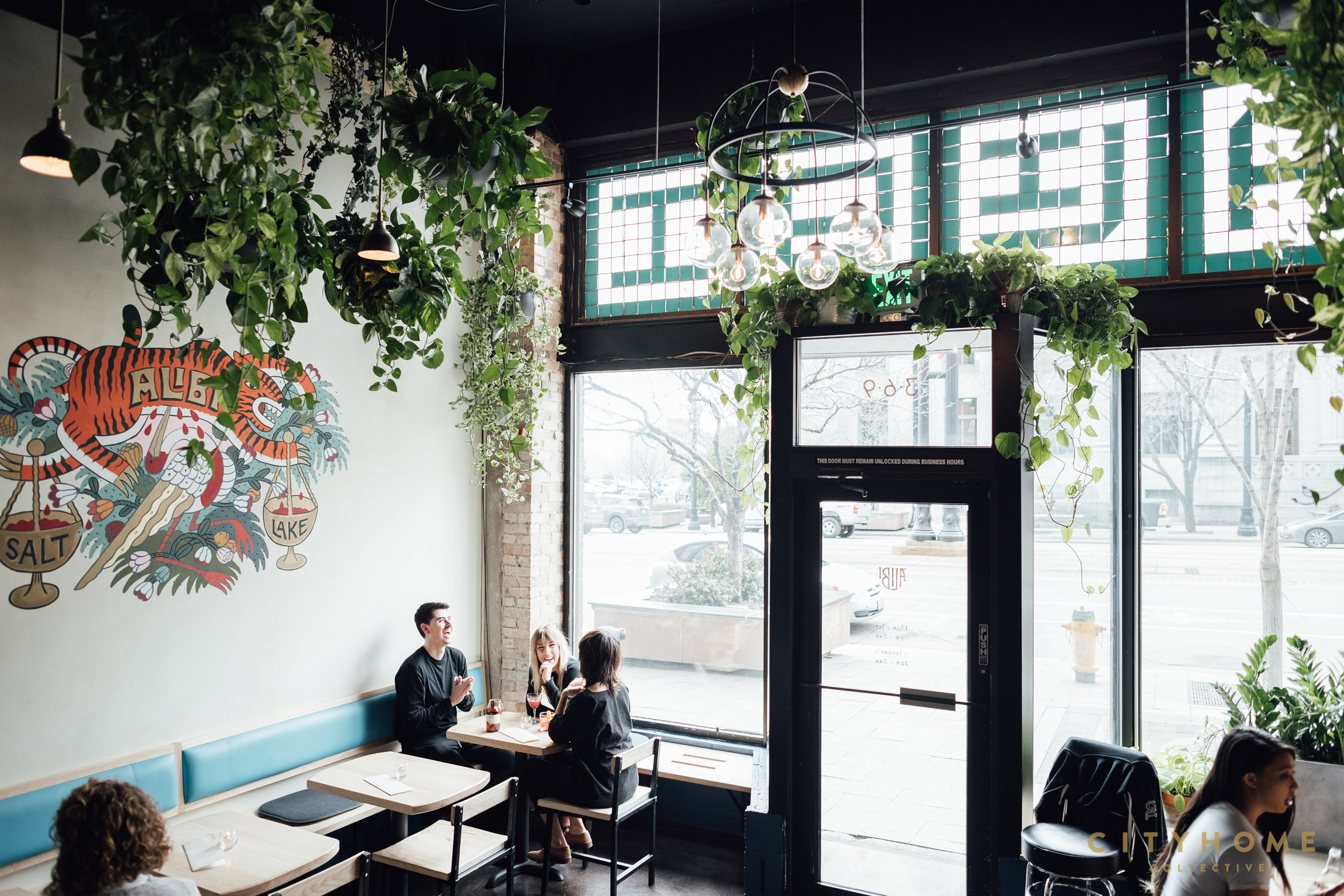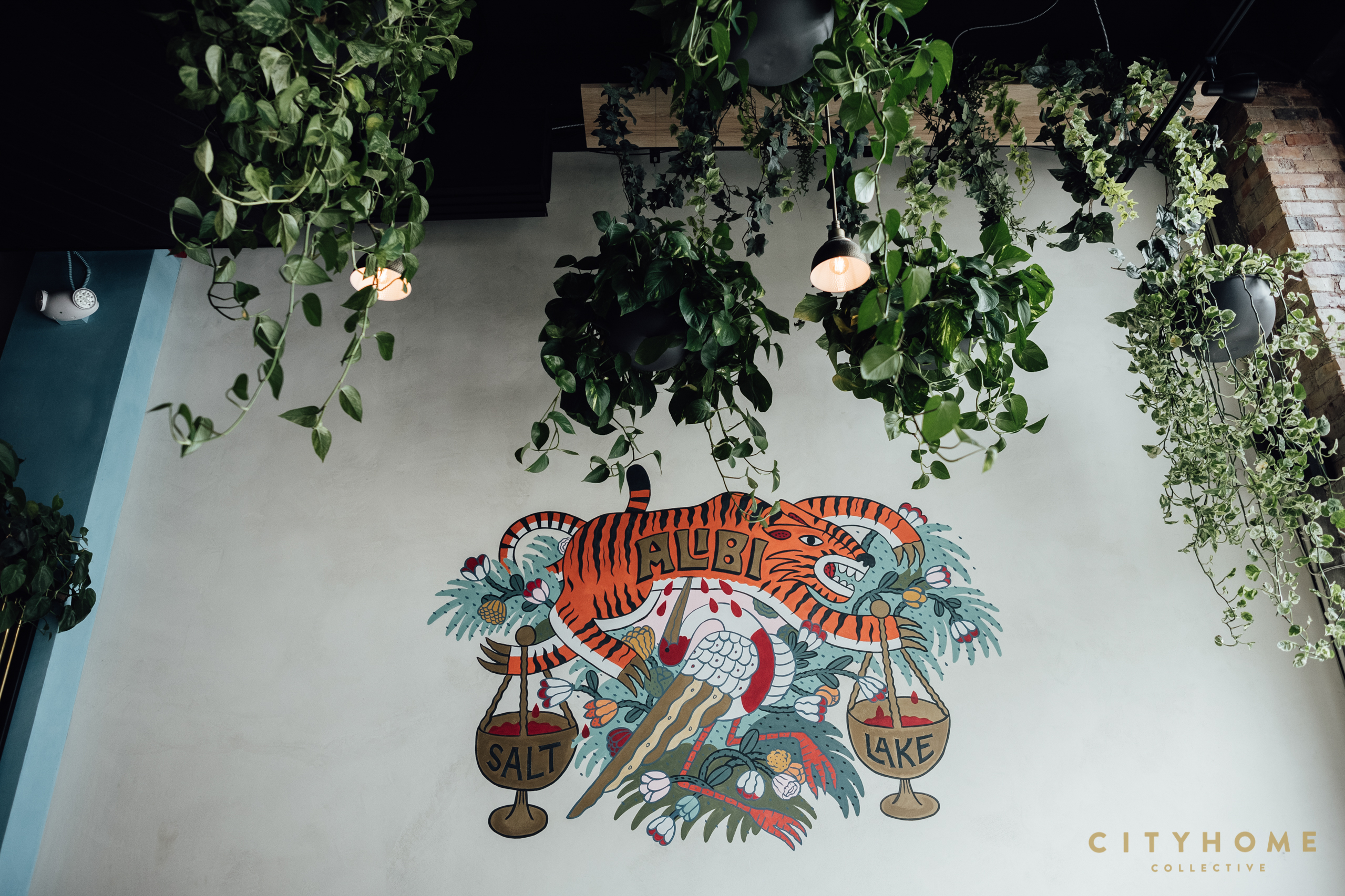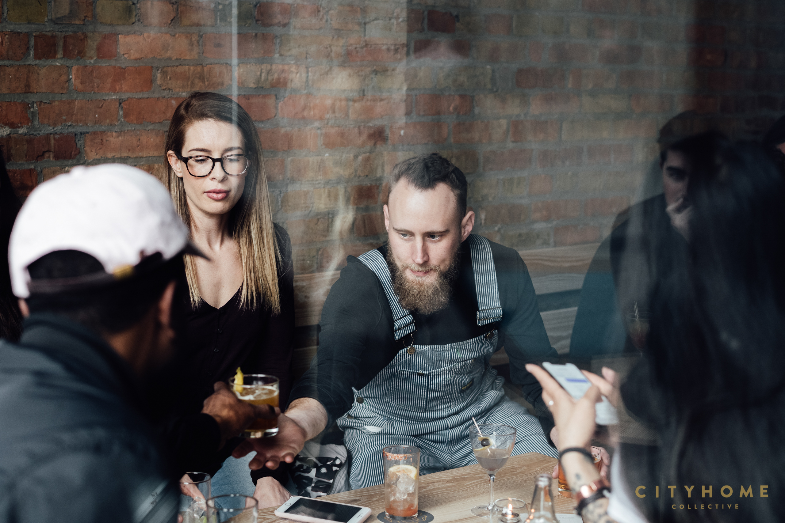 It doesn’t take much of an airtight excuse to get us in to Alibi. It’s the ideal trifecta of amazing cocktails, engaging design, and primo location that are a solid bet in our books. Lots of natural light if you want it, or cozy corners for snuggling equally abound. Clean lines mellowed and enhanced by the stellar mural by Dan Christofferson (a COLLECTIVE fav), who along with finish carpenter Oliver Lewis was given free reign with the bar design and aesthetic. The finished product reads as layered, urban, comfortable, and funky.
