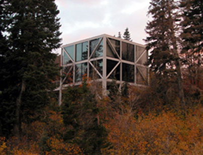 "It's one of the best examples of John Sugden’s work, and his lineage working under the master Mies Van der Rohe. The steel and glass cube sits on a forested mountainside, an object placed within its landscape context." (Photo courtesy of utahcfa.org)
