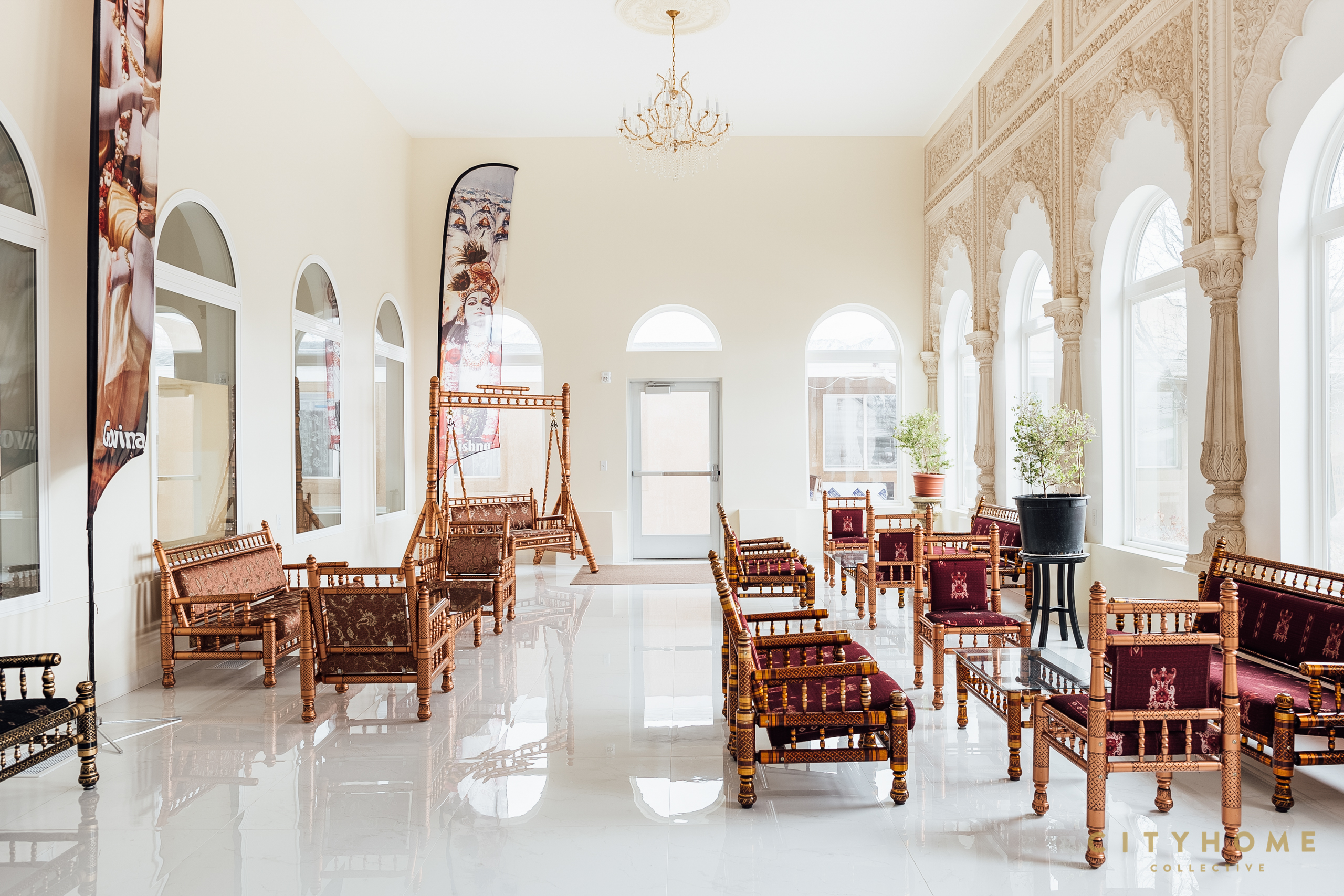 “The deities face east, in the center, the place of Brahmasthana (center of stillness). The main dome covers the deities, other domes are decorative in the Rajput style,” Vai explains. Vaulted ceilings of the spacious reception hall provide open meeting space and free light passage to the temple room or charming boutique, lavishly laced with colorful garments, mindful books, and quintessential sanctuary needs.