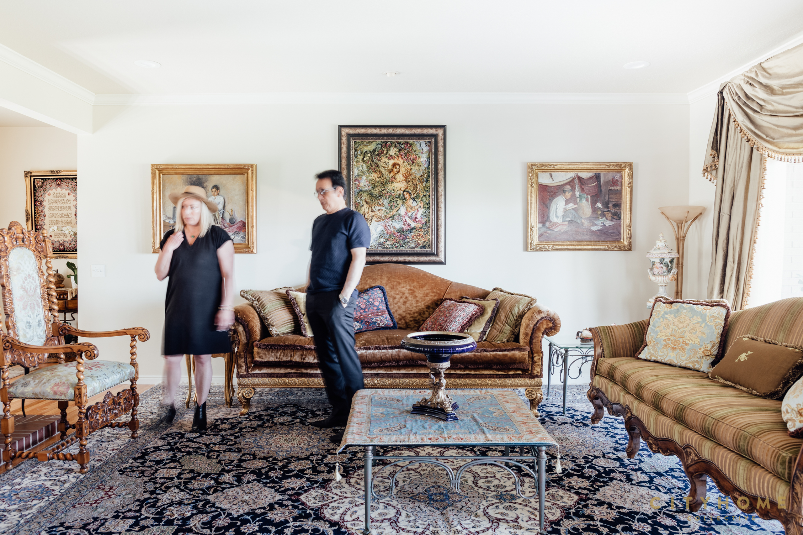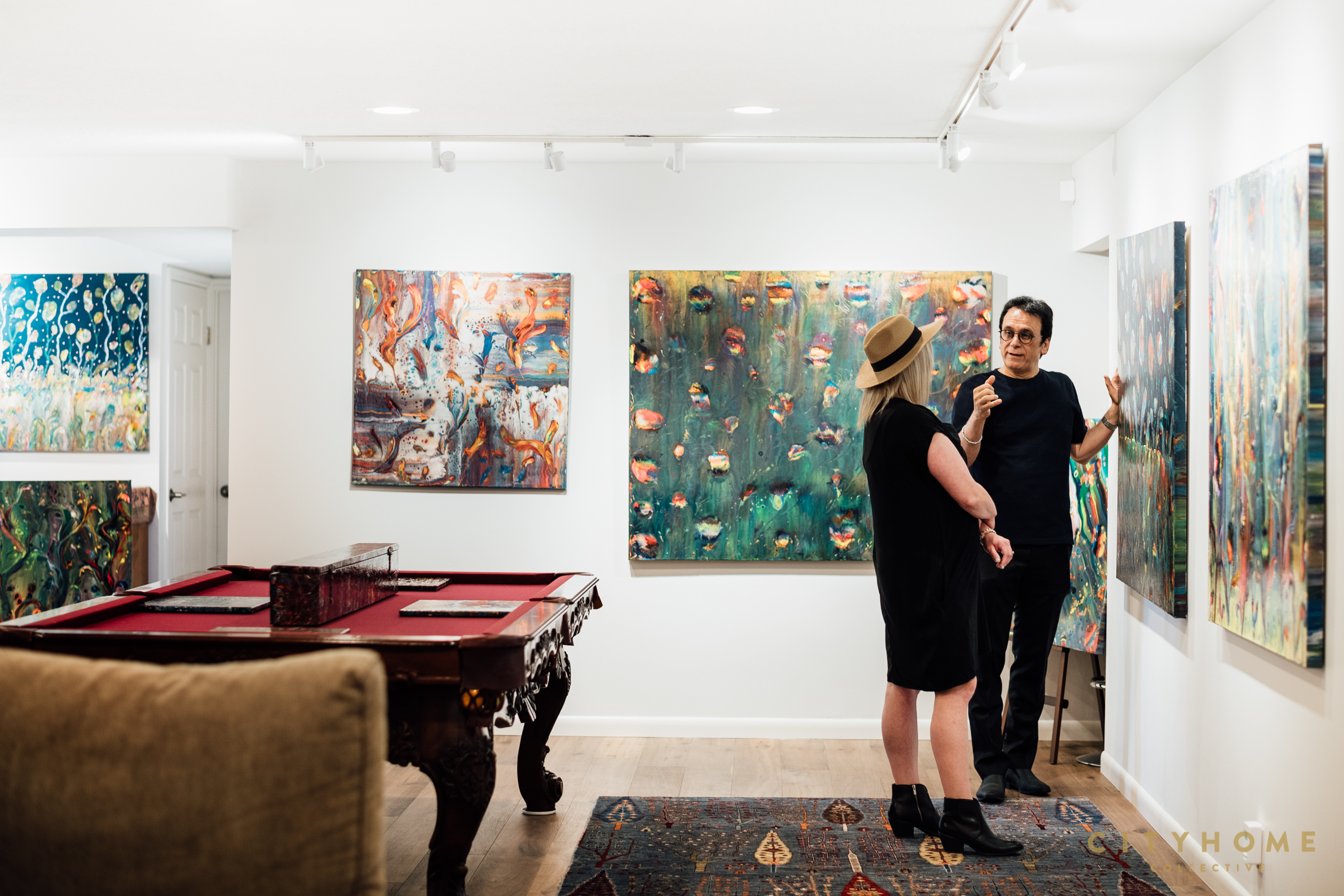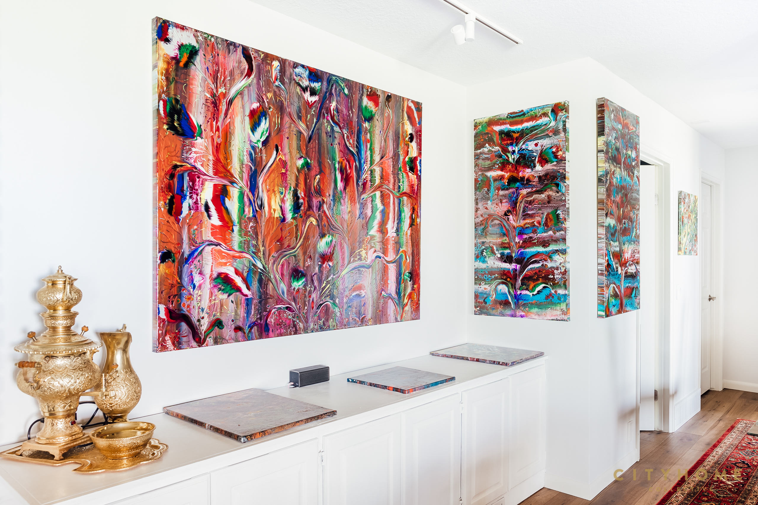 In recent months, Dr. Adib and his wife, Maryam, have slowly been working to remodel their spacious Olympus Cove home. There’s a welcoming vibe, to say the least—a space wherein you feel perfectly at home, but curious to know more about and discuss each piece. It’s a mixture of contemporary and traditional components—his own works punctuate the rooms, juxtaposed perfectly by traditional rugs and warm details. Says Hamid,