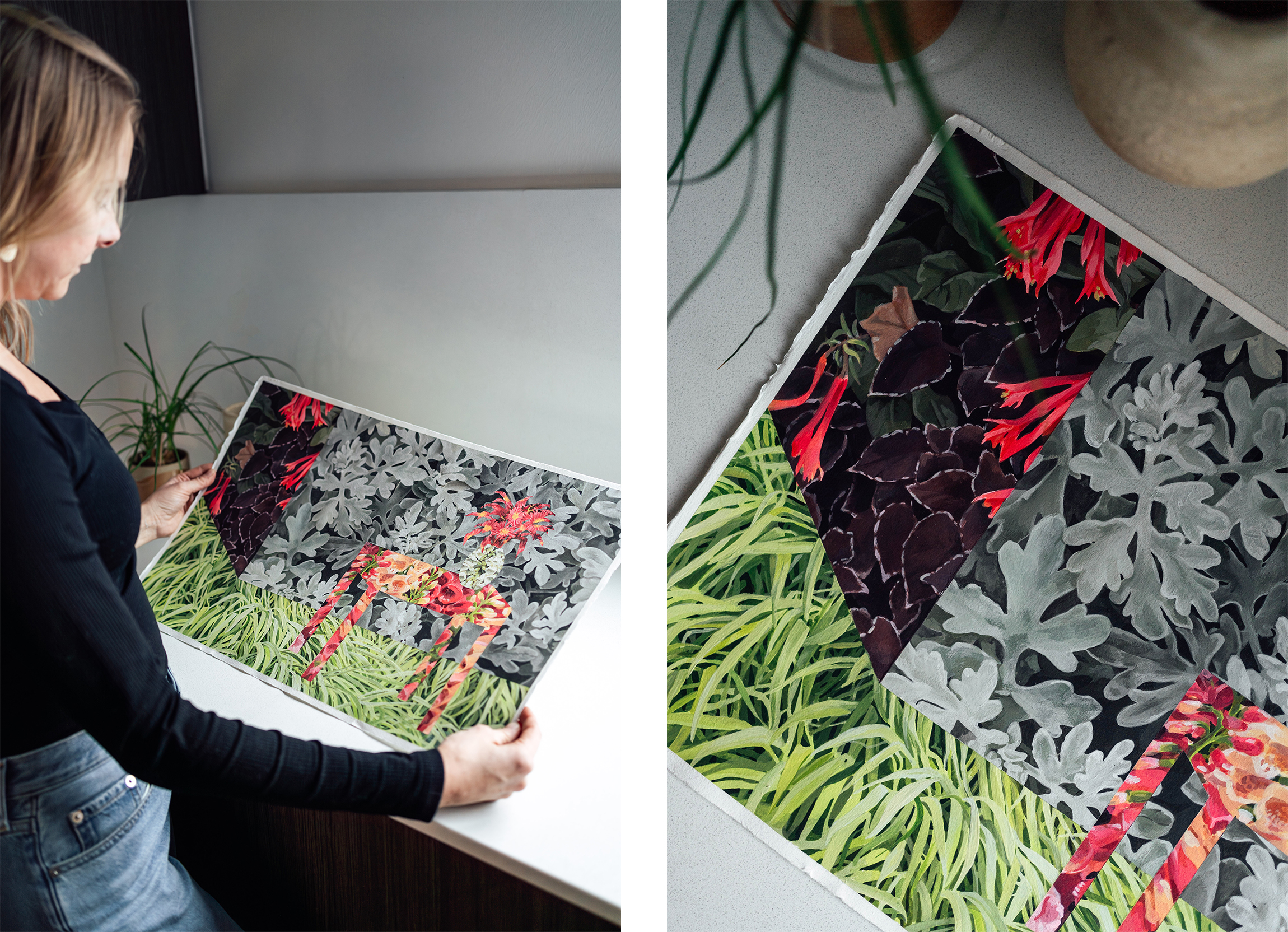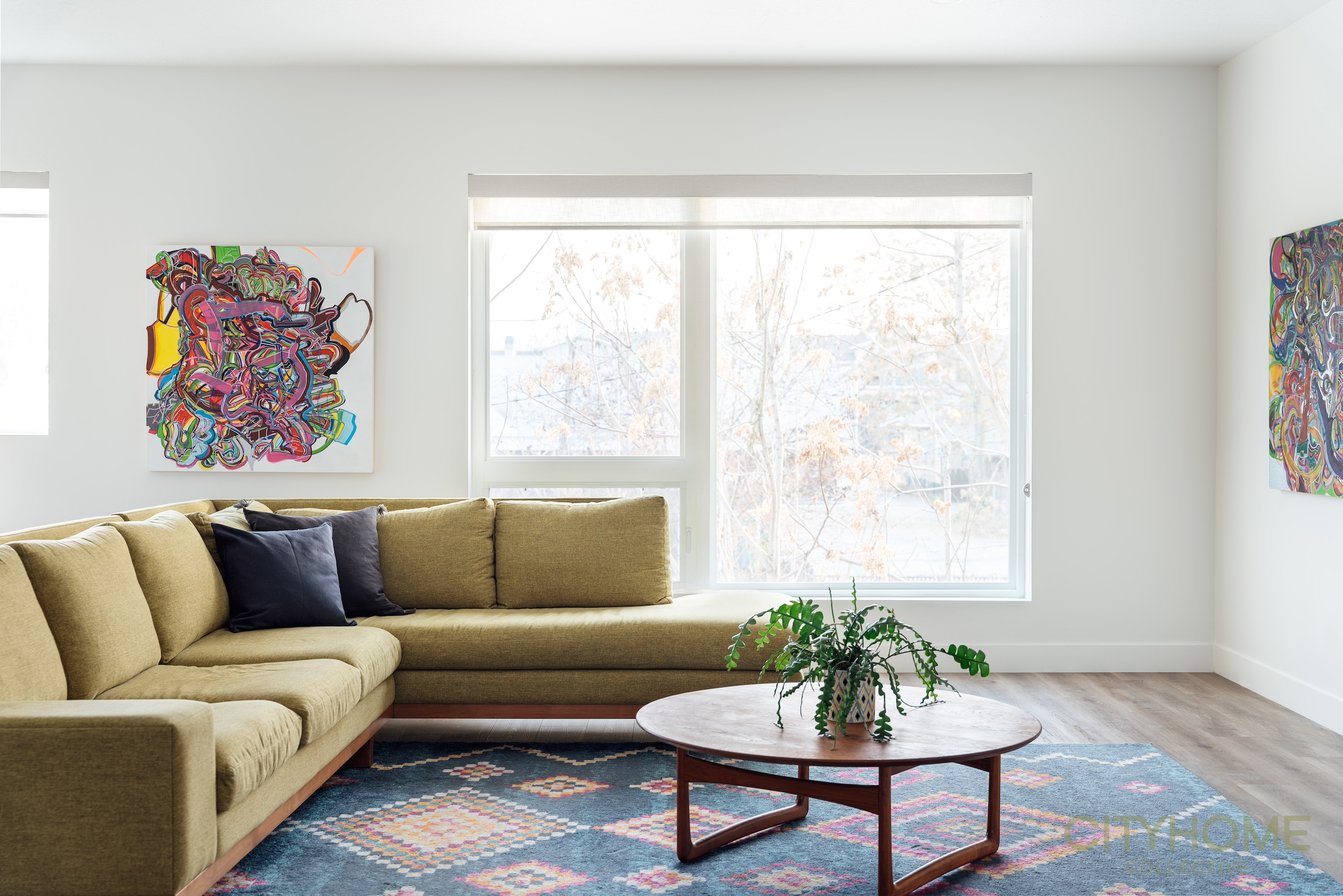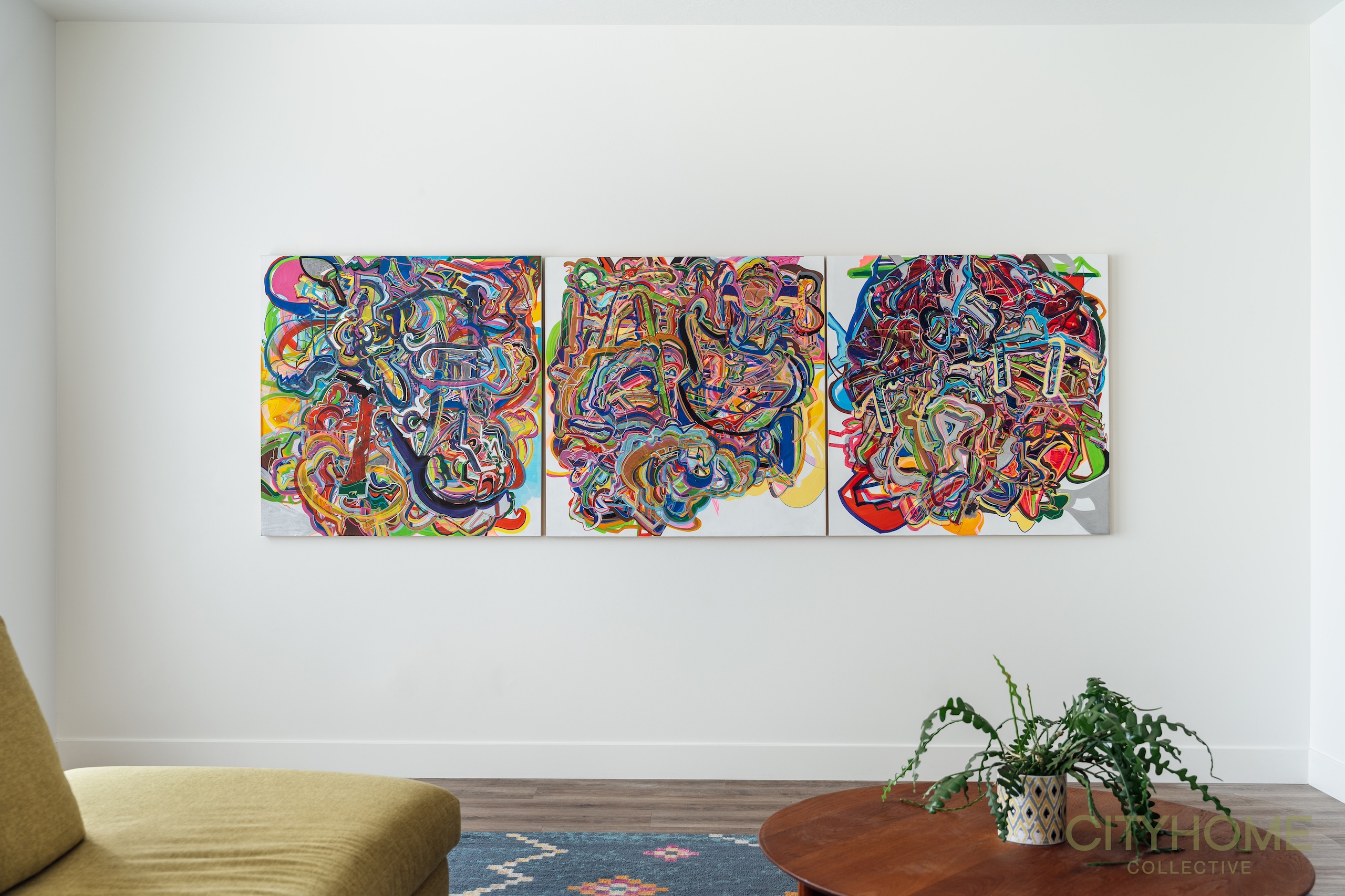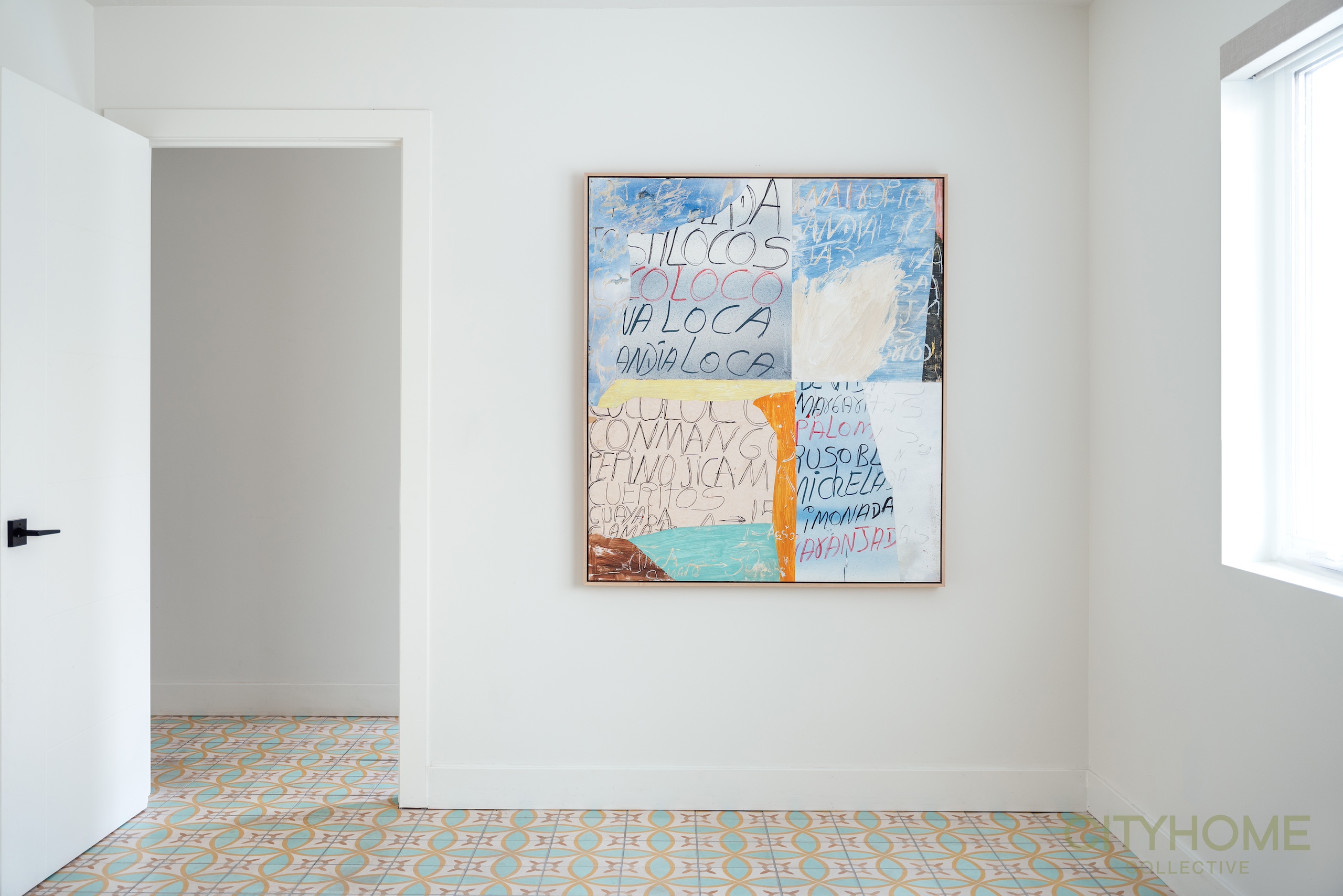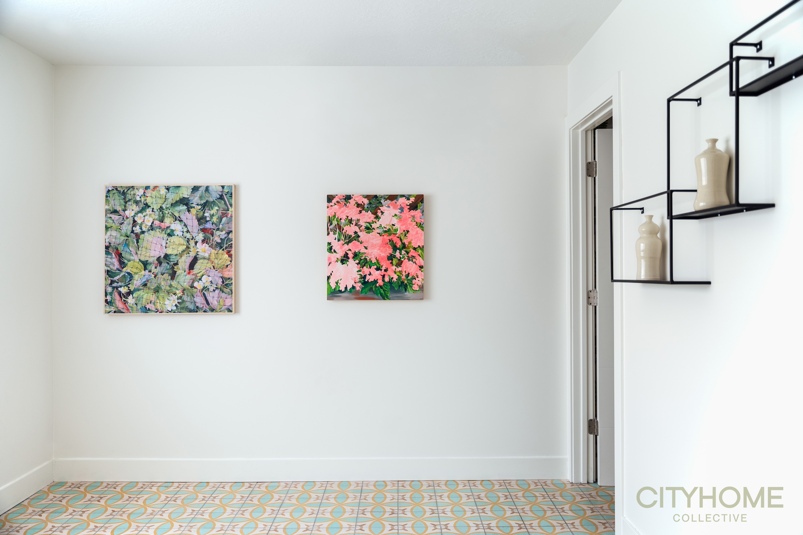 Ready for its next owner, my current modern townhome listing is a blank canvas, one that’s been primed with splashes of color and pattern. Personal accents like Mexican tile and wallpapered rooms give this property an exciting edge, while its expansive white walls and open layout allow prospective buyers to easily imagine their own life and style in the space. It’s the perfect environment for original art, and I’m grateful that my clients have allowed me to temporarily transform their home into a living gallery.