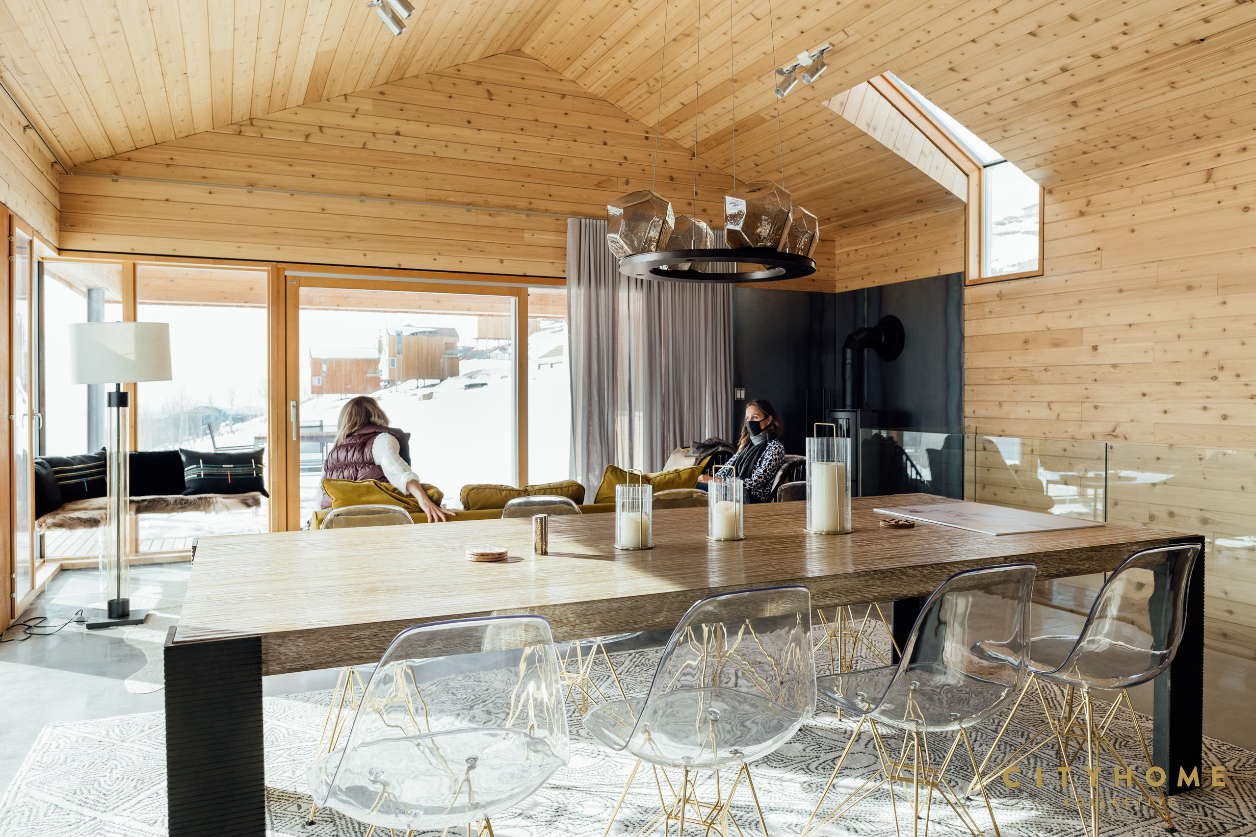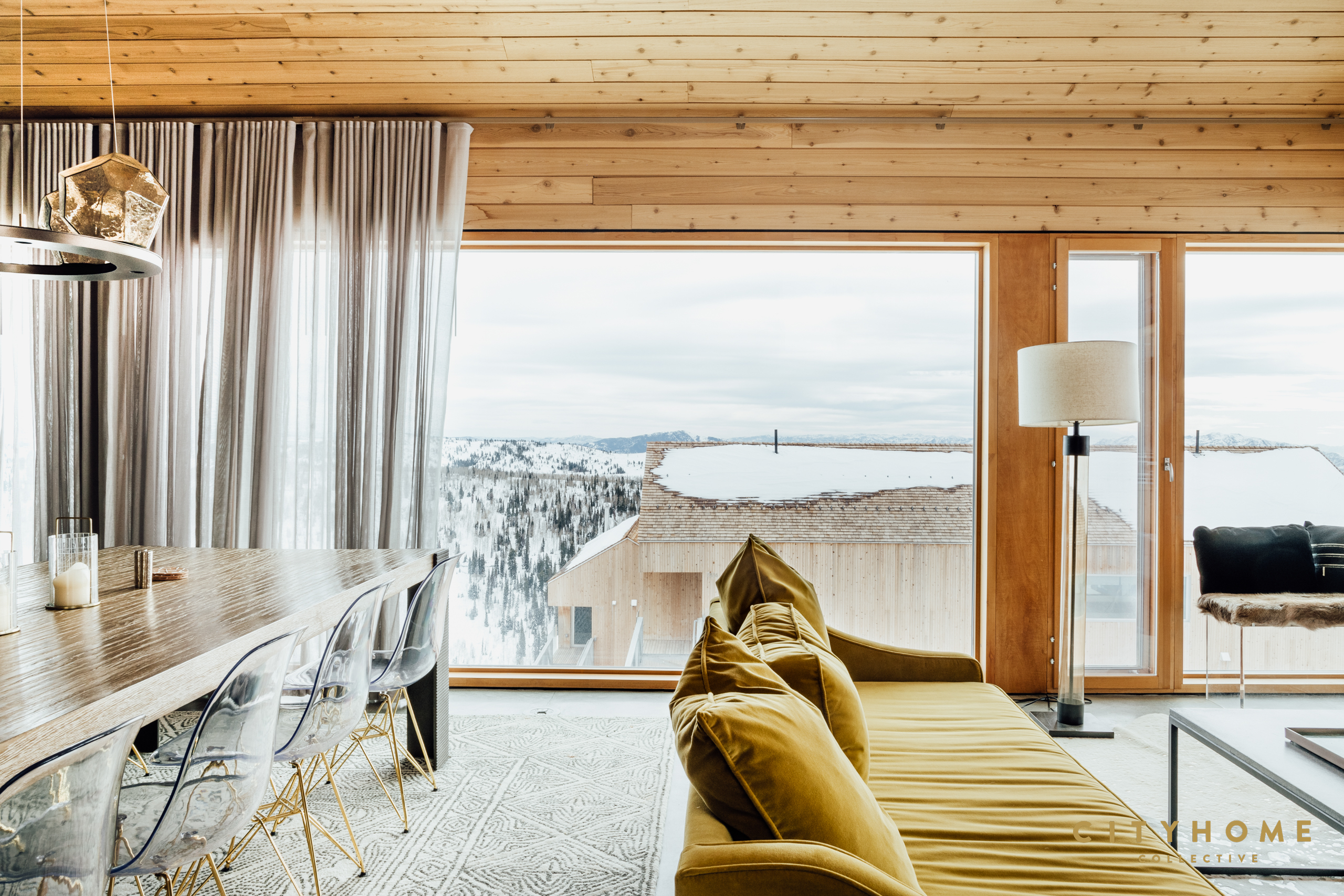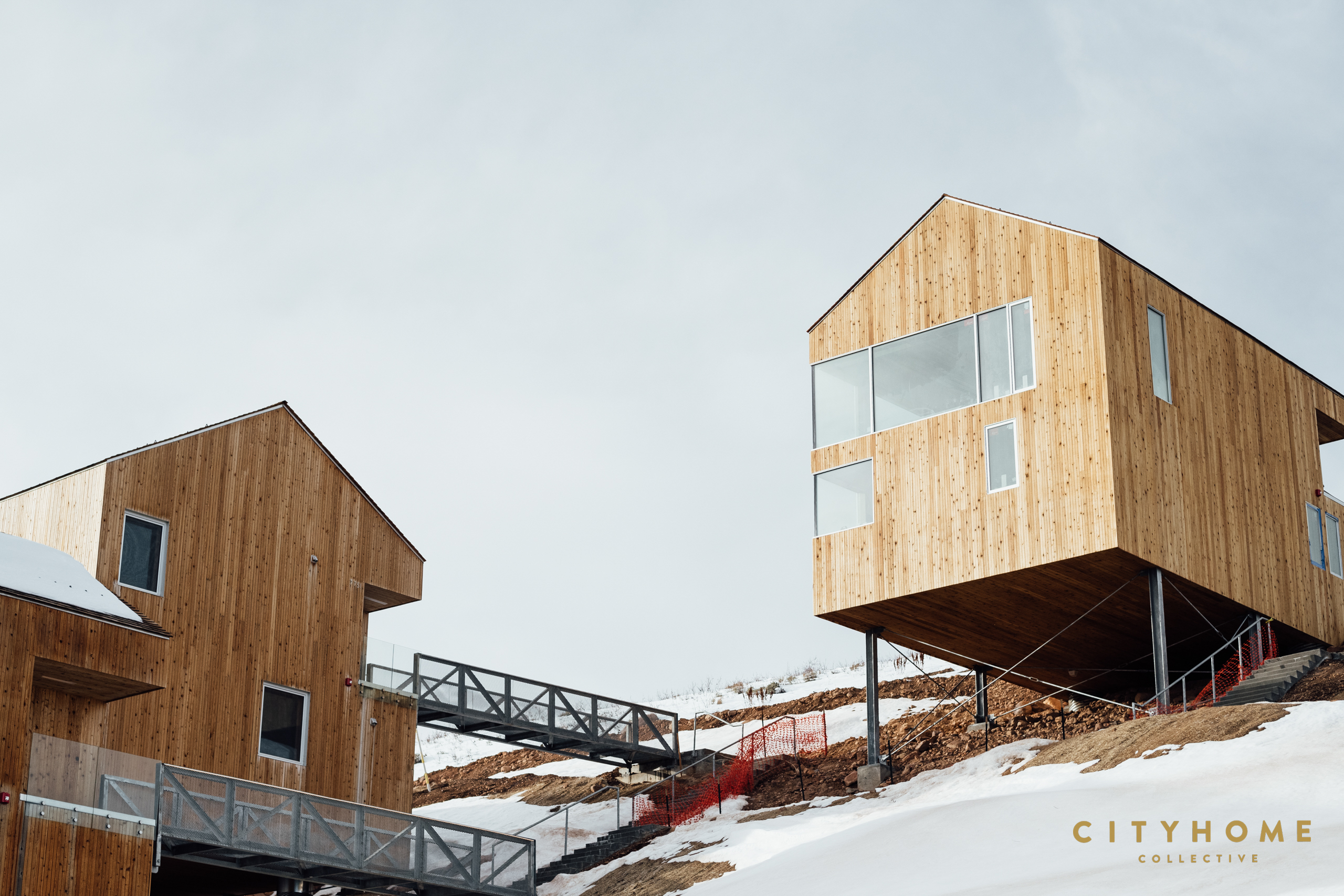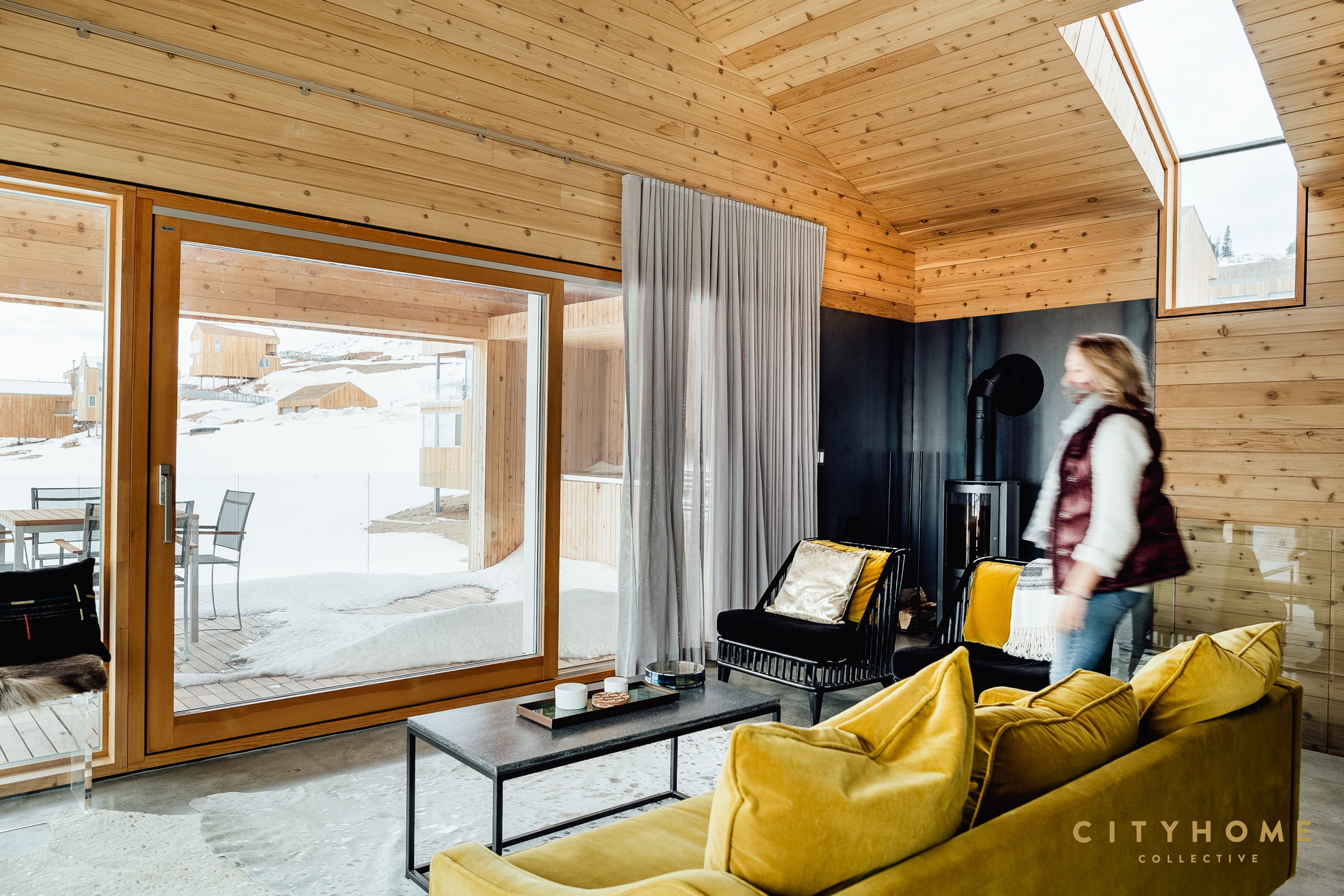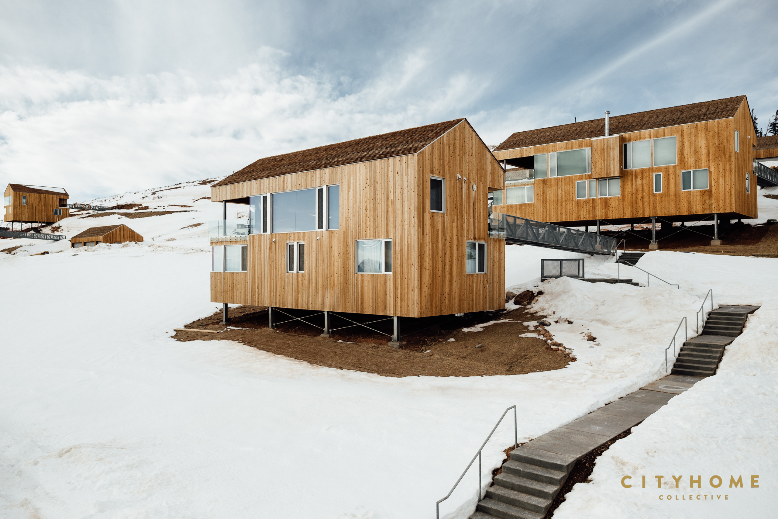 Understated but still inviting, these cabins are designed to sit in harmony with their natural surroundings, both aesthetically and ecologically. Sat atop the snowfall on lightweight steel stilts, the structures are kept warm through a sustainable combination of thermal mass concrete floors and hydronic radiant floor heating. The covered balcony and abundance of windows, meanwhile, offer easy visual access to the striking landscape in which the neighborhood is located, and the furnishings and finishes are comfortable, well-culled, and unfussy.