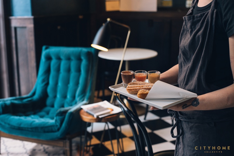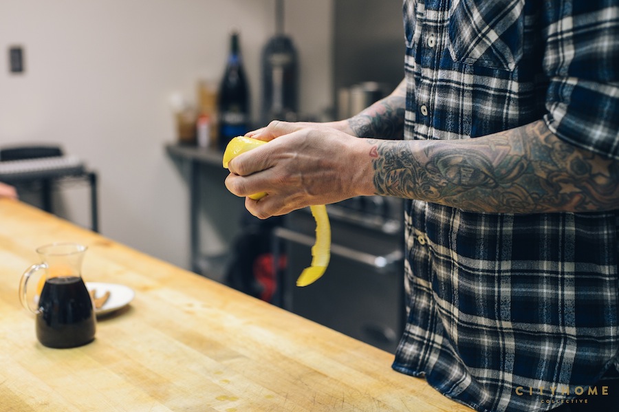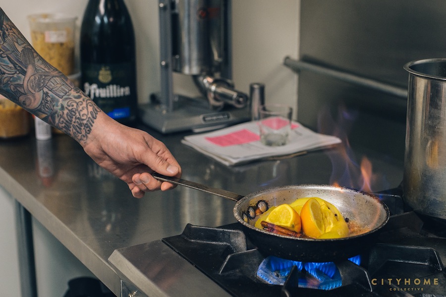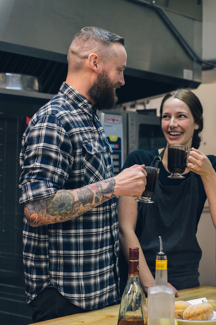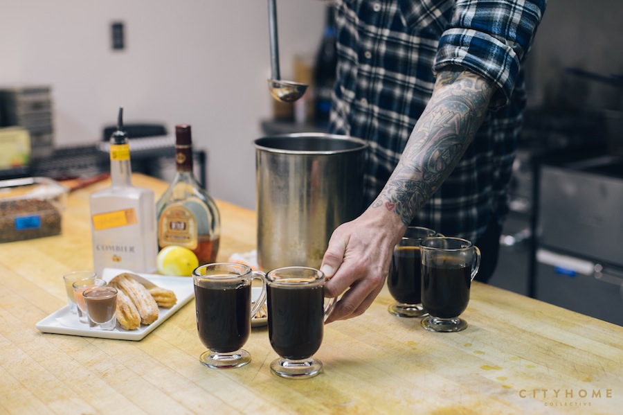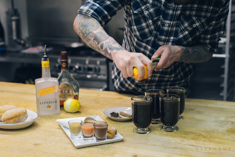 We recently met up with one of Finca’s most handy/handsome bartenders, Jonny Bonner, and Finca/Pago’s diva of desserts, Pastry Chef Courtney McDowell to experiment with crafting Café Brûlot in Finca’s brand-spankin’-new pastry kitchen [Utah law, for better or worse, does not allow open flames a the bar, flambéed, poured or otherwise. Goddamn killjoys.] The pair just got back from their own romantic trip to New Orleans where they enthusiastically ate and drank their way through the city and then got engaged. Aww. Amazingly, we still needed a lighter to flambé the drink, since it didn’t just spontaneously combust from their combined hawtness. #mrow The raw materials for a fab cup of flaming joy were readily available behind the bar at Finca and the coffee portion of the recipe sourced right across the dining room in the sunny and chic La Barba Coffee Shop [run by our fabulously hirsute friends, the guys formerly known as Charming Beard Coffee Roasters, now La Barba available err’where]. Although beignets aren’t on the menu at La Barba—hello, Finca’s a Spanish tapas place, not Creole—we gladly slurped down our Café Brûlot alongside perfect churros made-to-order by Courtney served with three dipping sauces [rich chocolate, dulce le leche, and guava, oh my!], and delightful Spanish puffed fried donut-like pastries called Xuixos, which are filled with [fuck yeah!] a silky orange pastry cream that will haunt your dreams. Fortunately for we high-west desert dwellers, you can sample the delights of Café Brûlot right in your own home. No need for pre-emptive Sharpie’d name tags. But keep the fire extinguisher handy, just in case.