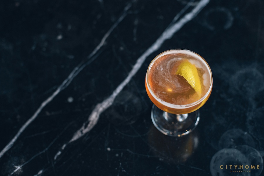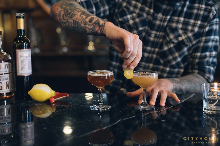 Jonny’s Martinez [Barman Jonny Bonner’s Martinez of choice, and our group favorite of the day. “Gin forward, rich and woody via vermouth, and just enough sweet and citrus for roundness.”]: Start with 2 oz. Beehive Barrel Reserve Gin, 1 oz. Punt e Mes, a bar spoon of Luxardo maraschino, and 2 dashes Boker’s bitters. Stir with ice. Strain into chilled coupe, and twist lemon peel over cocktail [discard garnish].