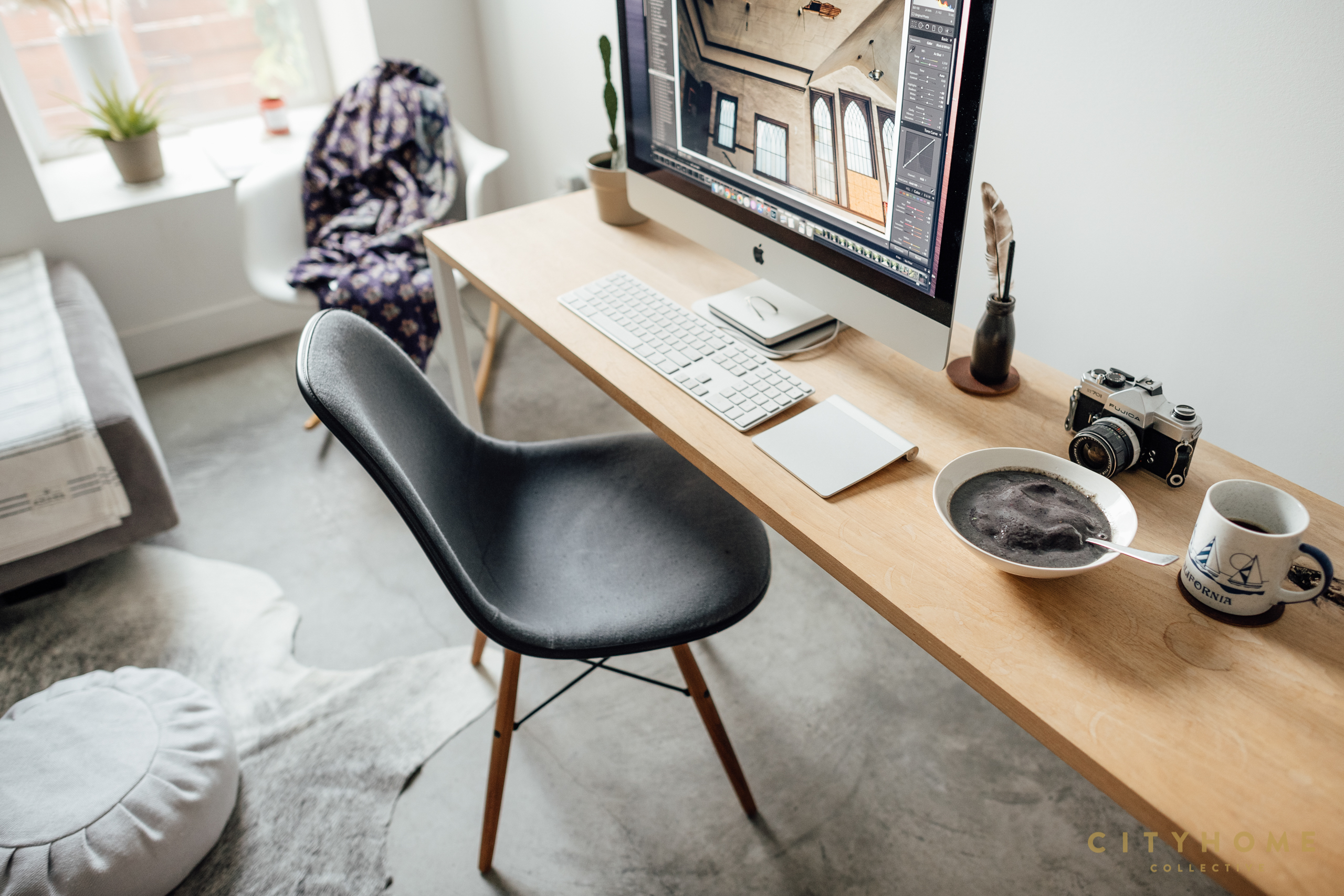 Our photographer, Kerri Fukui, was the perfect person in said COLLECTIVE to launch this series, with tools at the ready to photograph her own space (check out more via her Instagram @japanese_hair_farmer). With tripod and camera timer at the ready, Kerri captured a typical day in her open, loft-like pad, a former small grocery store in Rose Park. cityhomeCOLLECTIVE founder, Cody Derrick, sat down with Kerri via a video call to dial in on the details of life in the store.