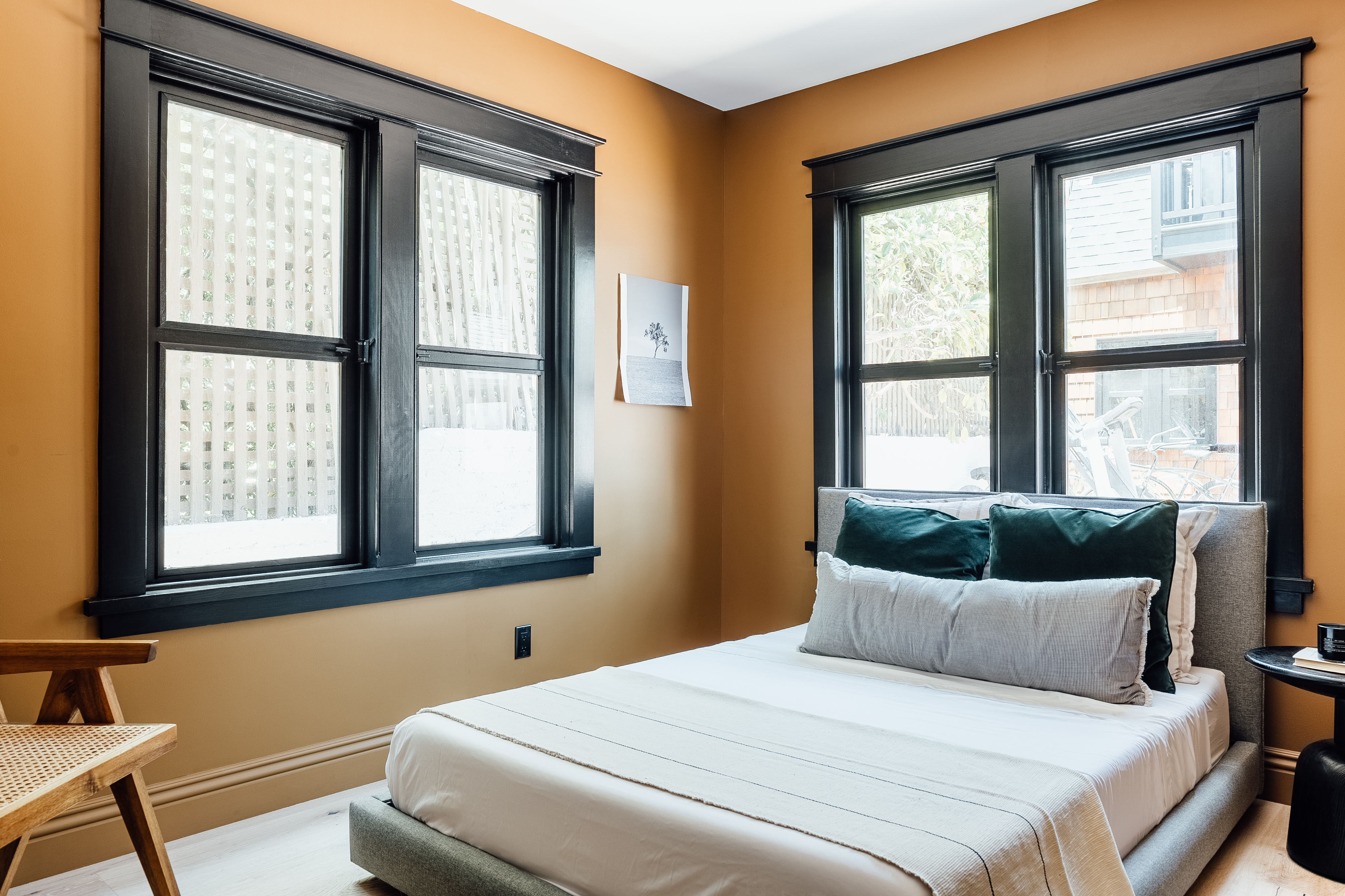 Inspired by the desert sunset, this cheery nutmeg hue will brighten up any room. It's bold, yes...but when used with a black molding, crisp white ceiling, and neutral floor, it adds the perfect pop of color. We managed to add some character to this guest room without having to spend a lot on decor. View the full project here.