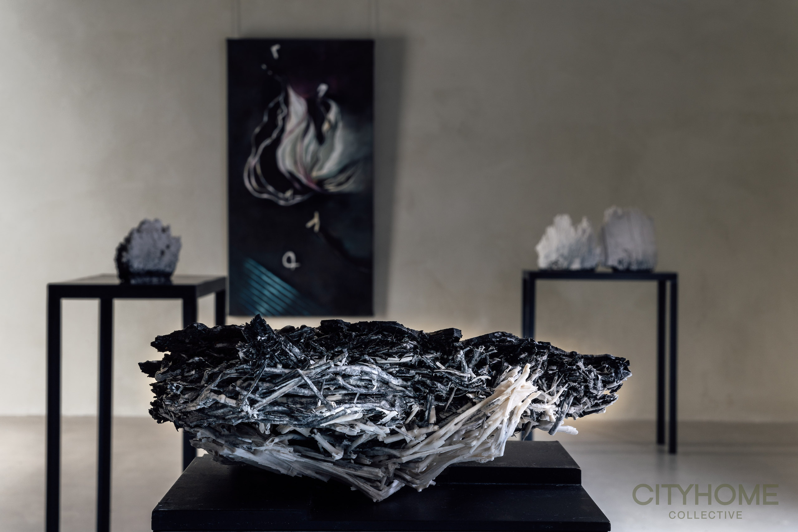 Rooted in the earth element with Colour’s porcelain and ink sculptures, the exhibition is expanded by Emily’s abstract paintings that are inspired by cosmology and the vastness of the universe. It is a striking, yet meditative show that allows us to consider the connections between this world and the next, and our place within it all.
