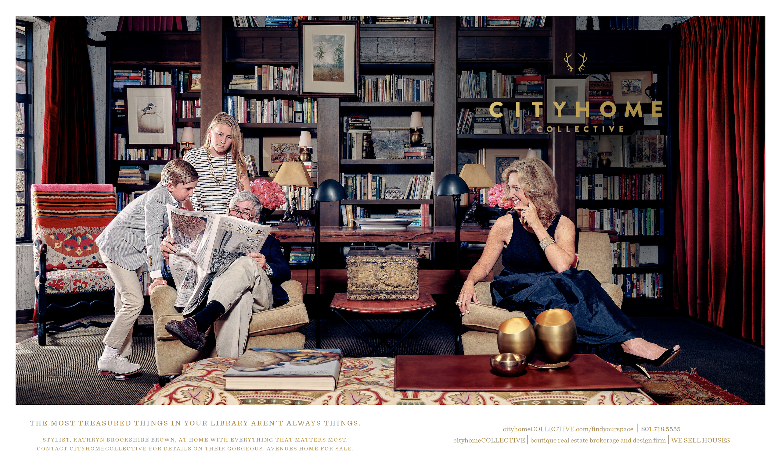 Harriet and Wyly (the young ones dressed to the proverbial nines) were as respectful and cooperative as they were photogenic, and Kathyrn and husband Denis made quick work of on-camera magic. As ever, George Oakley stood behind the camera for the ad and did that thing he does so well, and our fave COLLECTIVE photog, Kerri Fukui, snapped the stellar behind-the-secenes images you see below. The final product? Well, you can sneak a peek at the very bottom, or just grab your copy of the Utah Style & Design summer issue.