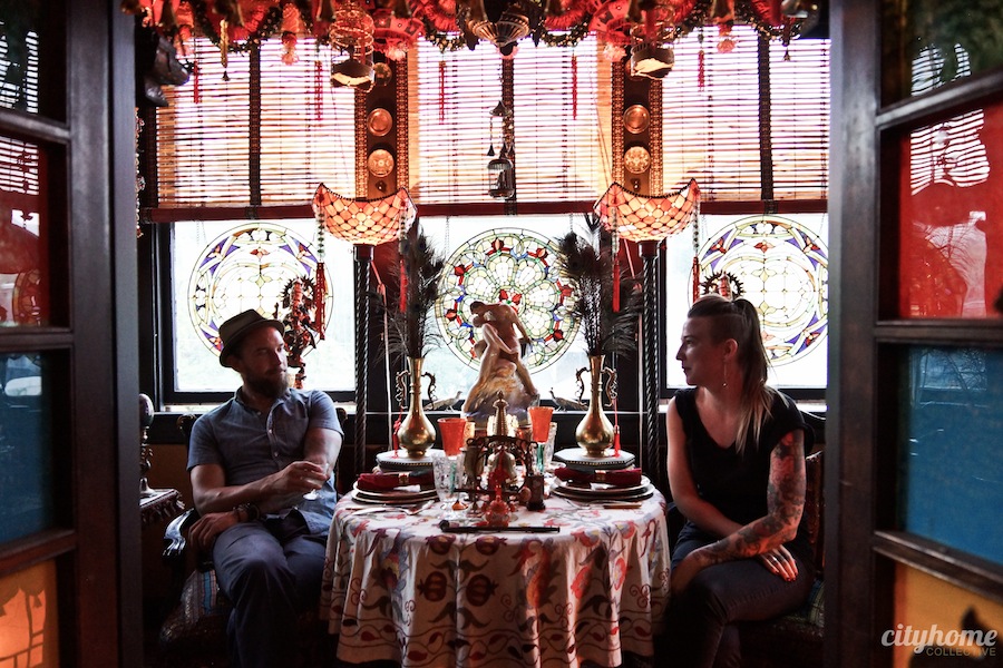 While in Marc’s Maryland flat [just across the hall from Cody Derrick’s humble abode] it’s difficult to remember that one is in Salt Lake City: champagne chills in almost every nook and cranny, incense idles from room to room, 60s rock 'n' roll of the Orient wobbles perfectly from a pair of hidden speakers, and the kitchen is only discernible from an artfully hidden sink. Marc Anthony's dining room--which we oh-so-wisely chose for the final ad--is a gallery of sorts highlighting primarily Chinese cloisonné and Japanese Champleve enamel. For us, this room was absolutely bursting with rich, colorful magnetism, so it's no surprise that our subject came to life in here. It's a definite departure from our previous, bright 'n' tidy choices, and that's precisely what we loved about it. The lavish reds, the dreamy blues, tapestries upon tapestries and all that gold...we swooned.