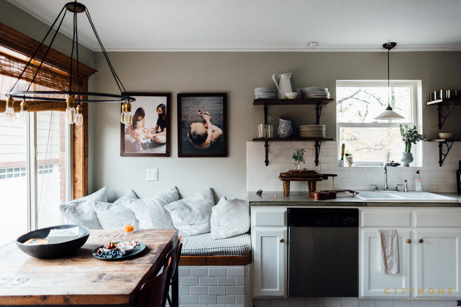 The kitchen benches (that open and have room for storage beneath them) were in the kitchen when we bought our house. I think it was a genius use of what would have been a really awkward spot for a table otherwise. We spend a lot of time sitting on them throughout the day. They are the perfect spot for meals, because you can look out to the back garden while you’re there. We have an abundance of birds that live in the yard, and it is the perfect perch to watch them as you eat/read/daydream. The kitchen is really small, and on the opposite end of the house from the living room and where we have a more formal dining area. So this is the only real hang-out area at that end of the house. Even though it is a tiny space, people always end up congregating there because it is so comfortable. The window there is South facing, so there is a lot of light that comes through it. I particularly love the light in the winter that comes through it. It can be harsh at times, but if it is cold, I like to lay there like a lizard and soak up all the rays that come in.