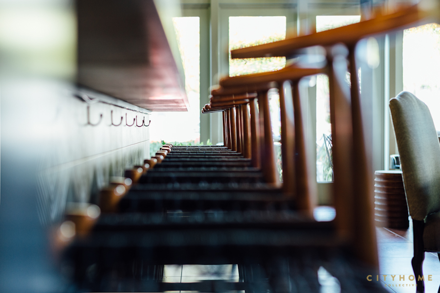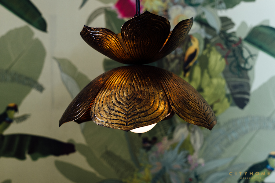 So we decided to utilize a monochromatic palette in order to quiet the noise of varied surfaces and finishes remaining from the previous occupants, but we also wanted to employ some real color. Walls, shelves, and trim were assigned a muted green and became the still canvas on which everything else could be layered. Chairs were reupholstered in varying green velvets and prints, and we added accent lighting throughout (again, in hues of green). The two, large booths at the back of the space were wallpapered–palm leaves and pops of bright flowers, set off by brass lotus pendants–with the excess setting the same, artful tone in the restrooms. And while we kept the original bar, we reinvented it by adding a geometric, patterned tile to the facade and lining it with minimal but warm, woven-seat bar stools. For the exterior, we took an understated approach–deep, rich green and subtle signage.