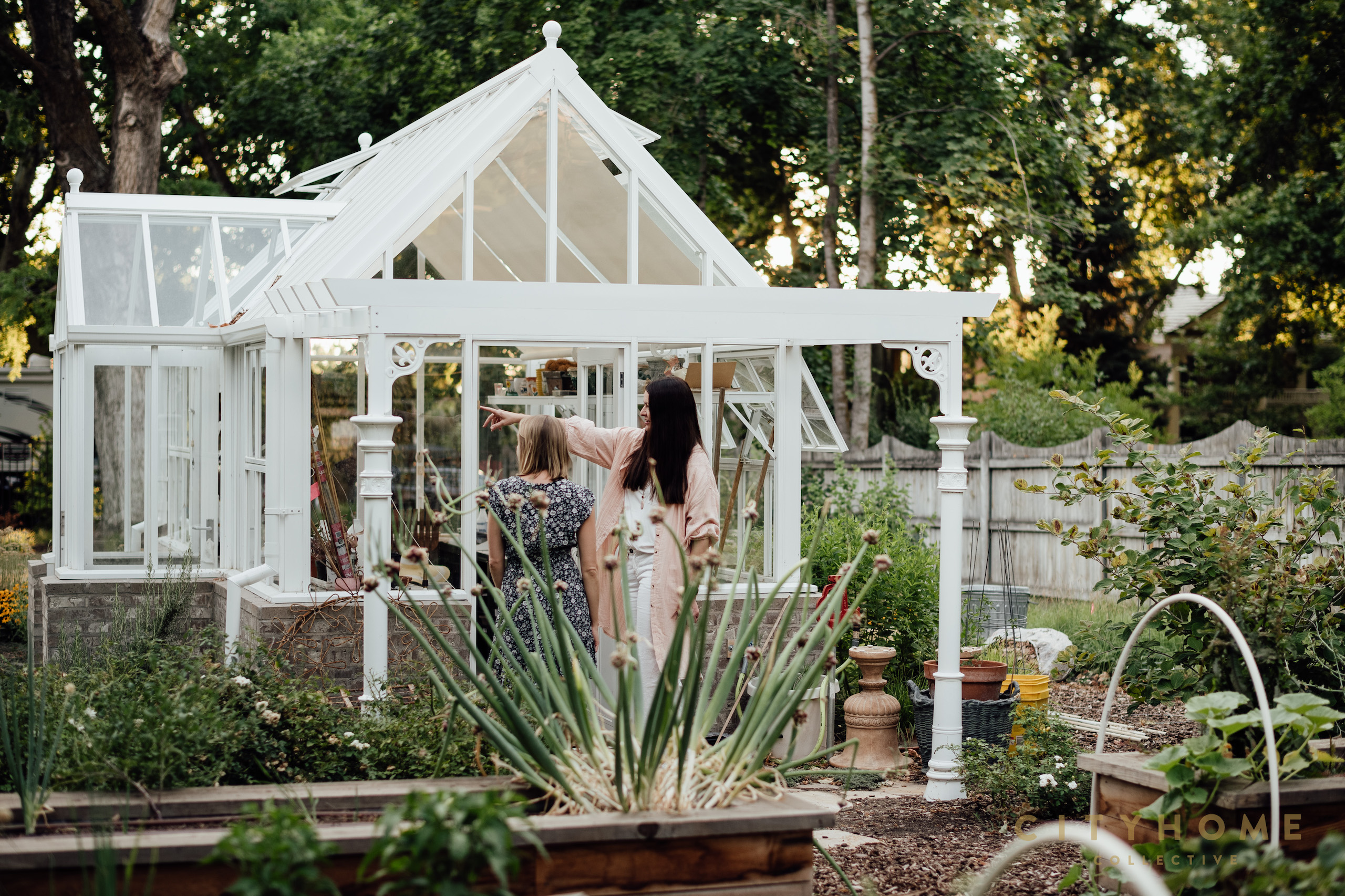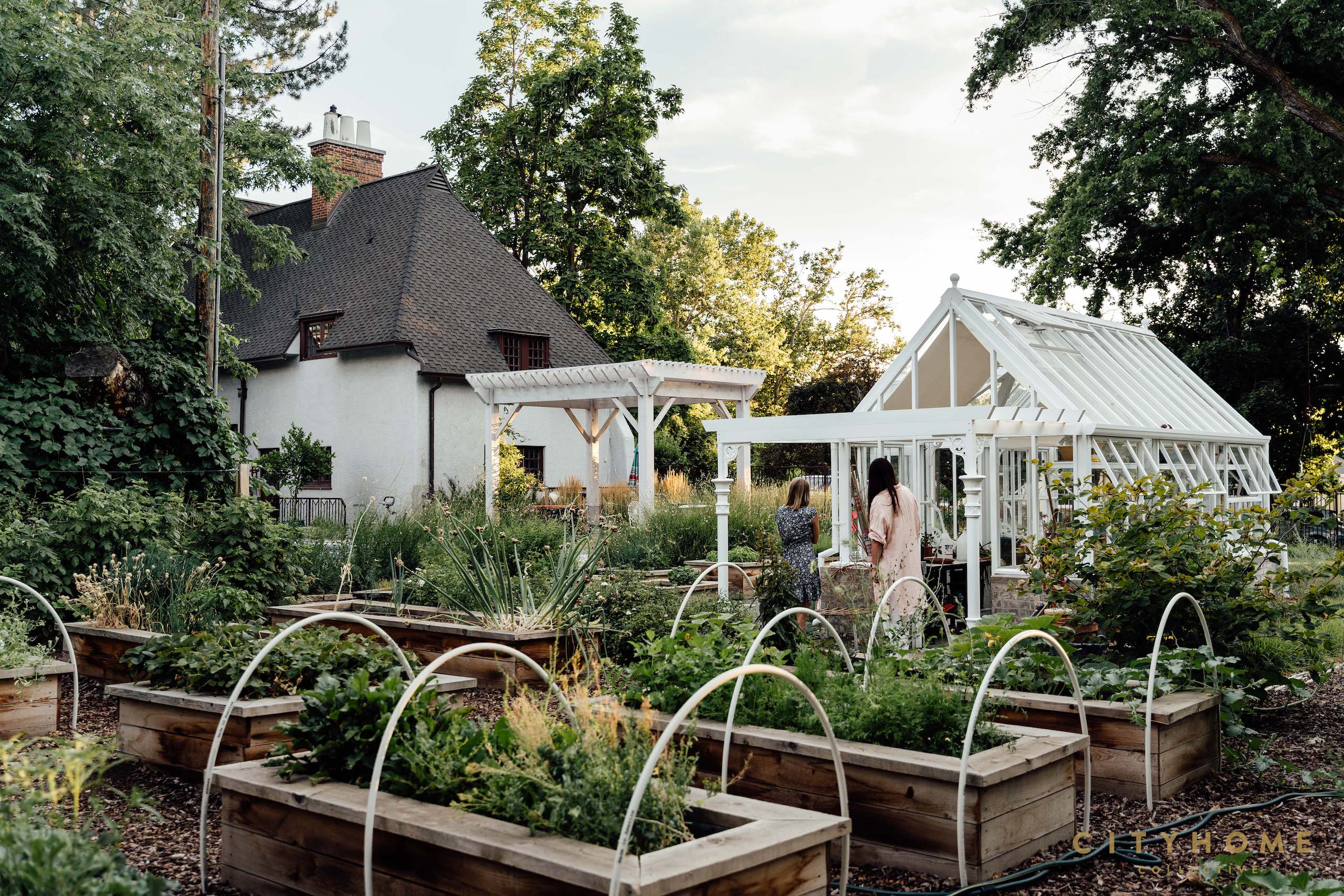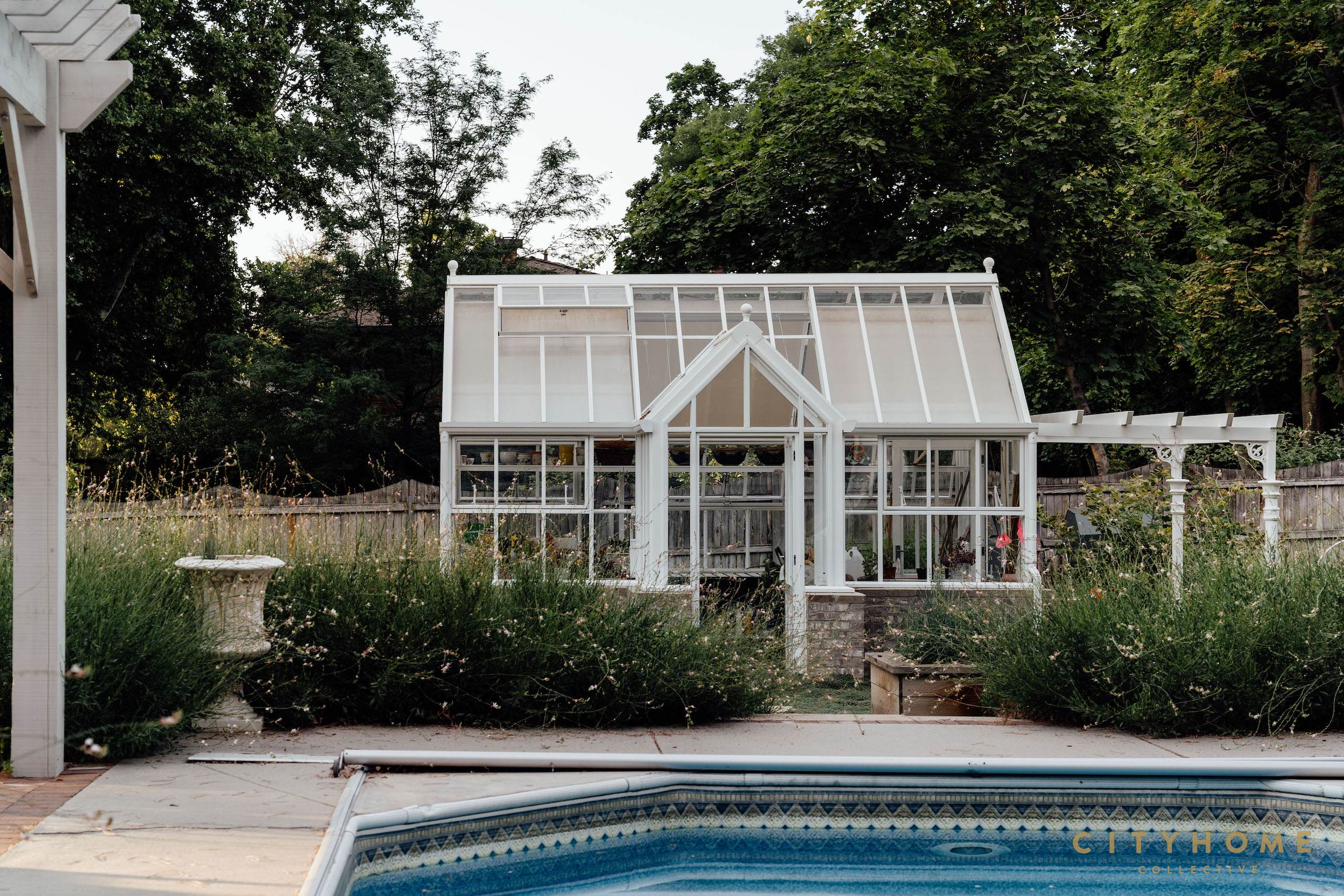 The result: a whimsical, meadow-style front yard with a mix of English and native plants that softly surround a meandering brick walkway – designed by Io with the original bricks. Beyond the iron fence line (also designed by Io, in an Arts & Crafts style) is phase two of the project, which includes a shade garden with fountain, custom vegetable garden boxes, a pergola that frames the pool, and an intentionally placed greenhouse. (Pro tip from Shalae: greenhouses should typically be aligned on an east-west axis for optimal winter sun.)