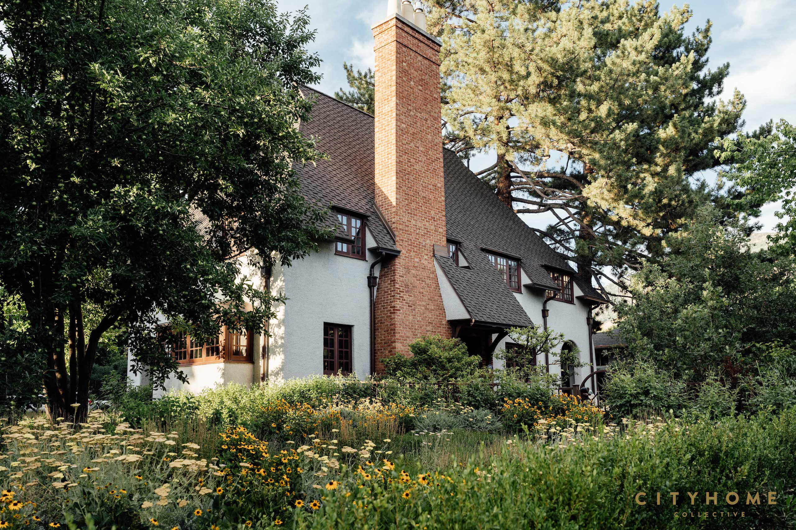 The Healy House, built in 1920, is located in the Eccles Historic District of Ogden. Its Old English (cottage style) architecture is reminiscent of the English Art Nouveau era with a high-pitched roof, stucco exterior, arched entryways and exposed brick chimney. The home has quite the presence as it sits stoically on the corner of Eccles Avenue and 26th Street - when Shalae first visited the home, it was hidden behind giant hedges and a weedy lawn. To revamp the space, the new homeowner enlisted Io for a period-appropriate, yet modern design that was also pollinator and drought friendly.