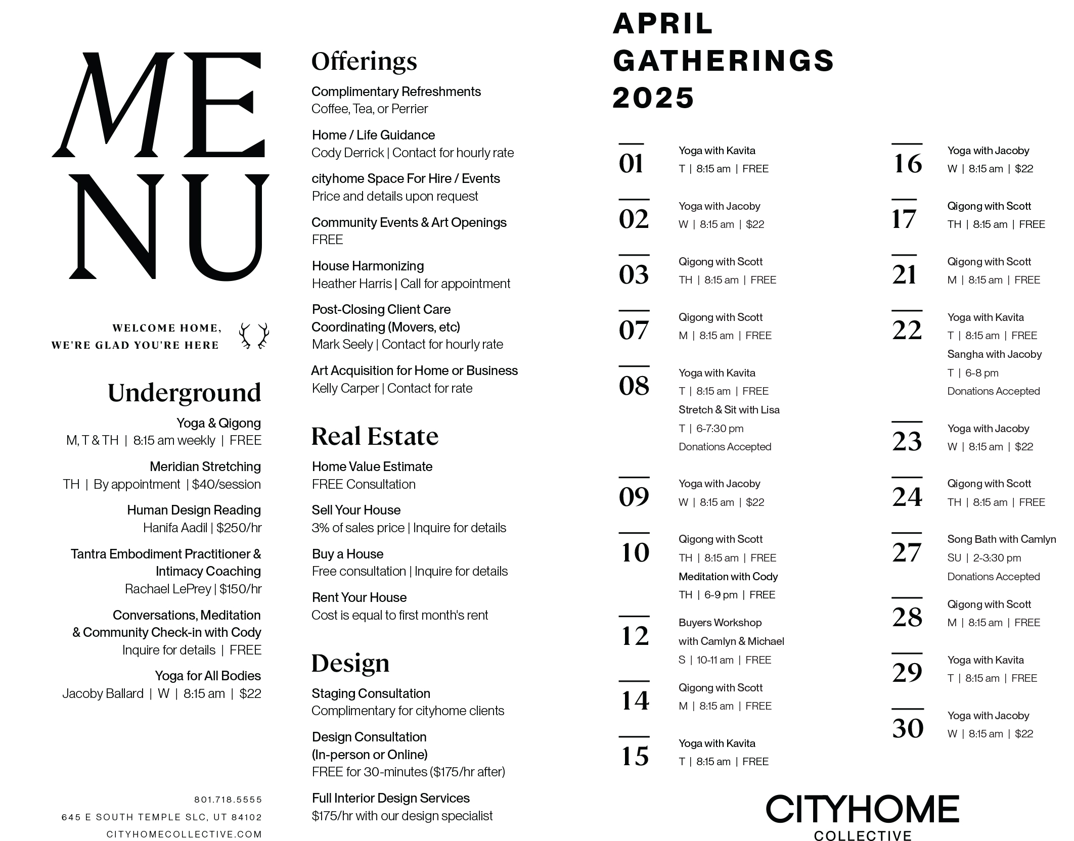 This is why we have been doing our best to point ourselves, our clients and our communities back to the Self. Whether it is embodied movement classes, community meditation groups, house therapy sessions, or first time home buyer classes, we have tended to a holistic approach to real estate, design and good neighbor-ing for almost twenty years. To keep it communal, most of what we offer is spread word of mouth. We have a print menu in our COLLECTIVE homebase that folks can pick up anytime with a current schedule as well as an ever evolving list of services. Stop by and grab one, have a cup of tea or coffee and say hello. Free hugs for the touchers. Warm smiles for everyone. Or check the newsletter at the beginning of each month for a snapshot of what is hot off the press. Spoiler alert. It's us. And we are at your service. Happy April friends. What a beautiful month to be alive in this city, we call 'home'.