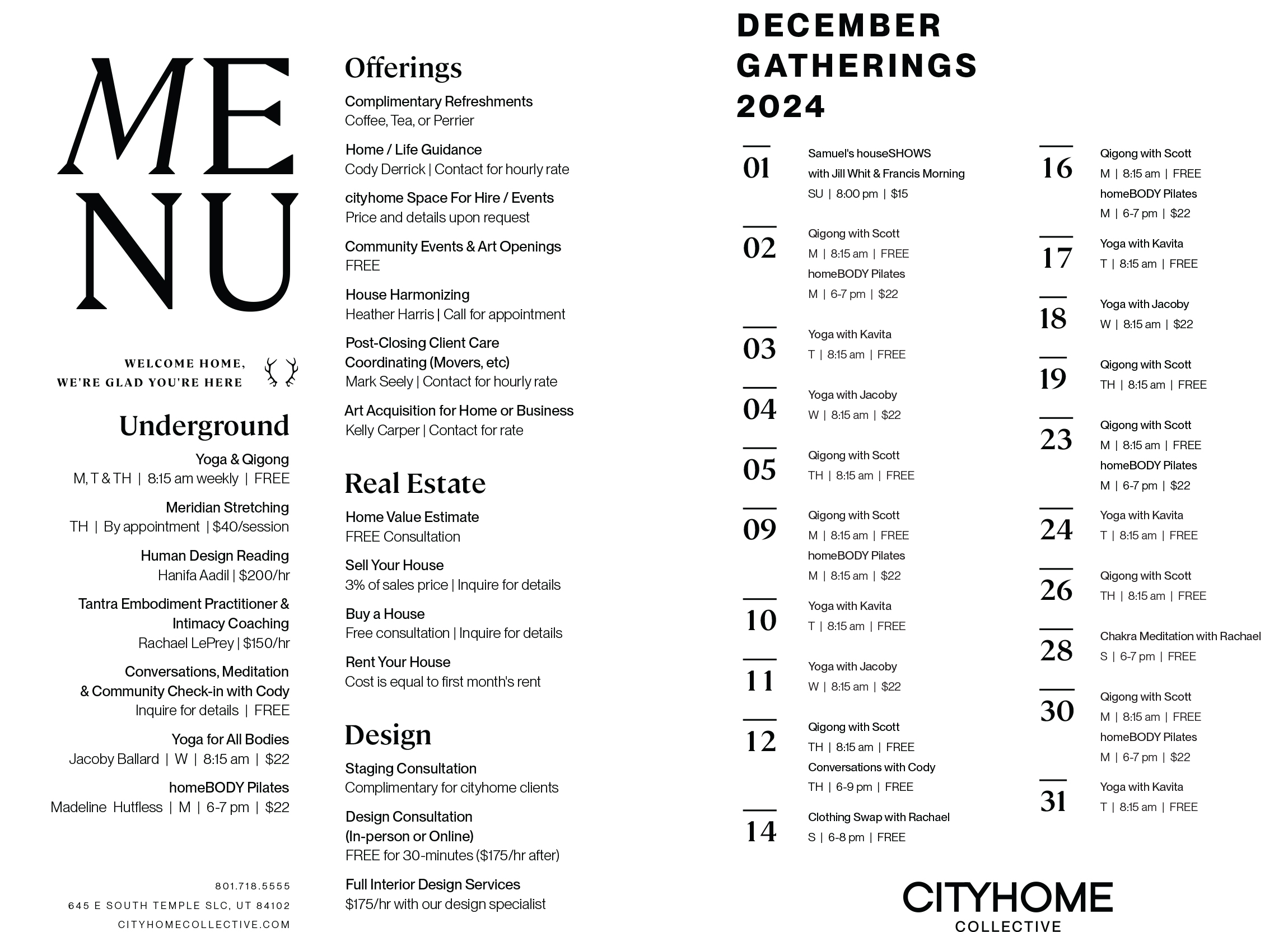 This is why we have been doing our best to point ourselves, our clients and our communities back to the Self. Whether it is embodied movement classes, community meditation groups, house therapy sessions, or first time home buyer classes, we have tended to a holistic approach to real estate, design and good neighbor-ing for almost twenty years. To keep it communal, most of what we offer is spread word of mouth. We have a print menu in our COLLECTIVE homebase that folks can pick up anytime with a current schedule as well as an ever evolving list of services. Stop by and grab one, have a cup of tea or coffee and say hello. Free hugs for the touchers. Warm smiles for everyone. Or check the newsletter at the beginning of each month for a snapshot of what is hot off the press. Spoiler alert. It's us. And we are at your service. Happy December friends. What a beautiful month to be alive in this city, we call 'home'.