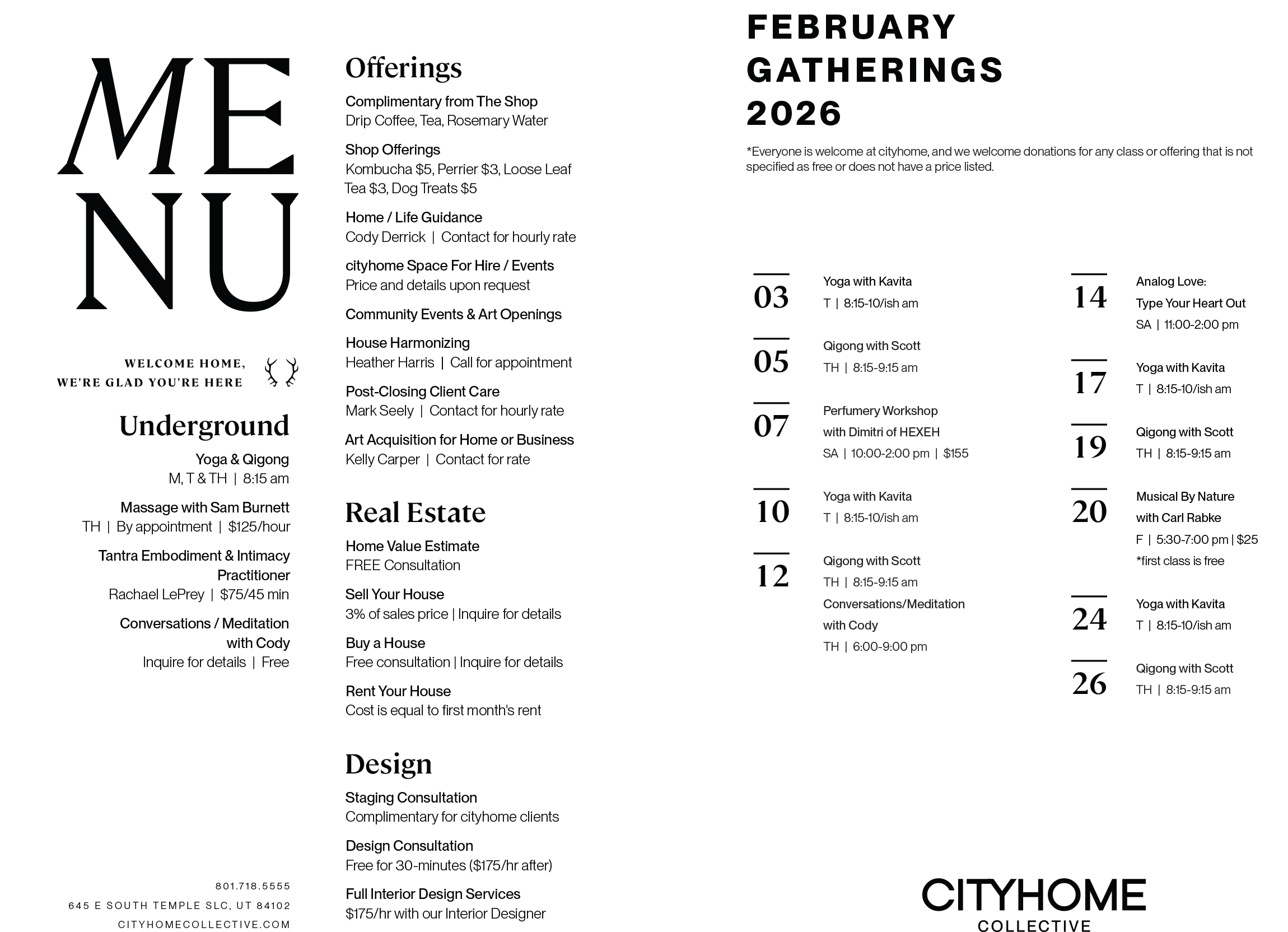This is why we have been doing our best to point ourselves, our clients and our communities back to the Self. Whether it is embodied movement classes, community meditation groups, house therapy sessions, or first time home buyer classes, we have tended to a holistic approach to real estate, design and good neighbor-ing for almost twenty years. To keep it communal, most of what we offer is spread word of mouth. We have a print menu in our COLLECTIVE homebase that folks can pick up anytime with a current schedule as well as an ever evolving list of services. Stop by and grab one, have a cup of tea or coffee and say hello. Free hugs for the touchers. Warm smiles for everyone. Or check the newsletter at the beginning of each month for a snapshot of what is hot off the press. Spoiler alert. It's us. And we are at your service. Happy February friends. What a beautiful month to be alive in this city, we call 'home'.