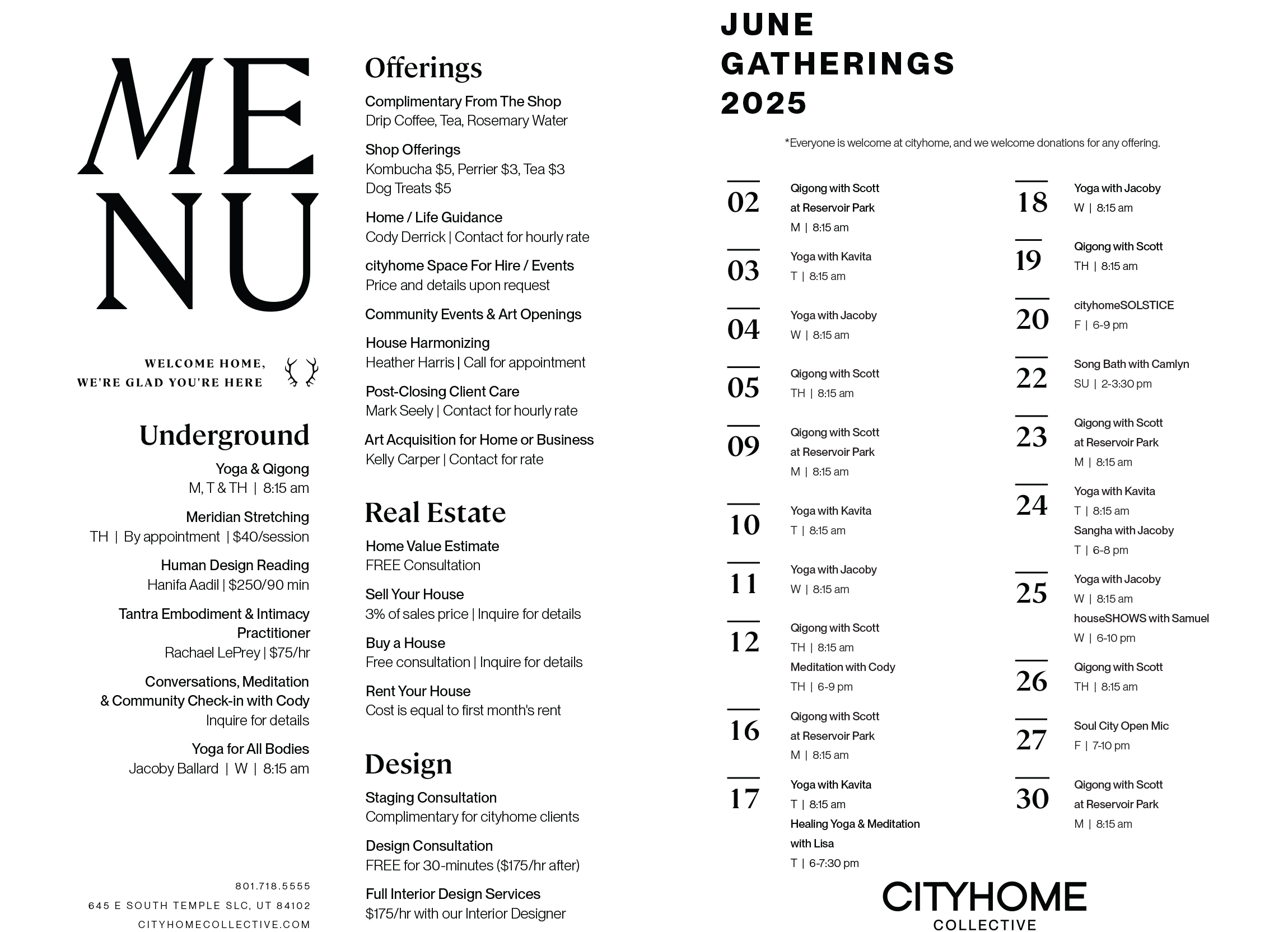 This is why we have been doing our best to point ourselves, our clients and our communities back to the Self. Whether it is embodied movement classes, community meditation groups, house therapy sessions, or first time home buyer classes, we have tended to a holistic approach to real estate, design and good neighbor-ing for almost twenty years. To keep it communal, most of what we offer is spread word of mouth. We have a print menu in our COLLECTIVE homebase that folks can pick up anytime with a current schedule as well as an ever evolving list of services. Stop by and grab one, have a cup of tea or coffee and say hello. Free hugs for the touchers. Warm smiles for everyone. Or check the newsletter at the beginning of each month for a snapshot of what is hot off the press. Spoiler alert. It's us. And we are at your service. Happy June friends. What a beautiful month to be alive in this city, we call 'home'.