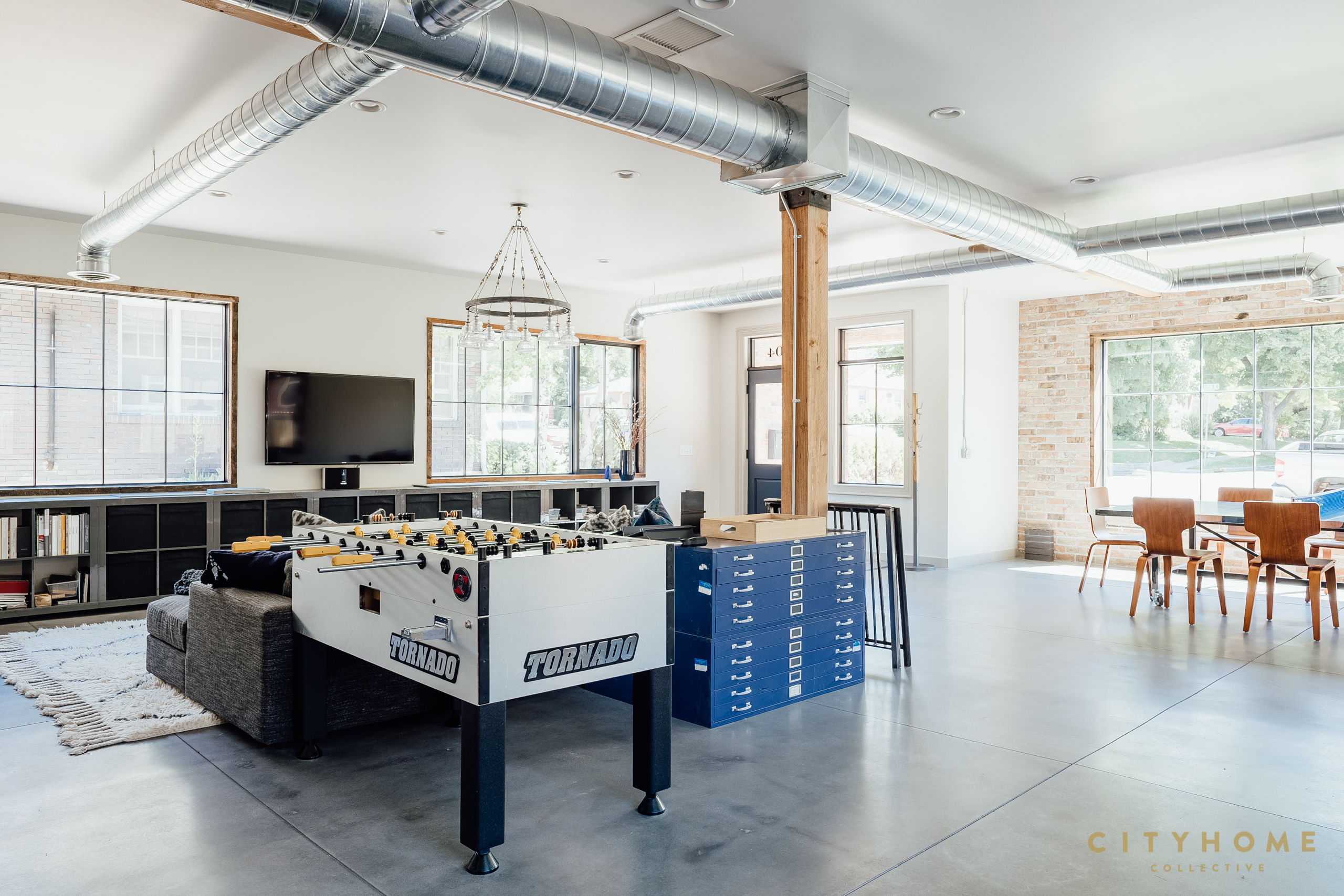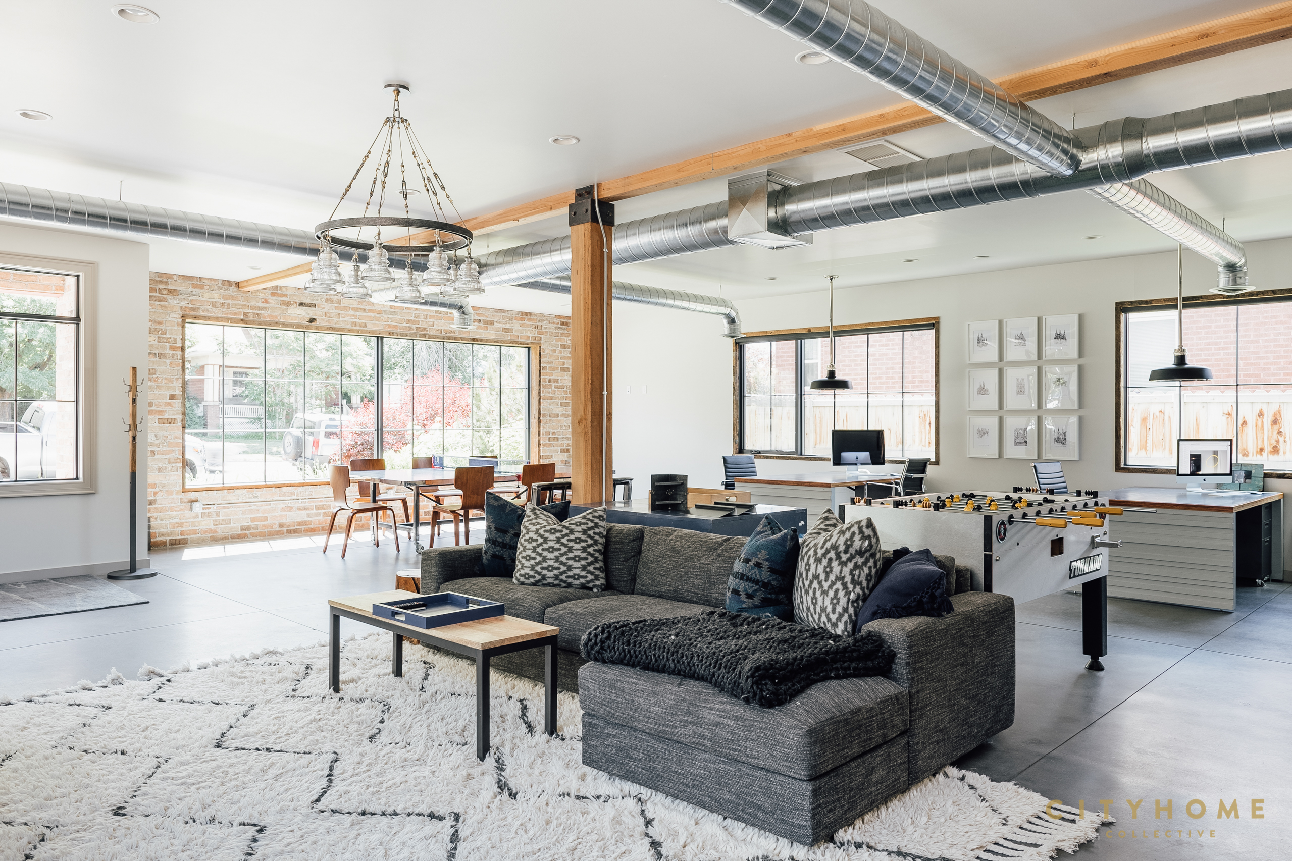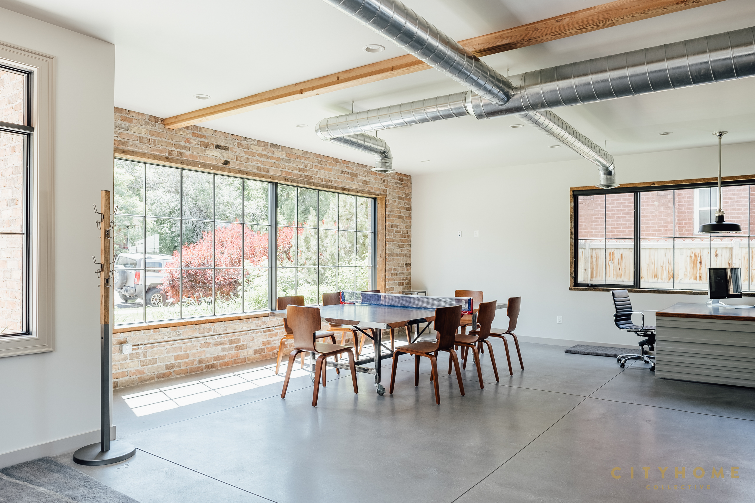 In true live/work fashion, the front door opens to an office space used by John and his employees which comprises the majority of the ground floor. Towards the rear of the house is a separate entrance with a set of stairs to the family’s living areas on the second floor. And, despite, clocking in at around just 1600 square feet, the upper-level spaces have been carefully worked as to feel perfectly abundant. A couple of minor adjustments to the open kitchen, living, and dining area, for instance, and suddenly there’s enough room to seat a whole host of relatives over Thanksgiving. Other well-thought-out choices like the sizable—and altogether sublime—back deck and the lofty main suite closet also speak to the scrupulousness with which every inch of the home was designed. And, while the second story is more than sufficient for the family, after downstairs business dealings wrap for the day, that space becomes fair game. During hours of operation, the office’s custom conference/ping pong table hybrid, foosball table, and sprawling sectional promote laid back workplace vibes, but also can, and often do, become the main attractions of a well-equipped rec room. In fact, the layout of the home was so meticulously whipped up it even offers a contingency plan should the family wish to relocate without fully letting go of the spot. More specifically, a couple of easy tweaks are enough to transform these digs into two separate—and highly rentable—apartments.