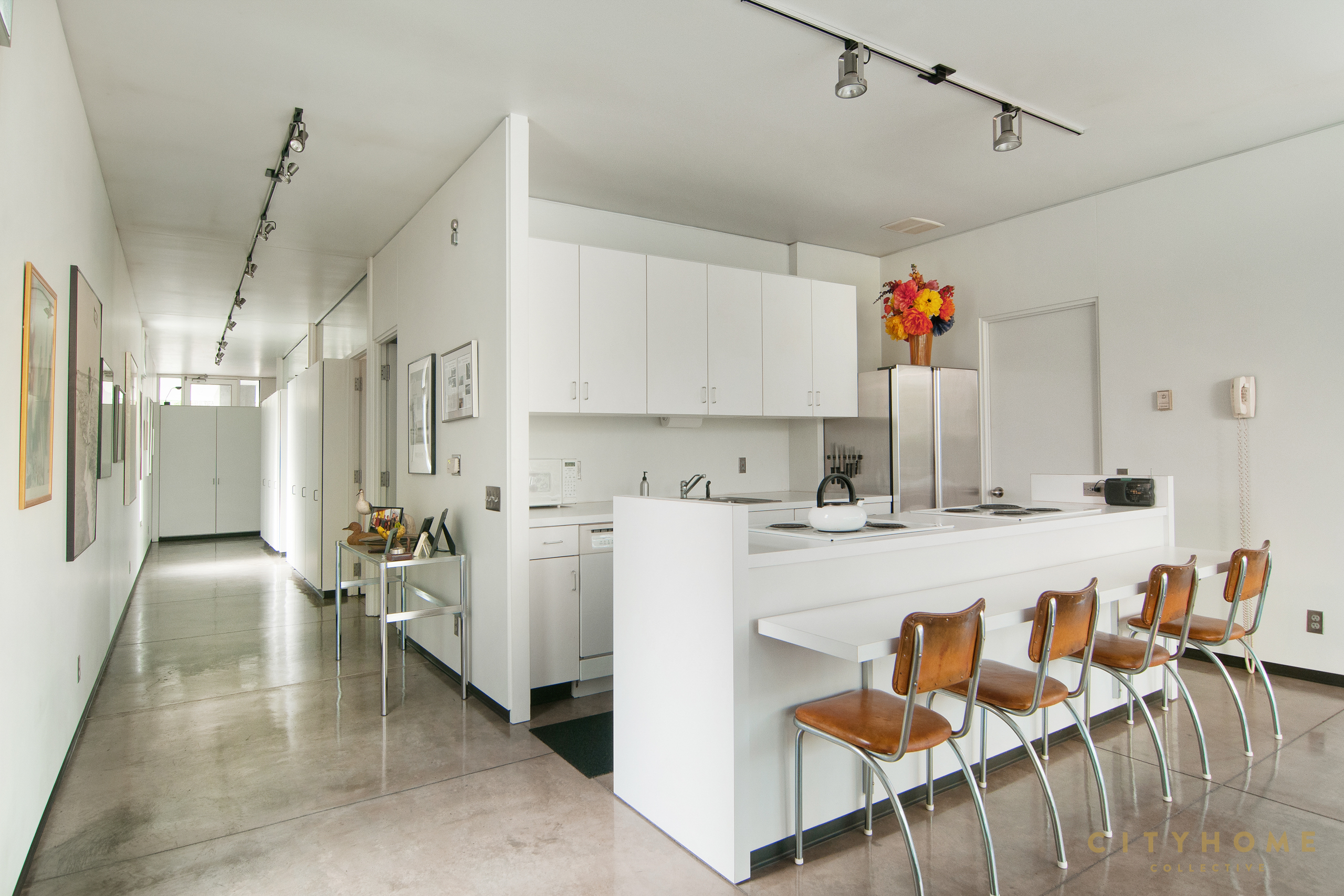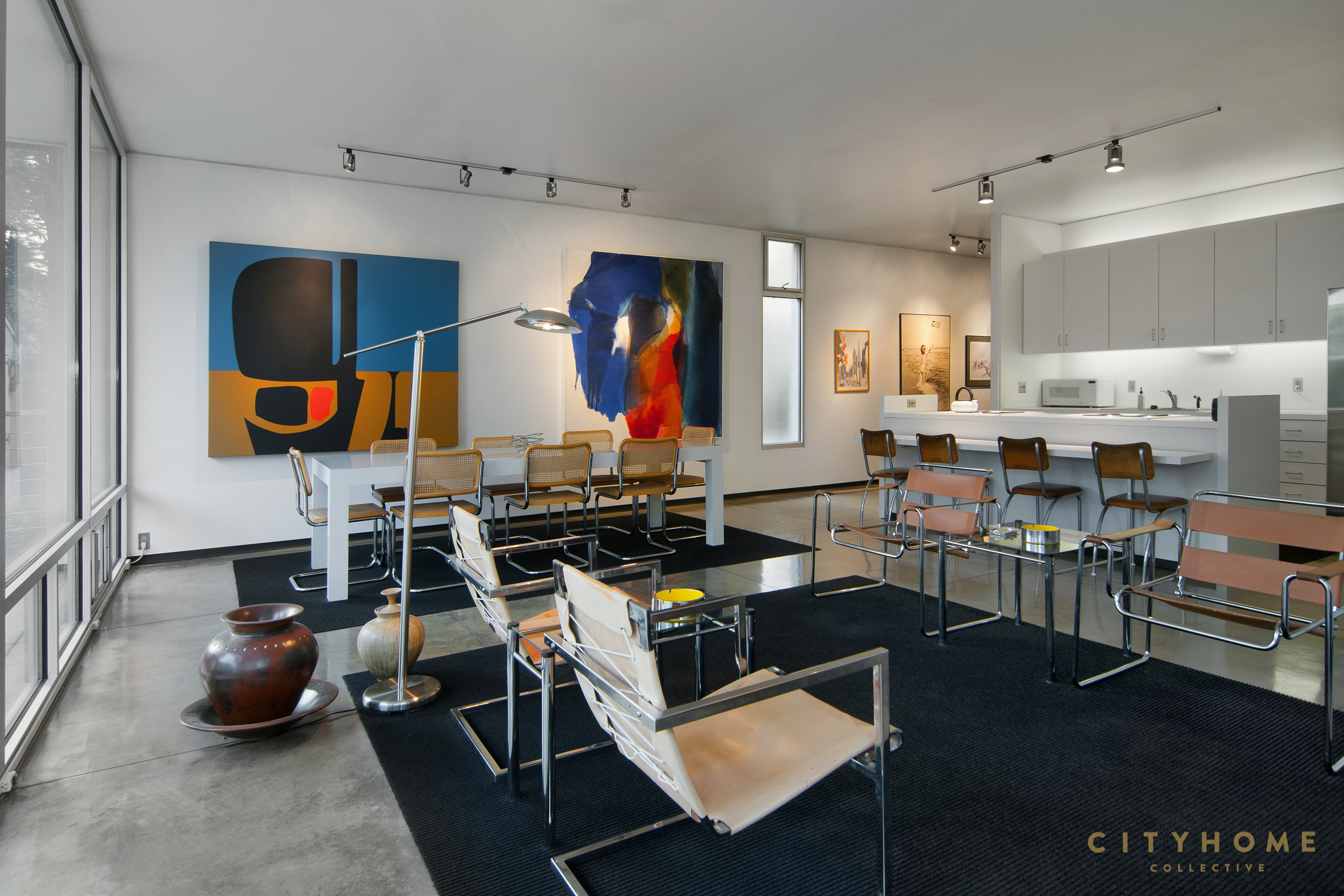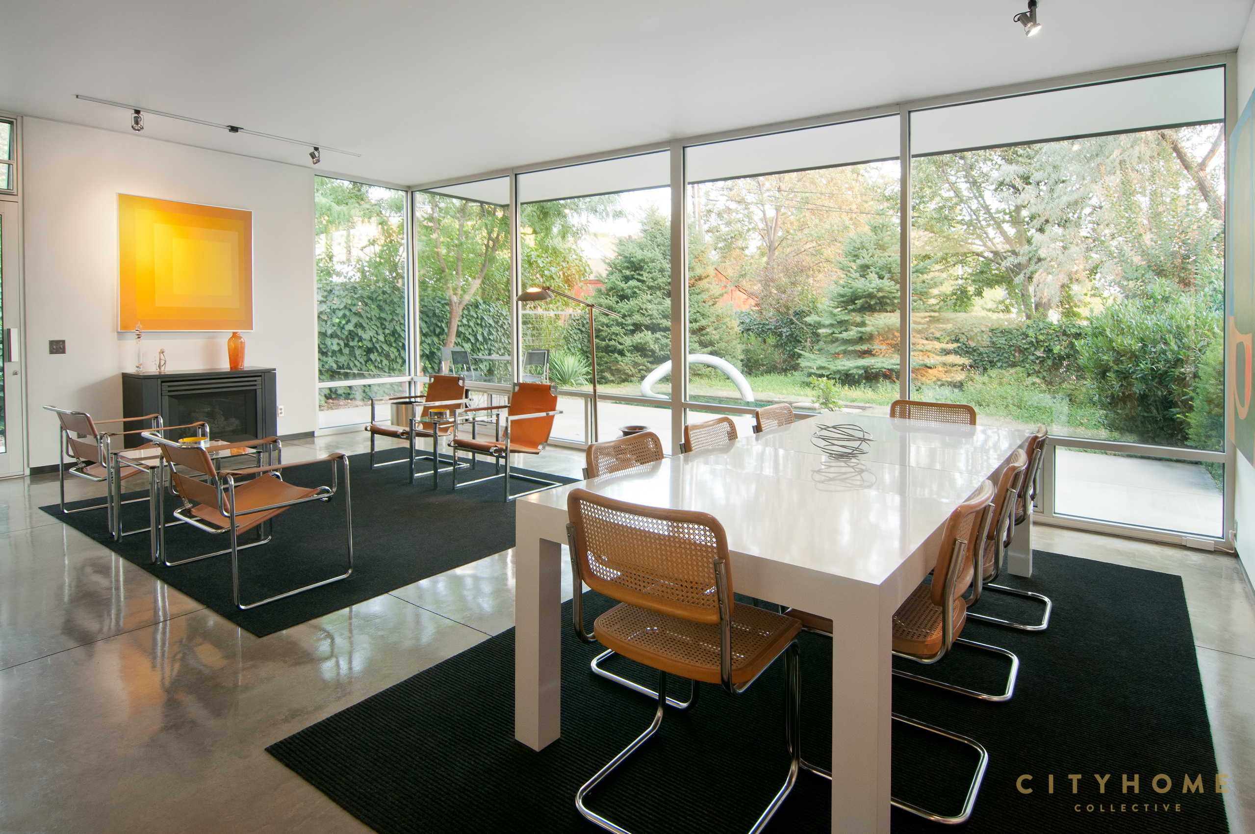 The glass entry way to this incredible space serves as a literal window of proof that the concrete flows seamlessly from exterior to interior. It’s a modest single-level at 1,800 sq. ft., but given the notably designed floor plan, official size is of little concern. Steel beam and metal suspension at play, the home is positioned between two concrete walls that travel smoothly from the car port to the rear garden. A creative application of linear living has been put to use and the entry hallway is a lesson in flow. Living quarters in the form of office, bathrooms, and master/guest bedrooms coyly line the left wall behind a savvy collection of built-in [and out-of-the-way] storage units. Equal to the task of forward movement, a gallery of work covers the right wall clear to the rear of the house. The ceiling height throughout feels ideal at 9’4″, and concrete floors, complete with radiant heat, flaunt gorgeously up-to-date living standards. Once you approach the entertaining space, the house basically blooms in full. An arresting wall of double-pain windows opens up the interior space and pulls in the courtyard, allowing for an intimate connection with the Salt Lake seasons. It’s a stellar example of living inside without feeling enclosed.