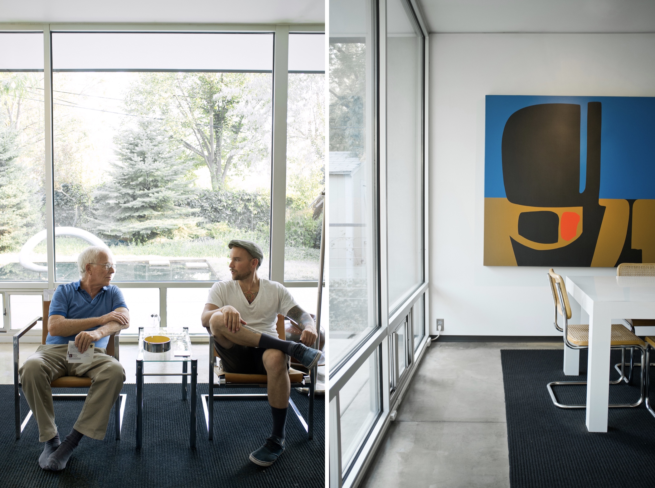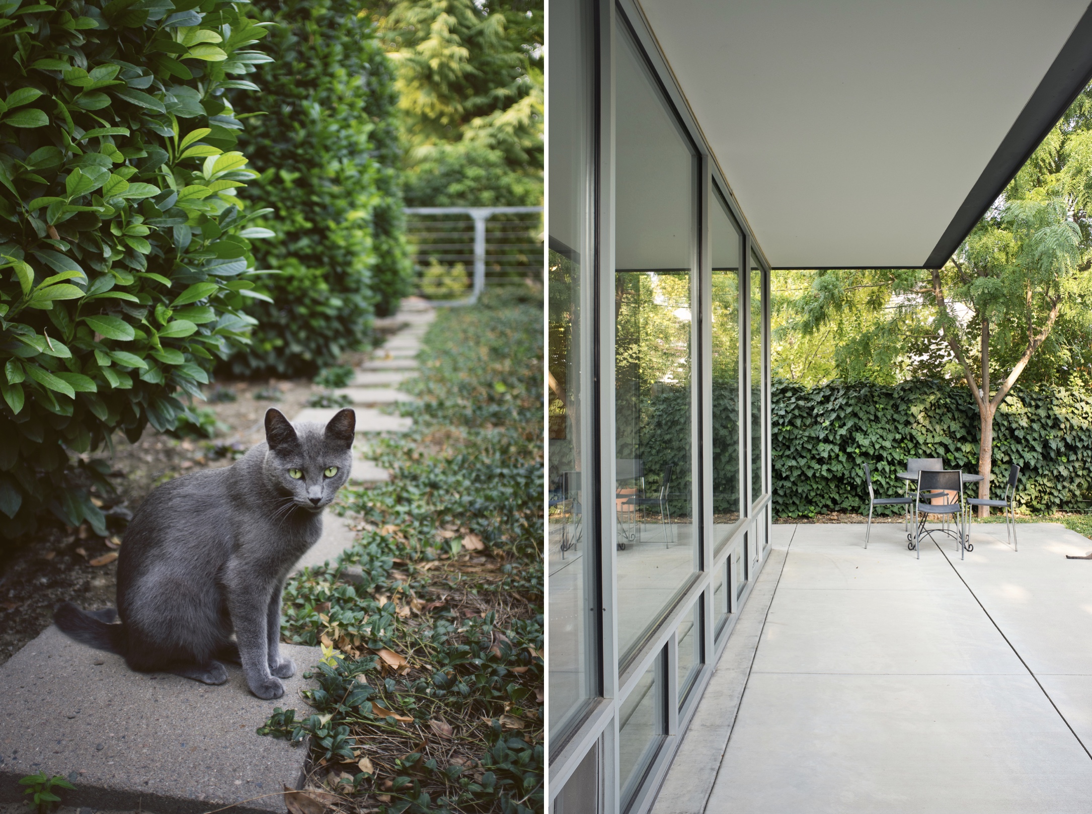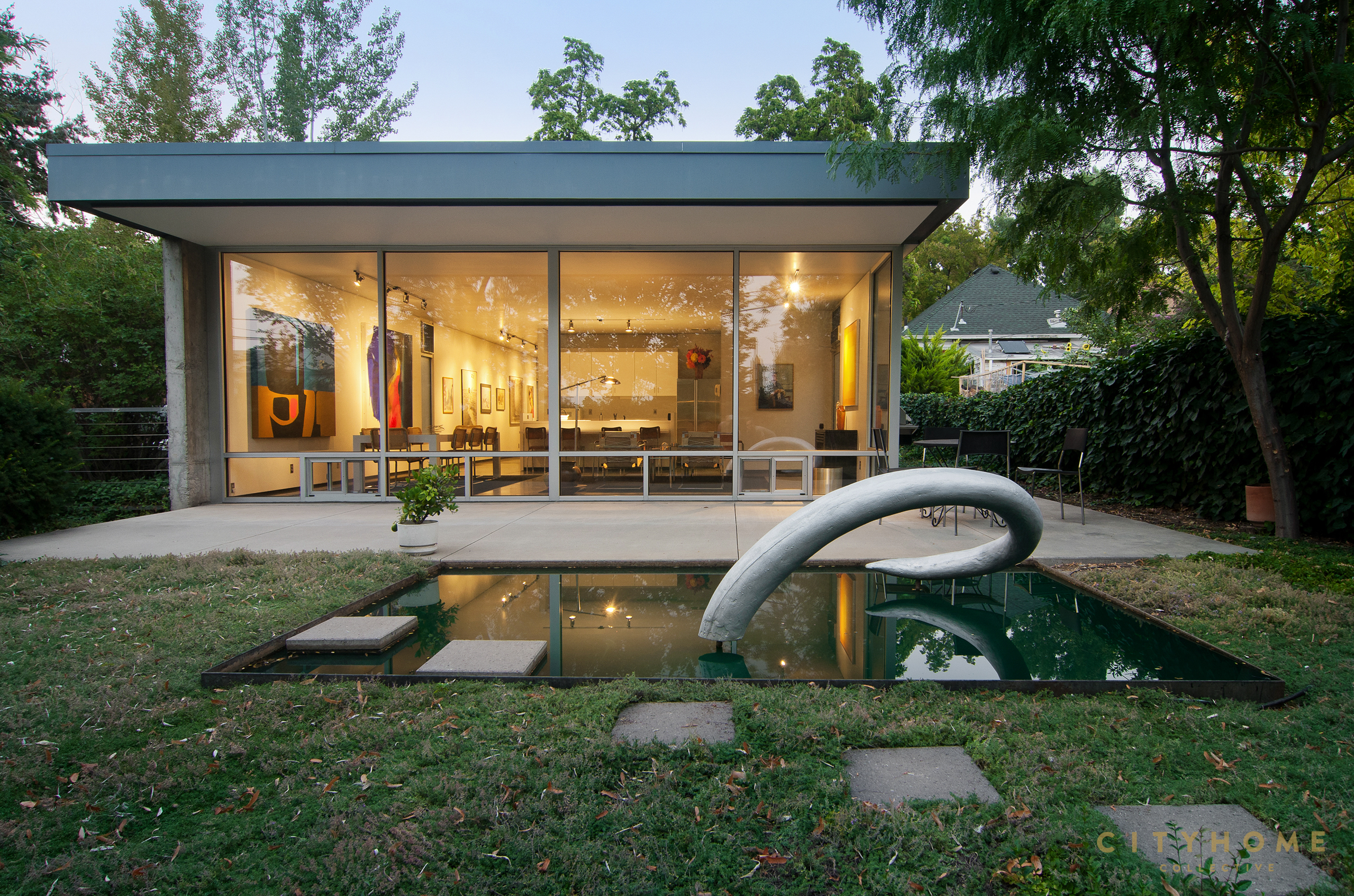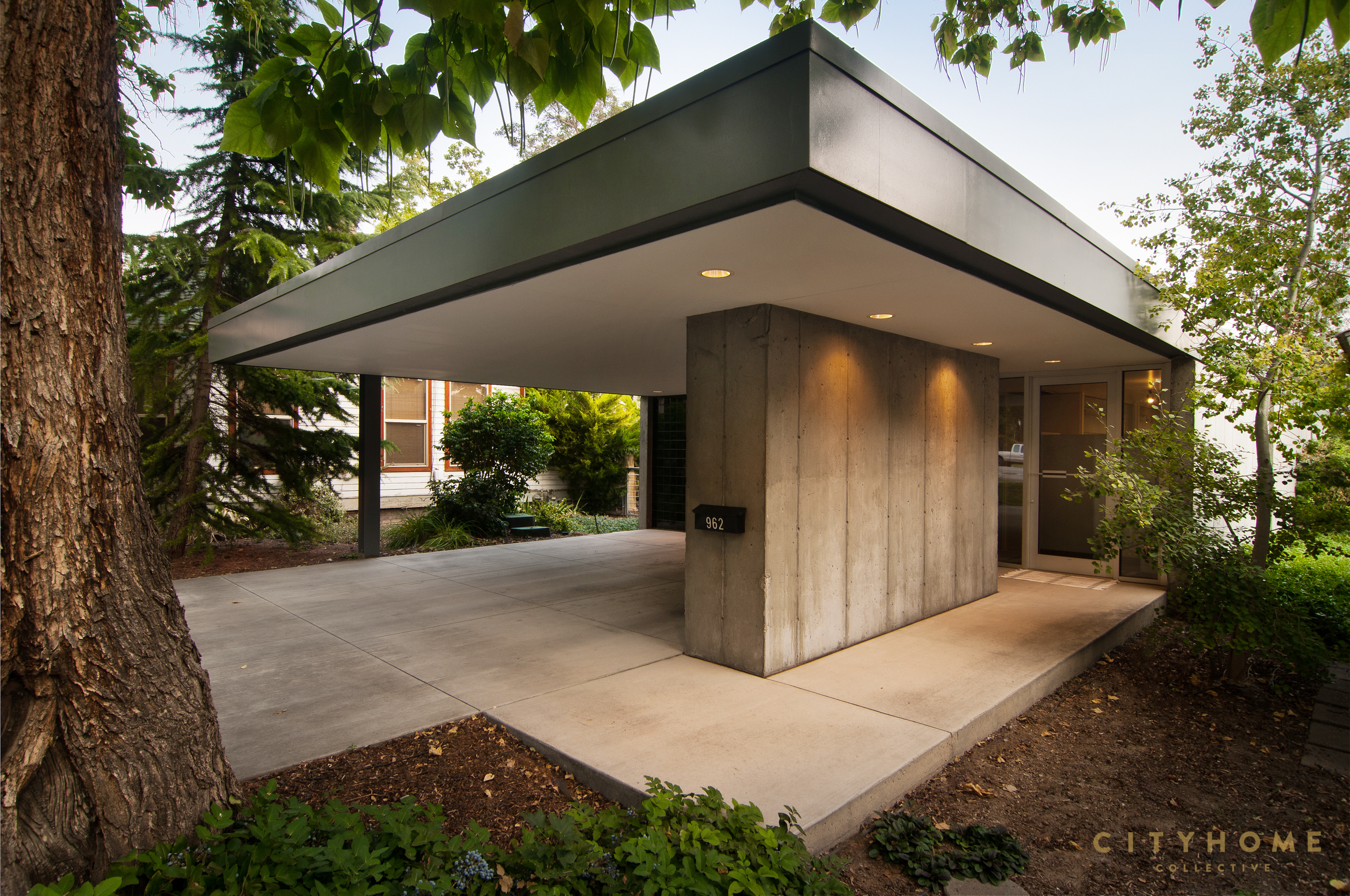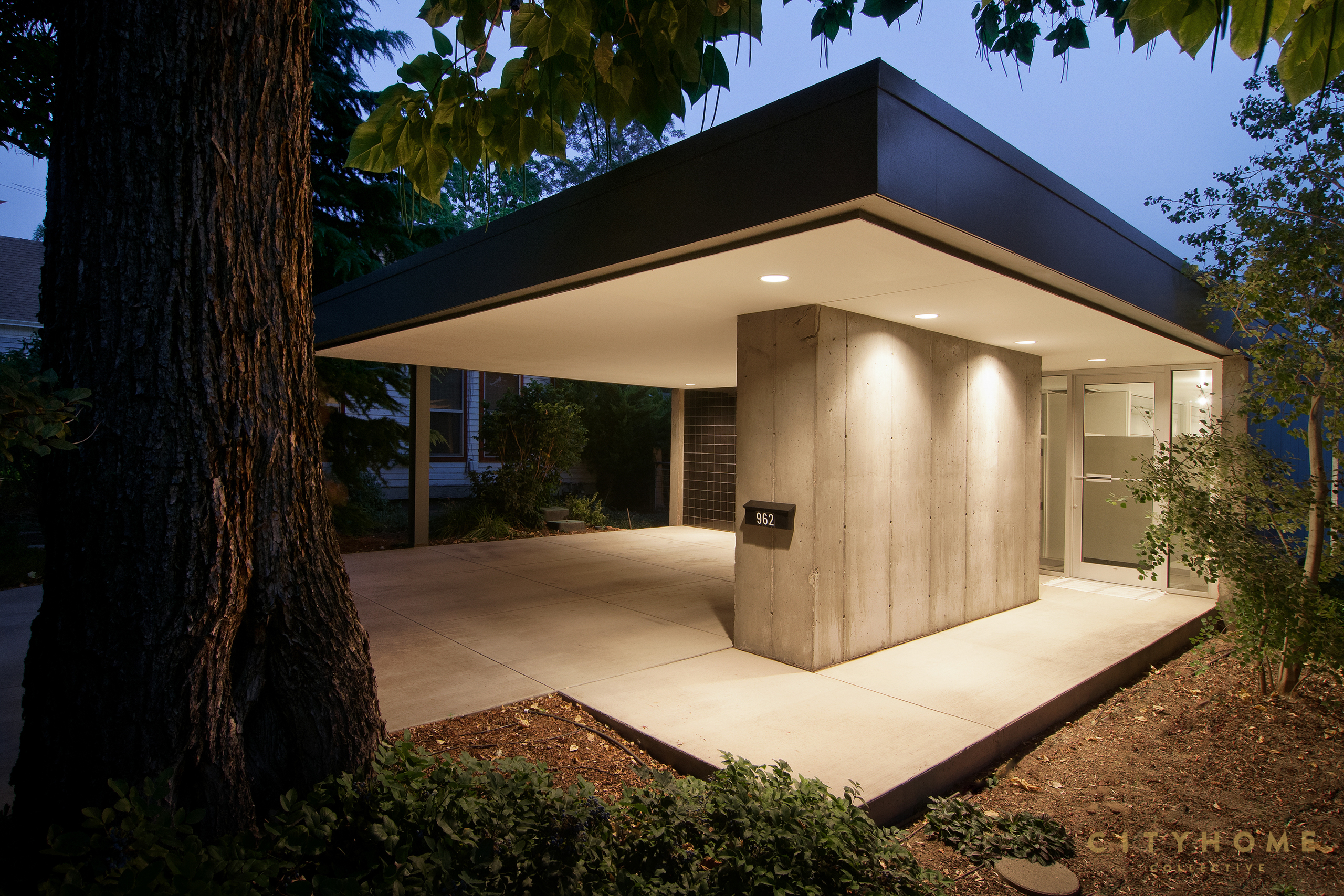 Salt-Lake-City dweller, Dee Wilson, is a local architect who has perfected the art of simplicity. The final project before retirement, his personal residence exemplifies the crescendo of his collected works in modernist progression. He’s remained faithful to his home’s style, evidenced in part by his decision to integrate the structure seamlessly with nature; the home is positioned between two Catalpa trees in an effort to save them. As a result, the impact was minimal and modern, understated yet bold. Dee’s home is a wallflower on the street, its pretty face pulled back among the more noticeable bungalows and Victorians. A simple car port is the mug of the casa, and in winning a spark of inspiration, black tile was used on the street-facing wall, making for an exotic entrance that, when lit at night, is stunning. There’s a perfectly-placed, concrete pillar that visually separates the car port from the front door, and (in a stroke of quiet genius) its secondary function is that of a secret storage space.