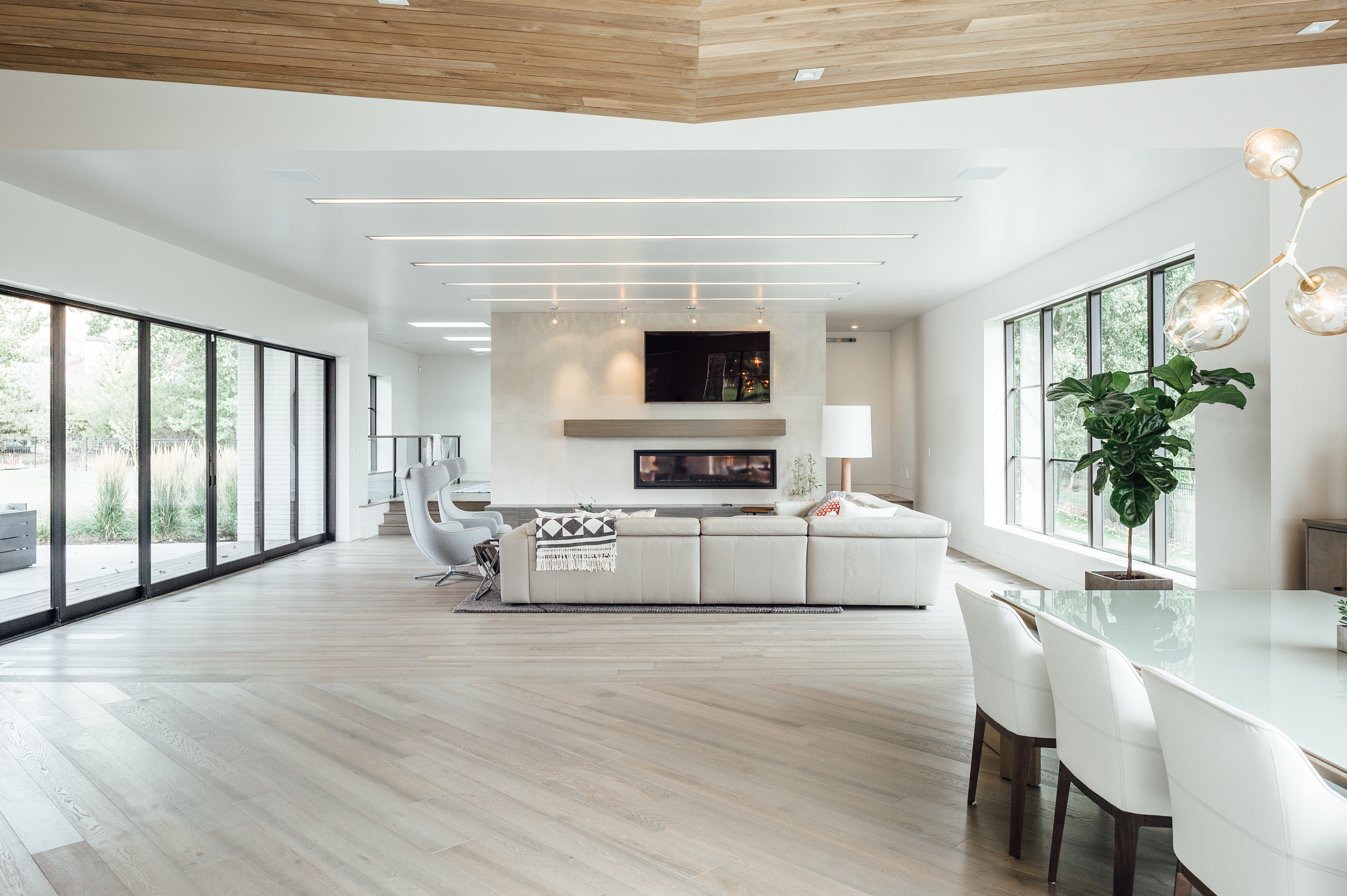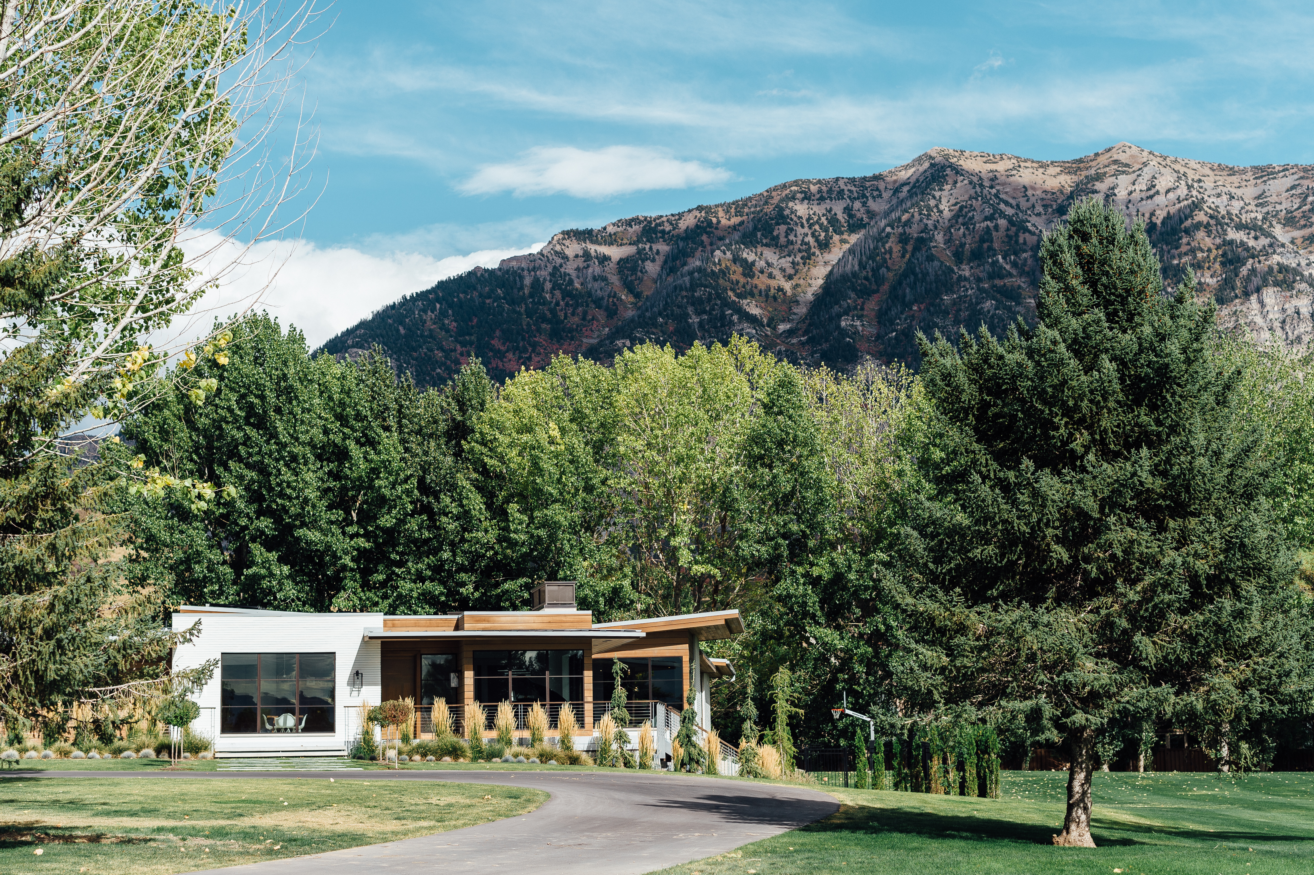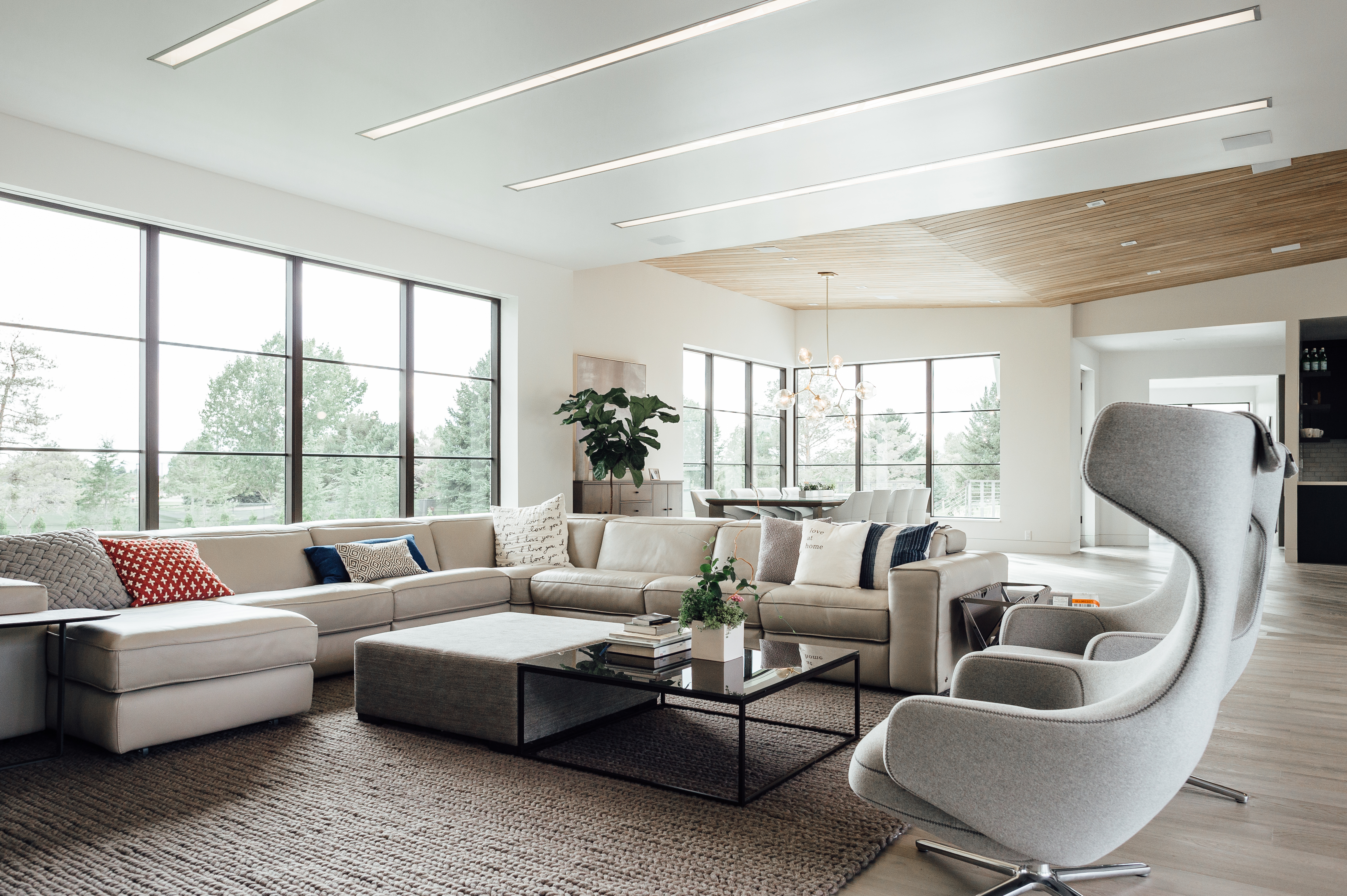 The Santiago’s space, designed by Warren (Lloyd Architects) and interior designer Anne-Marie Barton, is essentially invisible from the road. The plot includes 1.25 hilly, green acres, but is surrounded on all sides by a stretch of private and uninhabited space. How, you may ask, does a home in such a populated city come to land on such a hidden bit of greenery? Simple. It’s the sole residence on a privately-owned golf course. And since said private owner happens to be Stephanie’s brother, the family had their pick of plots. The exact location was settled upon for obvious reasons. “This was the view,” says Stephanie. Warren painstakingly specced out the views for corner windows, and worked with Anne-Marie to ensure no vantage point went to waste. To add to the modern edge, flat roofs were implemented with a few solar panel-topped butterfly roofs thrown in for good measure (this house is 80% passive solar). Inside, the ceiling lines double as directionals for where to look from particular vantage points–in some places they lead up to Mount Timpanogos, in some they bow down to a familial gathering space.