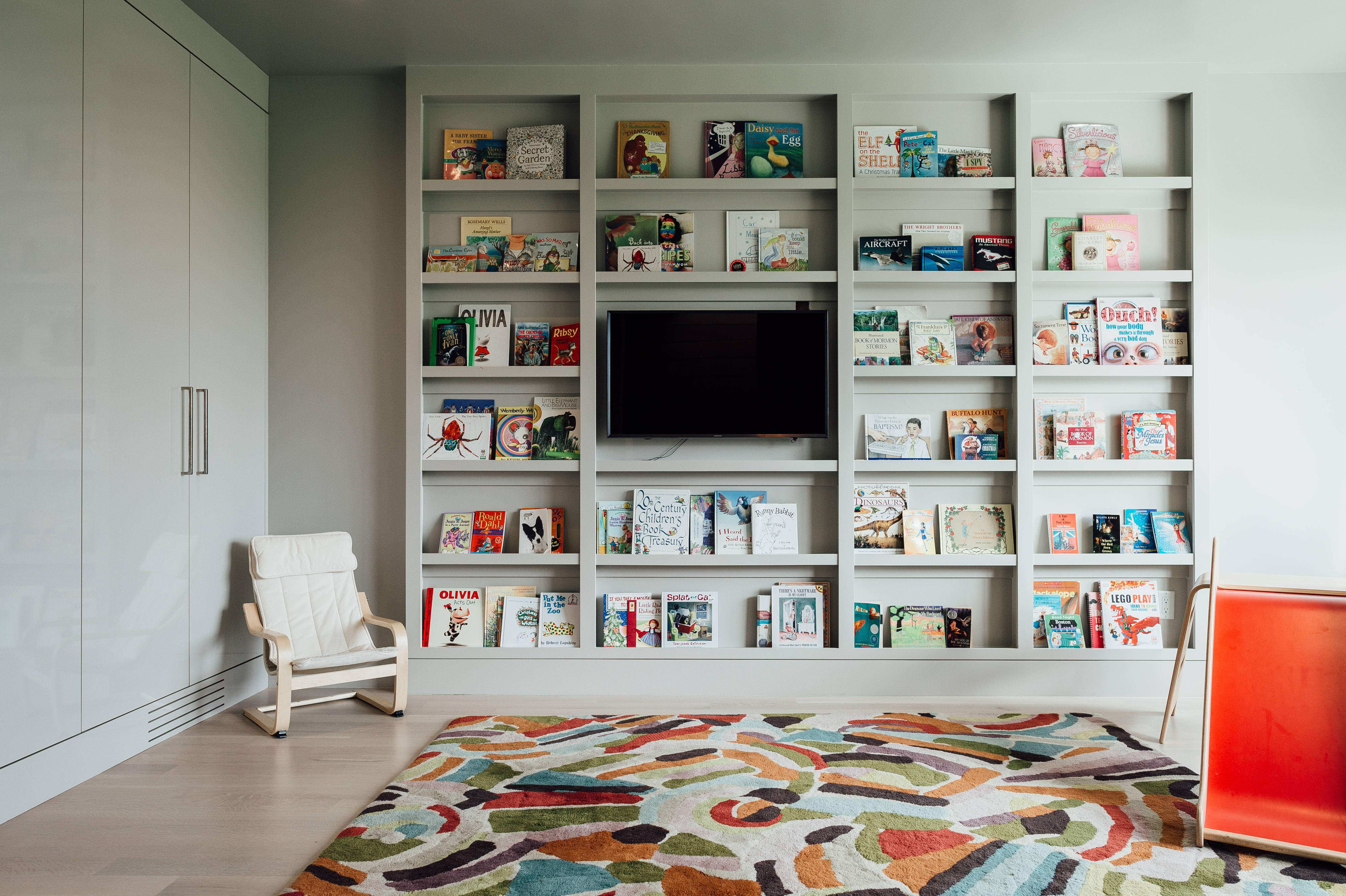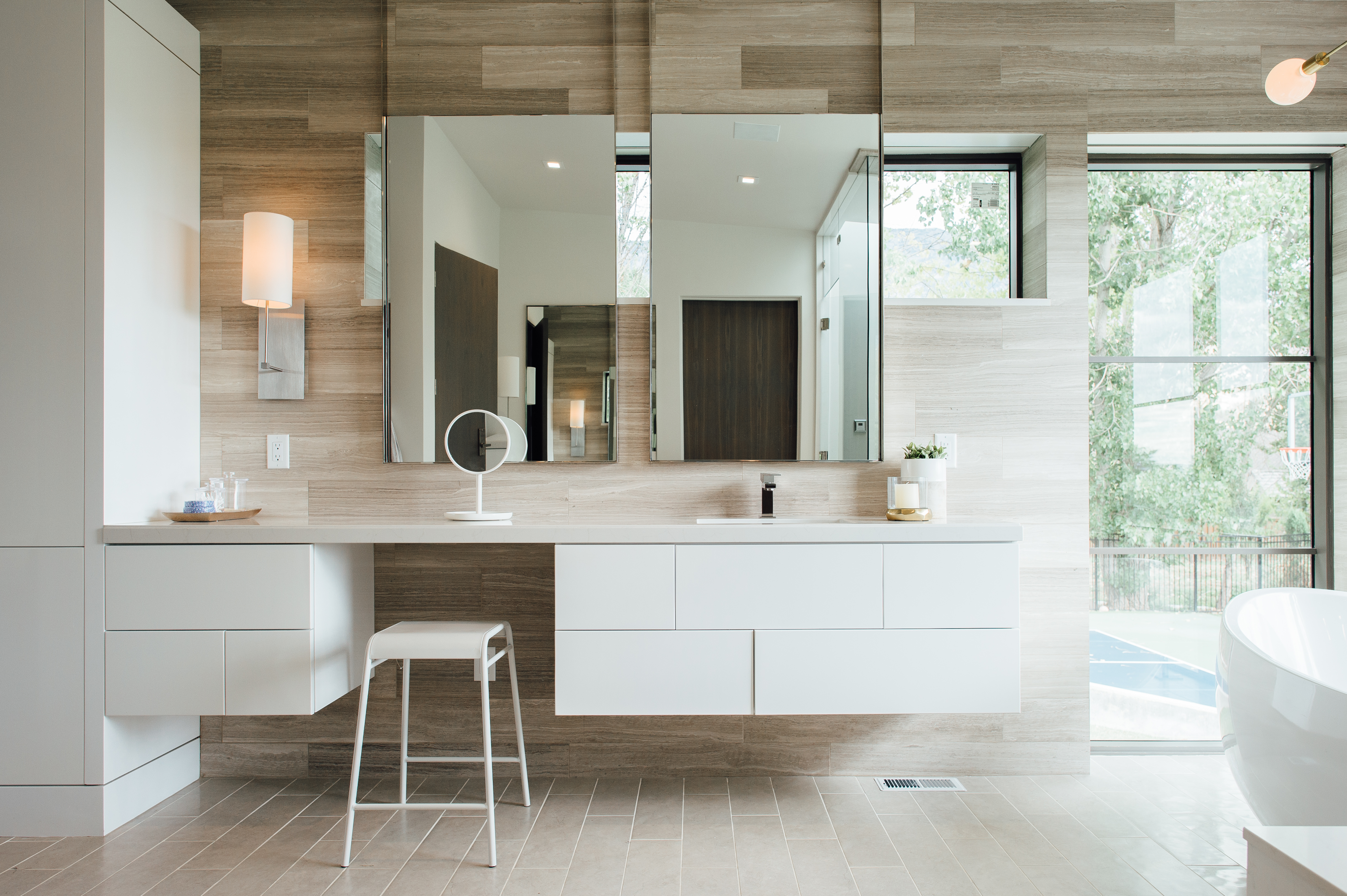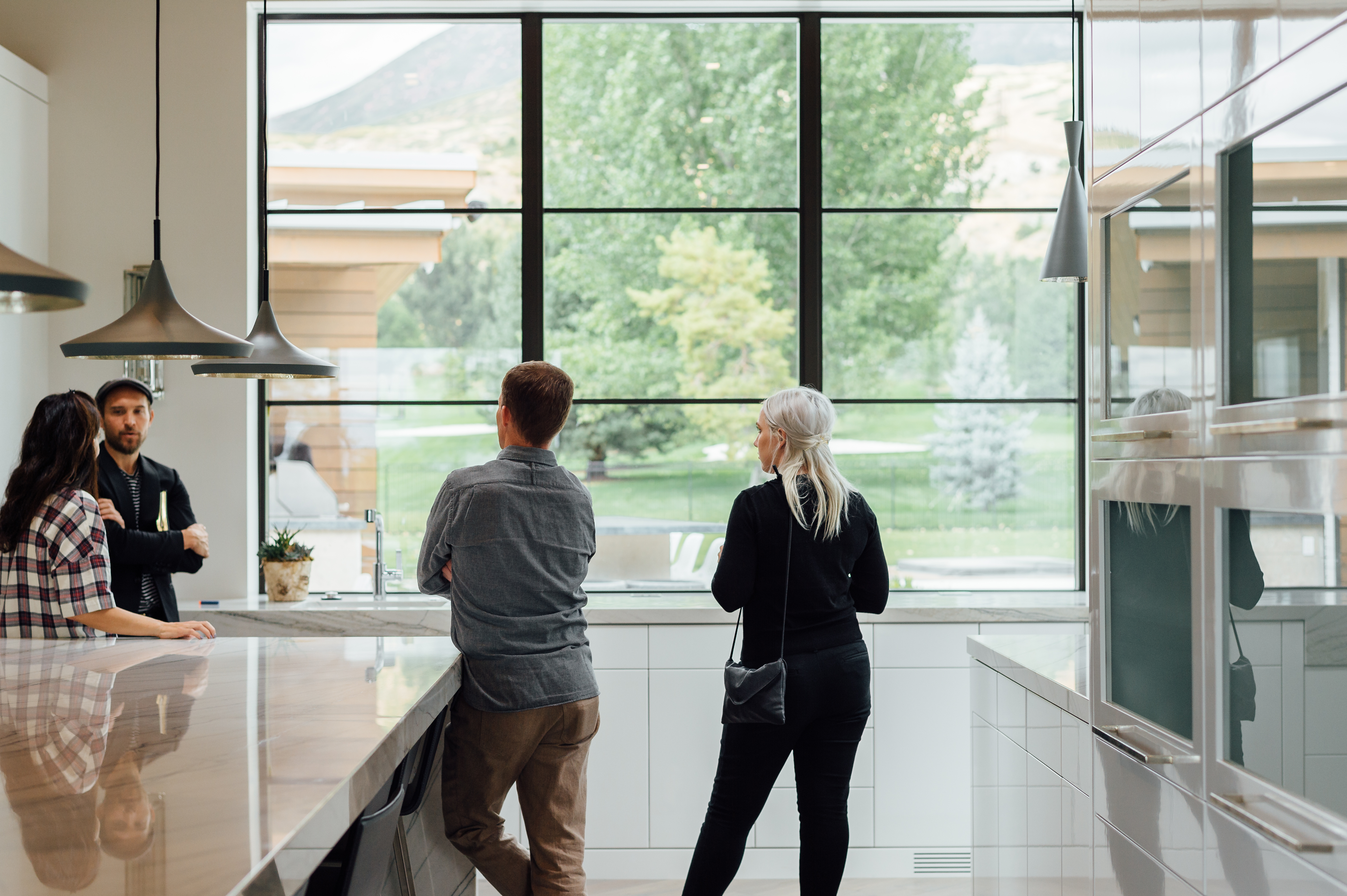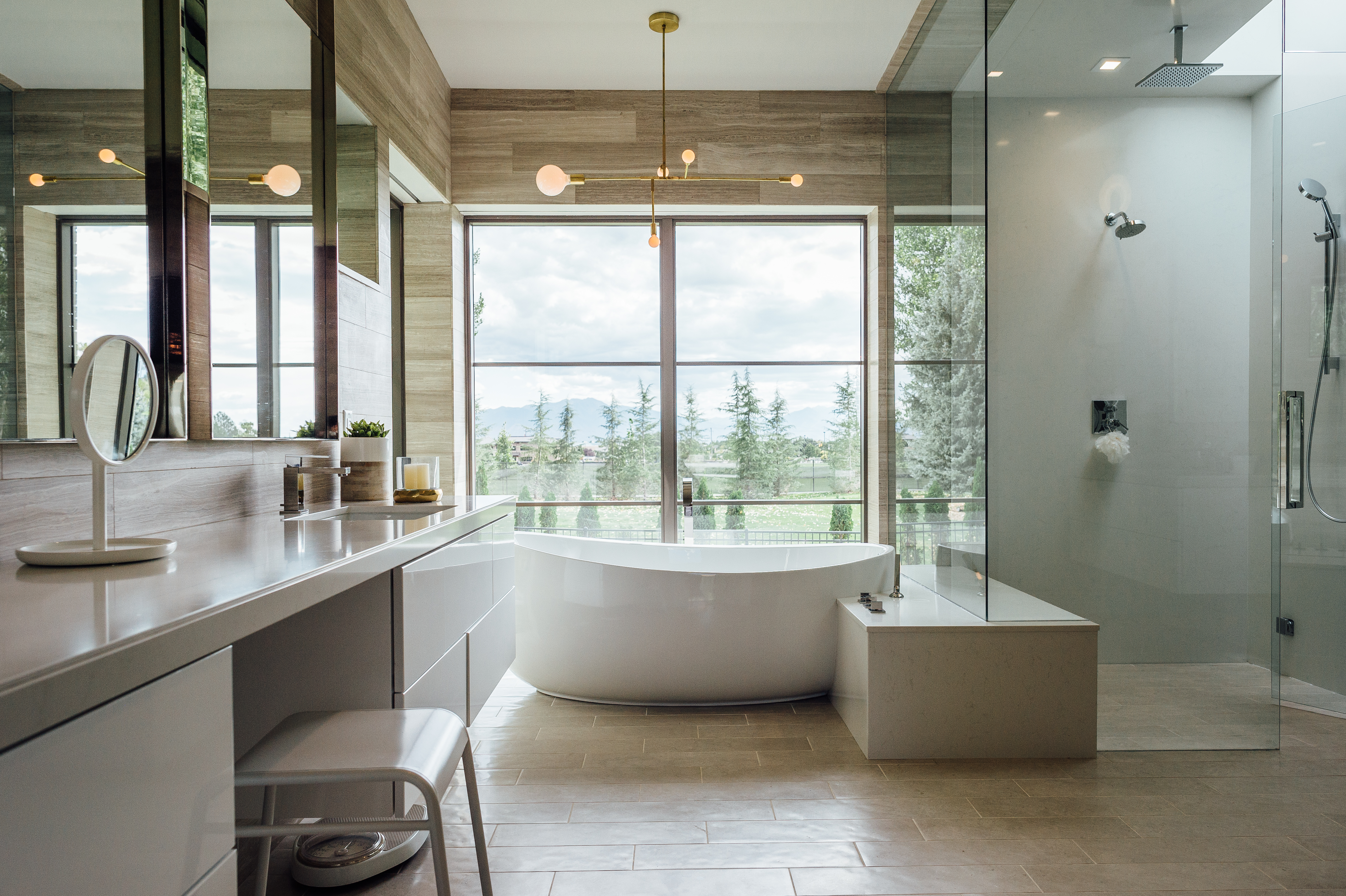 The Santiago’s space, designed by Warren (Lloyd Architects) and interior designer Anne-Marie Barton, is essentially invisible from the road. The plot includes 1.25 hilly, green acres, but is surrounded on all sides by a stretch of private and uninhabited space. How, you may ask, does a home in such a populated city come to land on such a hidden bit of greenery? Simple. It’s the sole residence on a privately-owned golf course. And since said private owner happens to be Stephanie’s brother, the family had their pick of plots. The exact location was settled upon for obvious reasons. “This was the view,” says Stephanie. Warren painstakingly specced out the views for corner windows, and worked with Anne-Marie to ensure no vantage point went to waste. To add to the modern edge, flat roofs were implemented with a few solar panel-topped butterfly roofs thrown in for good measure (this house is 80% passive solar). Inside, the ceiling lines double as directionals for where to look from particular vantage points–in some places they lead up to Mount Timpanogos, in some they bow down to a familial gathering space.