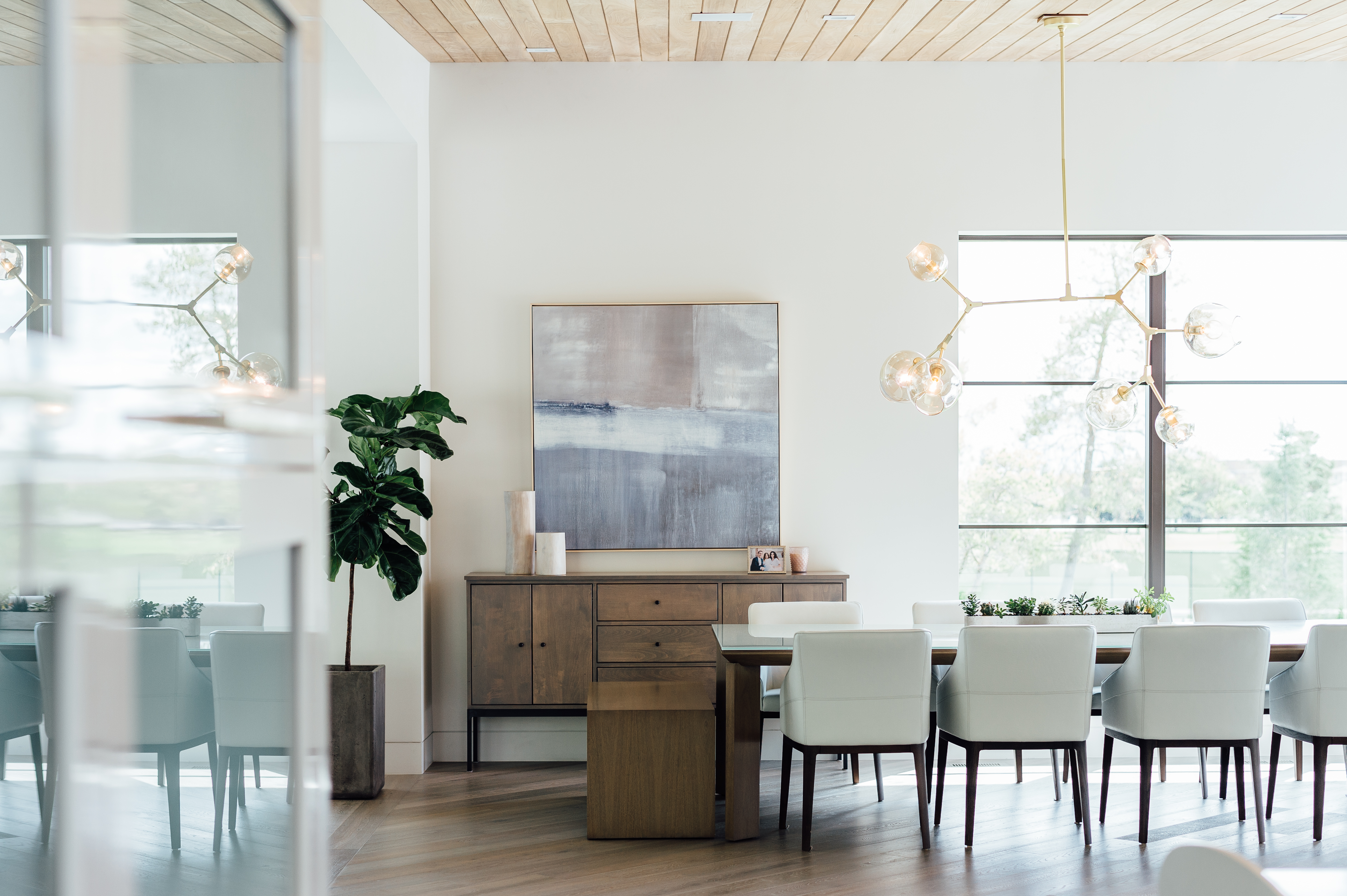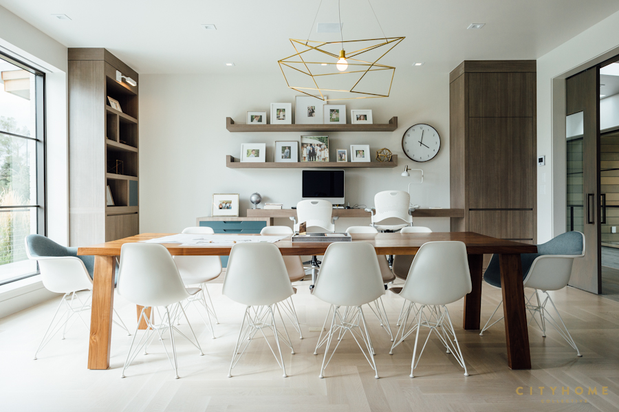 The first thing one notices upon entering the home is that there is no space wasted in “formals”, here. The entryway serves as the oft-used piano room/sitting area, and the adjoining room, a potential “private den,” acts a family office, complete with a conference table and computer stations. Todd and Stephanie knew they would need ample square footage, but they wanted to avoid superfluous space. Says Warren, “The question was, how do we create something that big that’s also intimate?” A few solutions came in the form of a seriously fashionable mud room (which houses individual lockers for each of the Santiagos’ coats, boots, bags, and sports equipment), and a (stunning) sliding wood door, which enables the kitchen’s casual pantry to either be hidden from sight or act as a thoroughfare from the craft room to the kitchen. Which brings us to the kitchen. A spread of natural lighting, an oversized island, stellar hardware, and a dreamy walnut-clad ceiling make this understandably the central hub of the home (and the most-frequented space by the family). But every space is as thoughtfully–and intentionally–laid out.