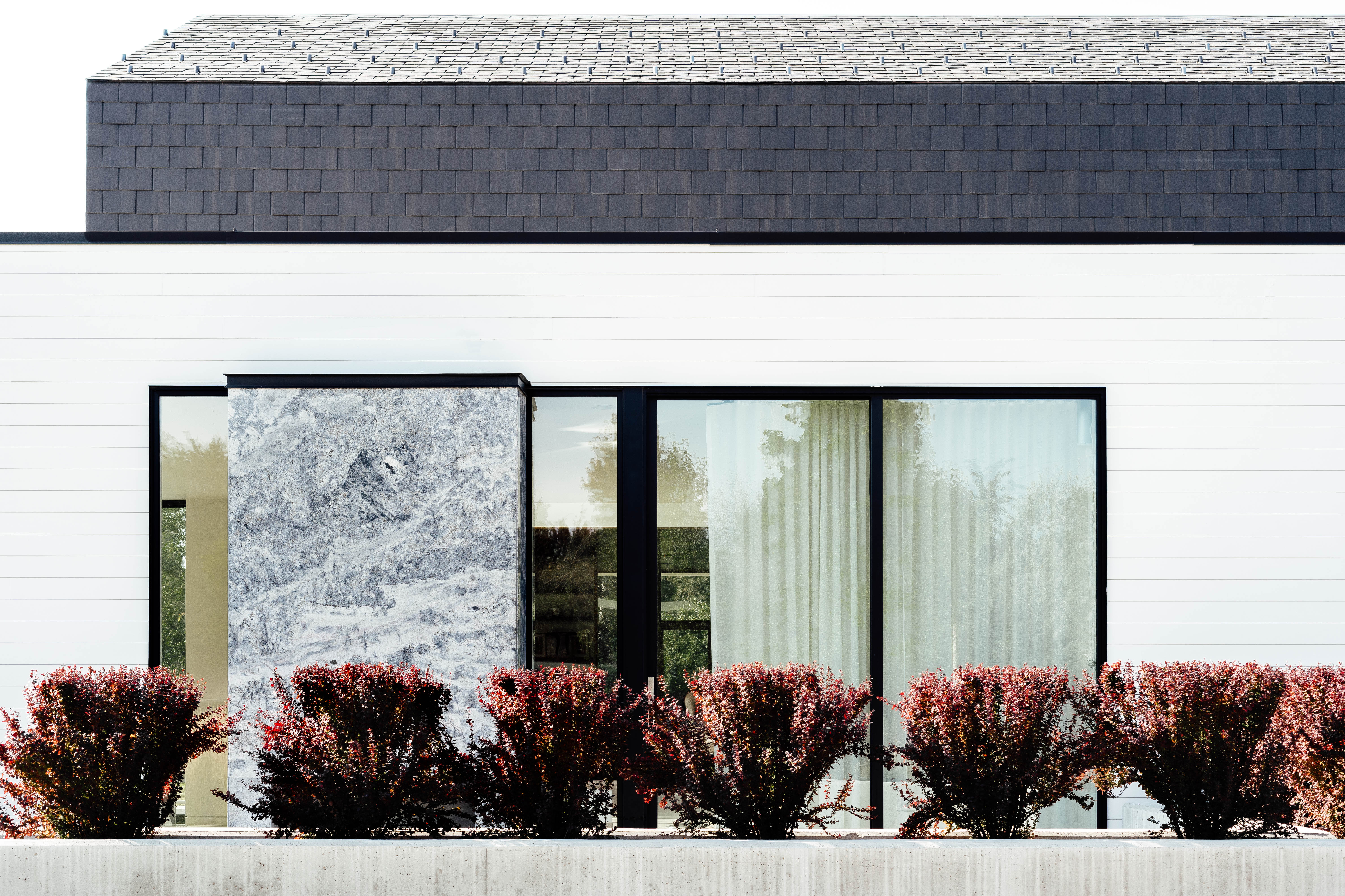 AM: The dark, slate-clad gable form of the house is contrasted by a white linear base. That gable form exists as a common representation of the American Farmhouse vernacular, and this home provides a modern interpretation of that lineage, something of which we are very proud.