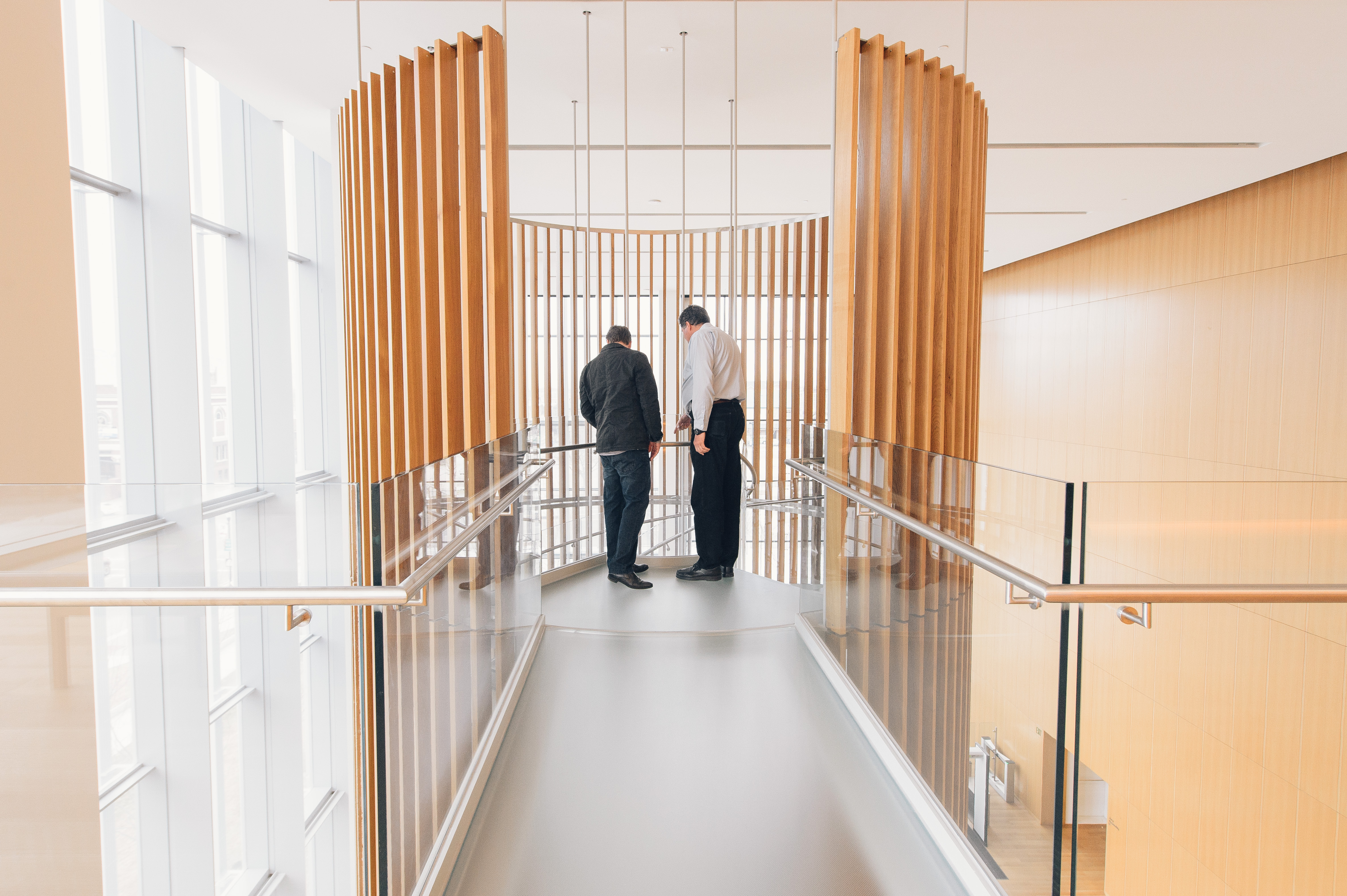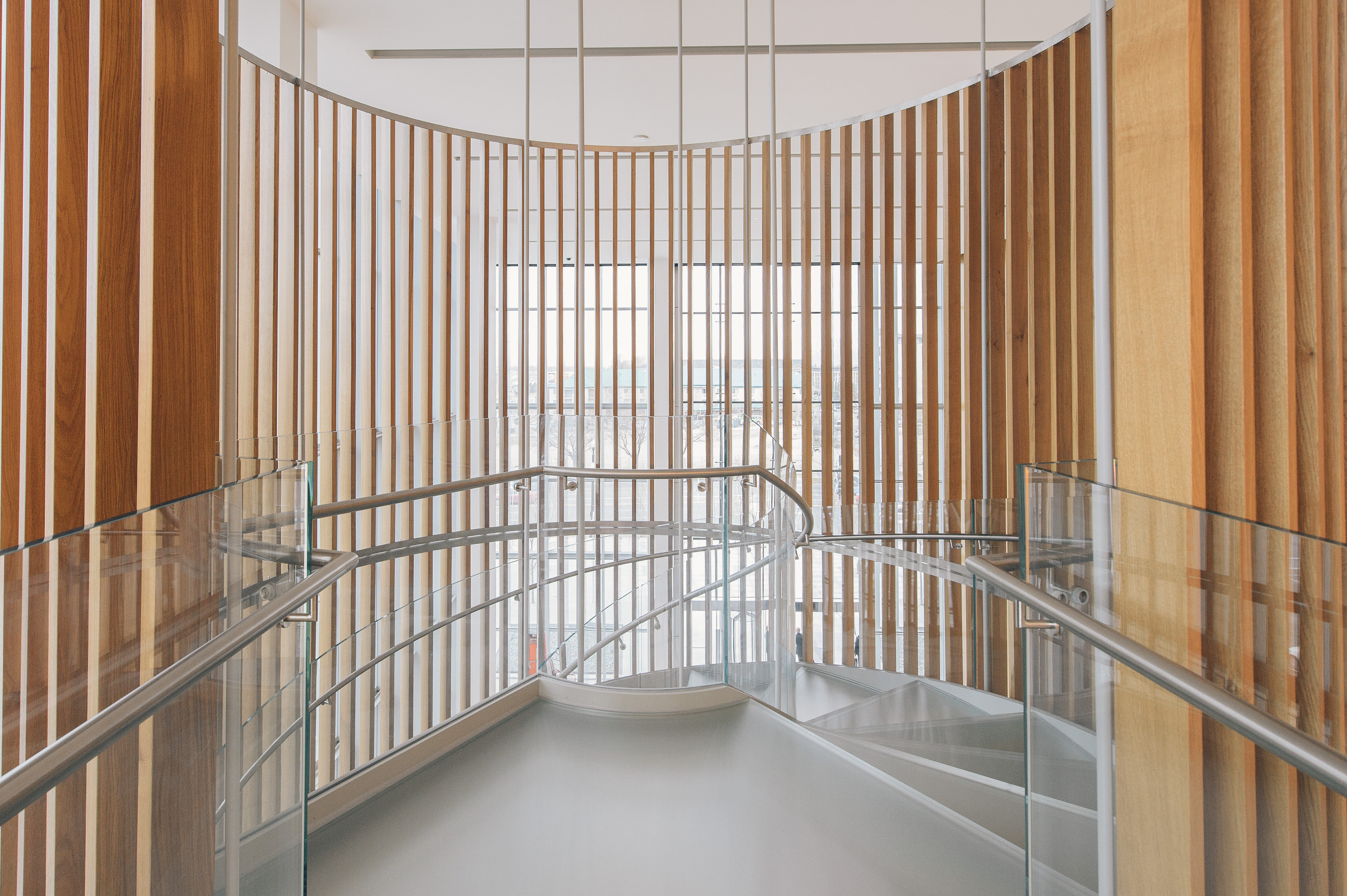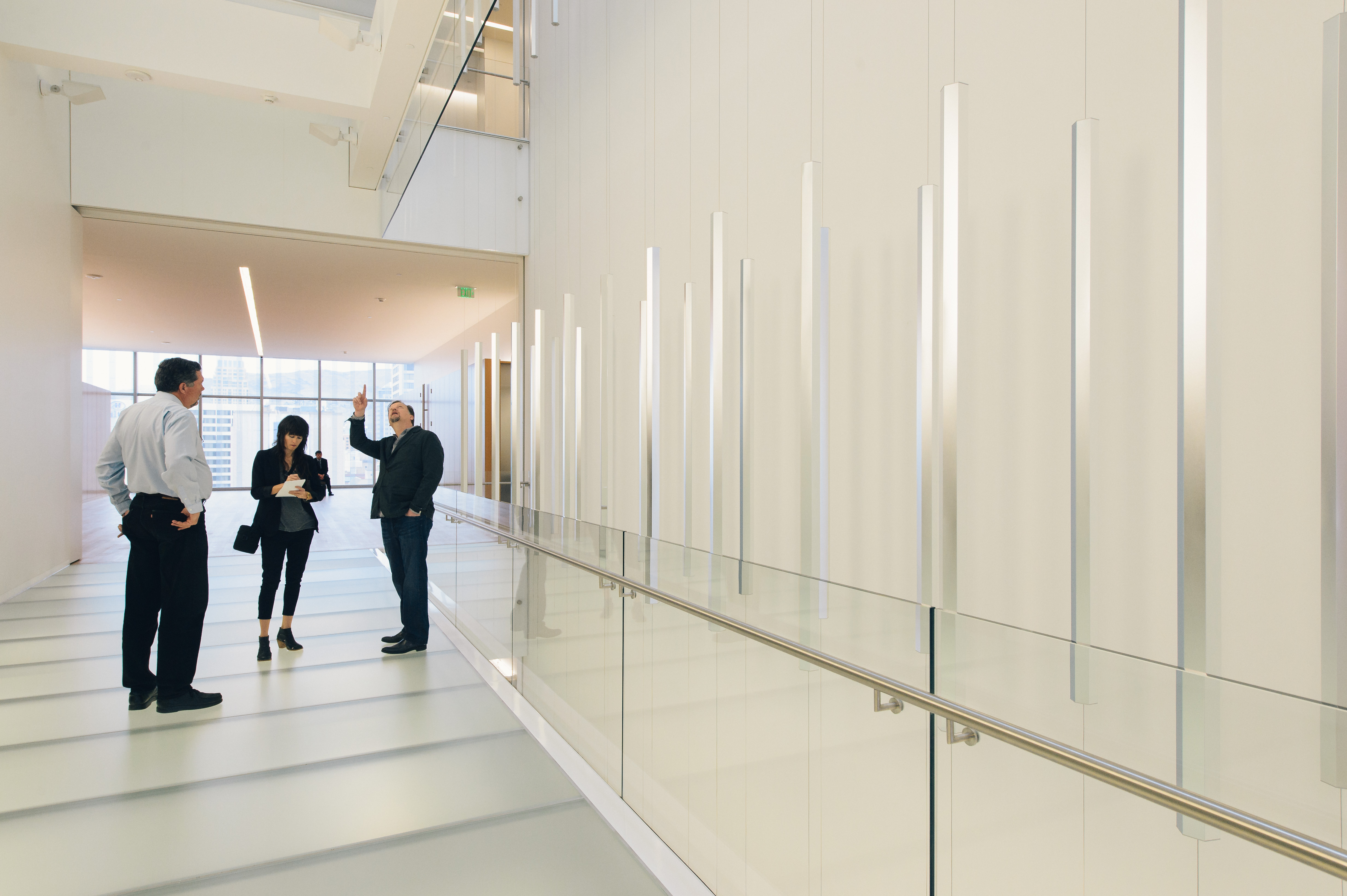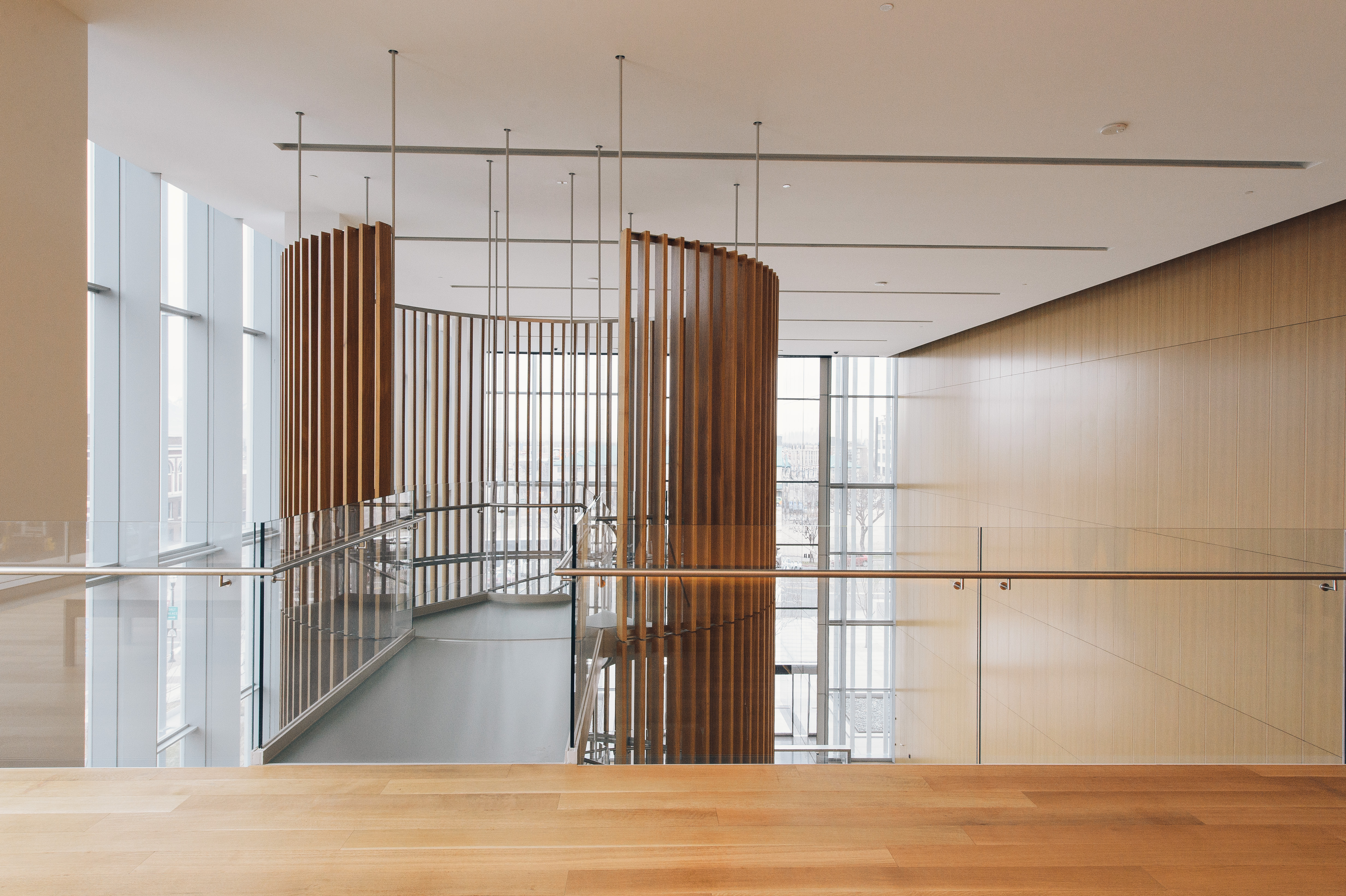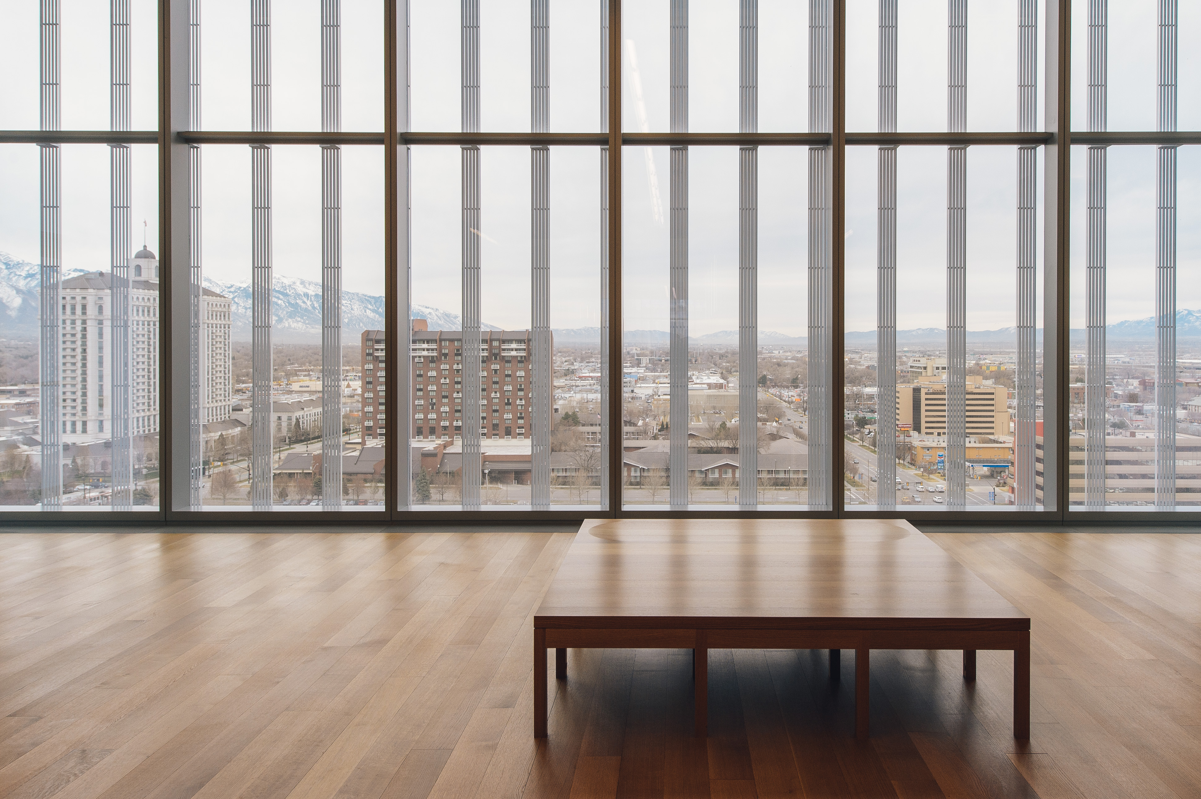 The long linear elements of the design don’t leave much room for construction imperfections. Were you able to find the craftsmanship you needed locally? [Salt Lake City-based] Okland Construction was the contractor and they were absolutely terrific. They were such a partner in making a great building. The exterior louvers were built by Benson Industries in Portland, Oregon. Beehive Glass in SLC provided much of the interior glass and steel, including the circular lobby stair. If you go up close to the building, you’ll see how carefully it is put together. The millwork was done by a local company called Fetzer Architectural Woodworking, which works all over the country and knew how to get it done.