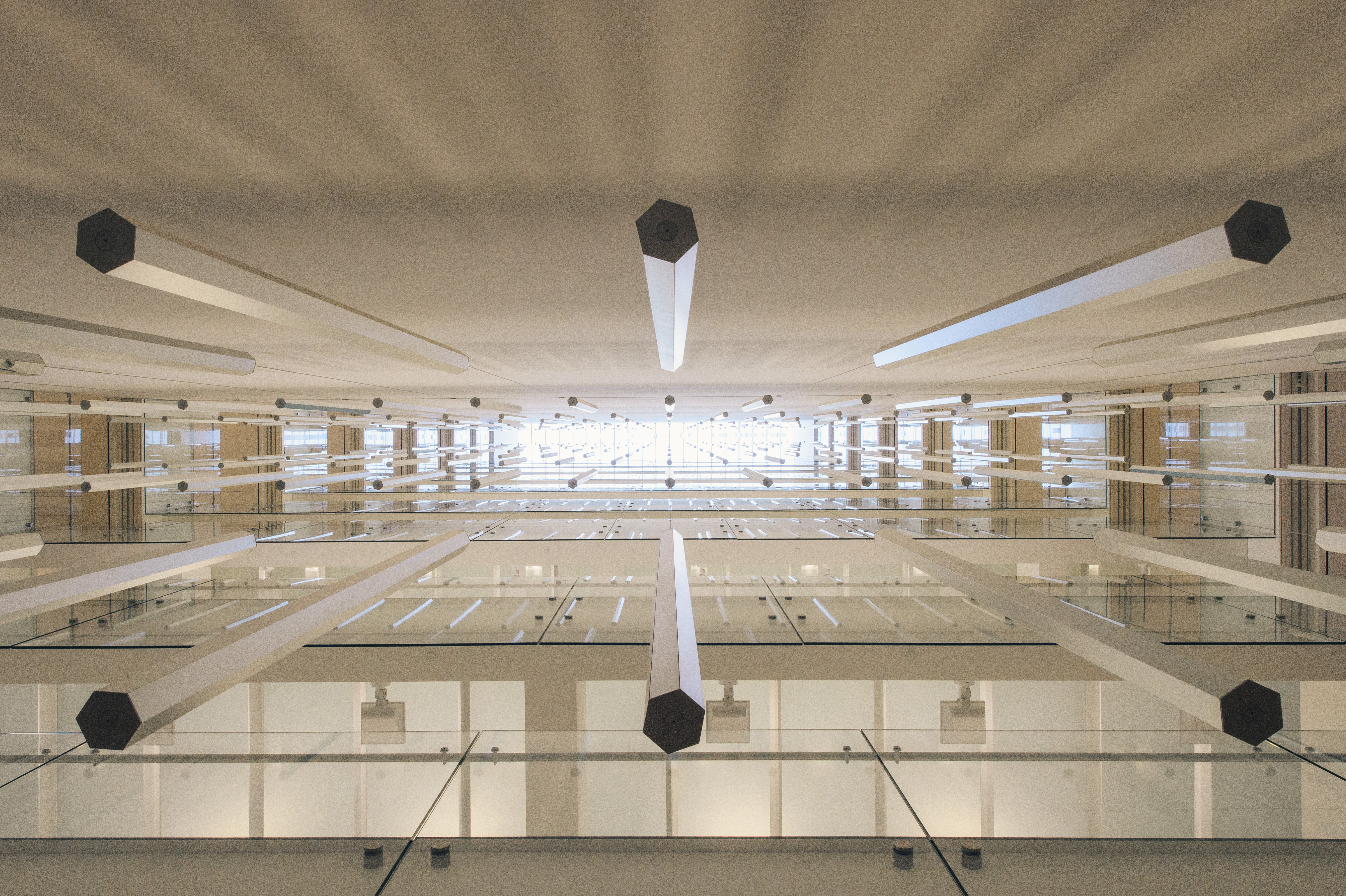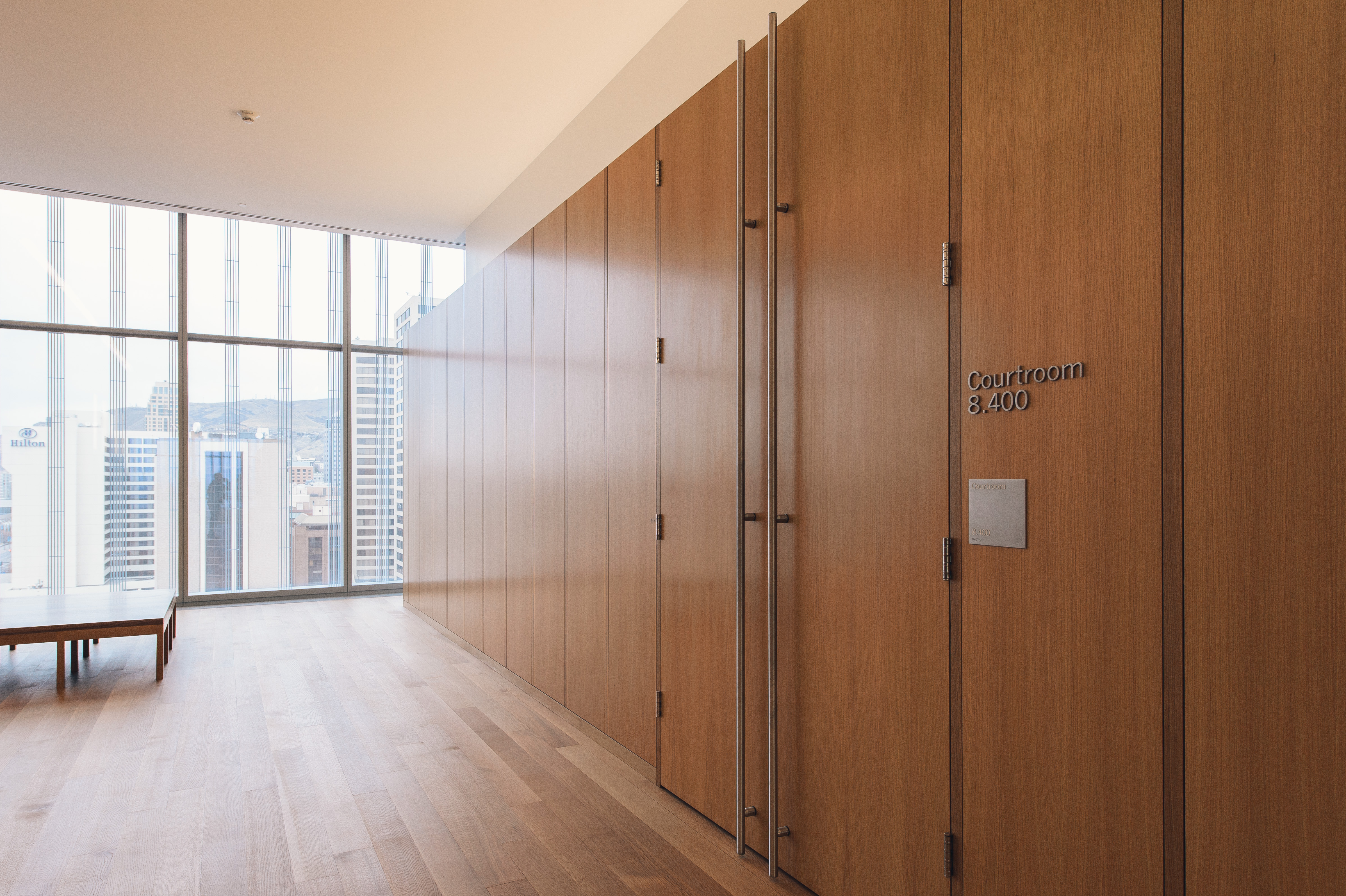 For inspiration, the design team [along with a few representatives of the court] flew all over the country to look at other federal courthouses during the design process. The group noted that so many of the buildings they saw were dark and enclosed-feeling. And so, they decided to do the opposite. The courthouse, which is comprised of an inner structure and outer curtain wall system [engineered to protect against blast and seismic damage], is essentially a minimalist love letter to open space and natural light–one of the many reasons we’re smitten with the structure. The building’s construction was scheduled to take 38 months, and it was finished exactly on time. The clean and modern exterior is superbly complemented by a surprisingly warm, if nominal, interior with oak floors and [gorgeous] chambers finished in cherry. One of the most stunning parts of the building is the massive art installation that climbs the entirety of a 10-story atrium. Created by artist, James Carpenter, and consisting of 380 hexagonal tubes of optical aluminum, the piece feels very much a part of the architecture in that it both enhances and respectfully bows to the design.