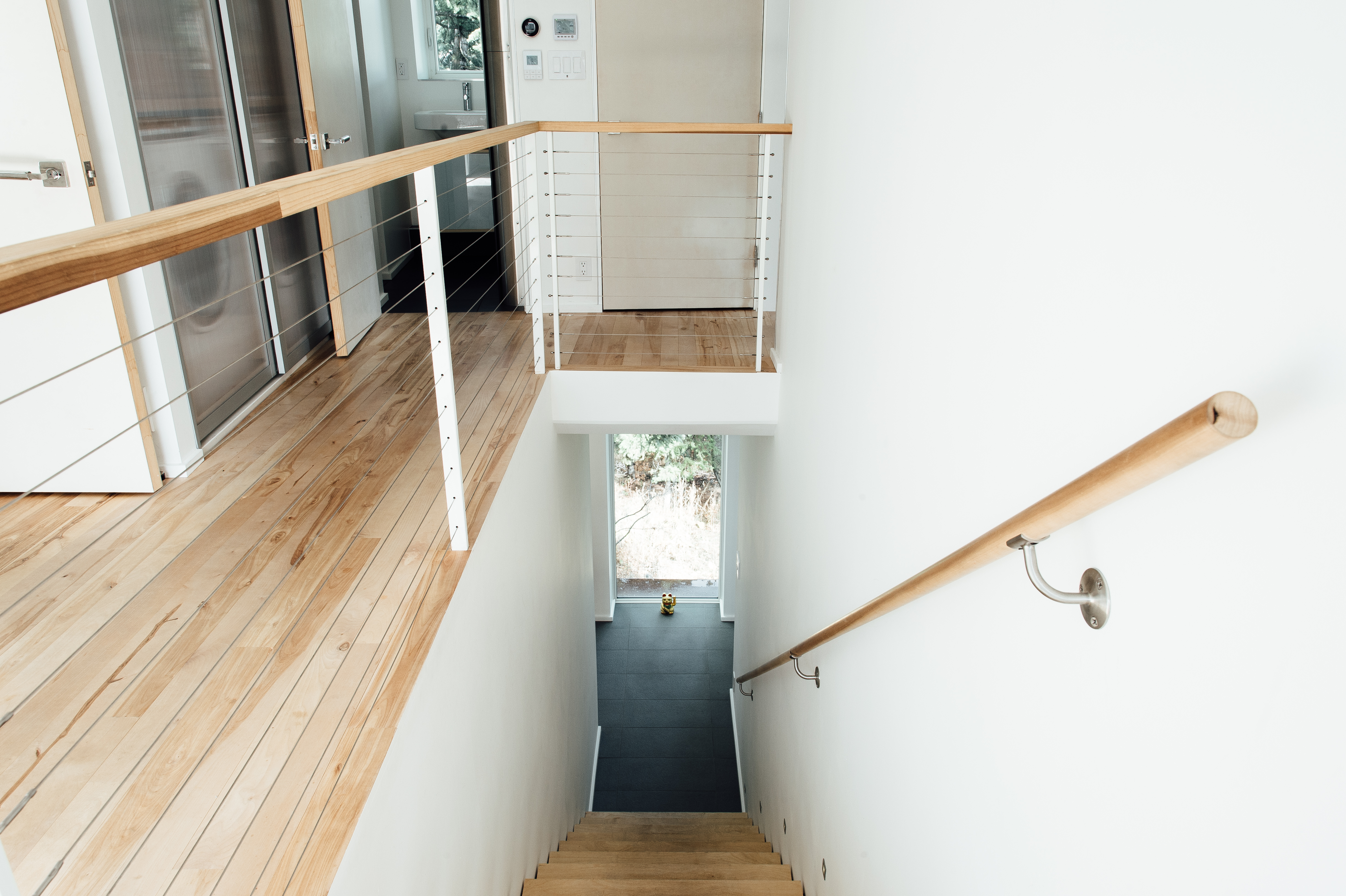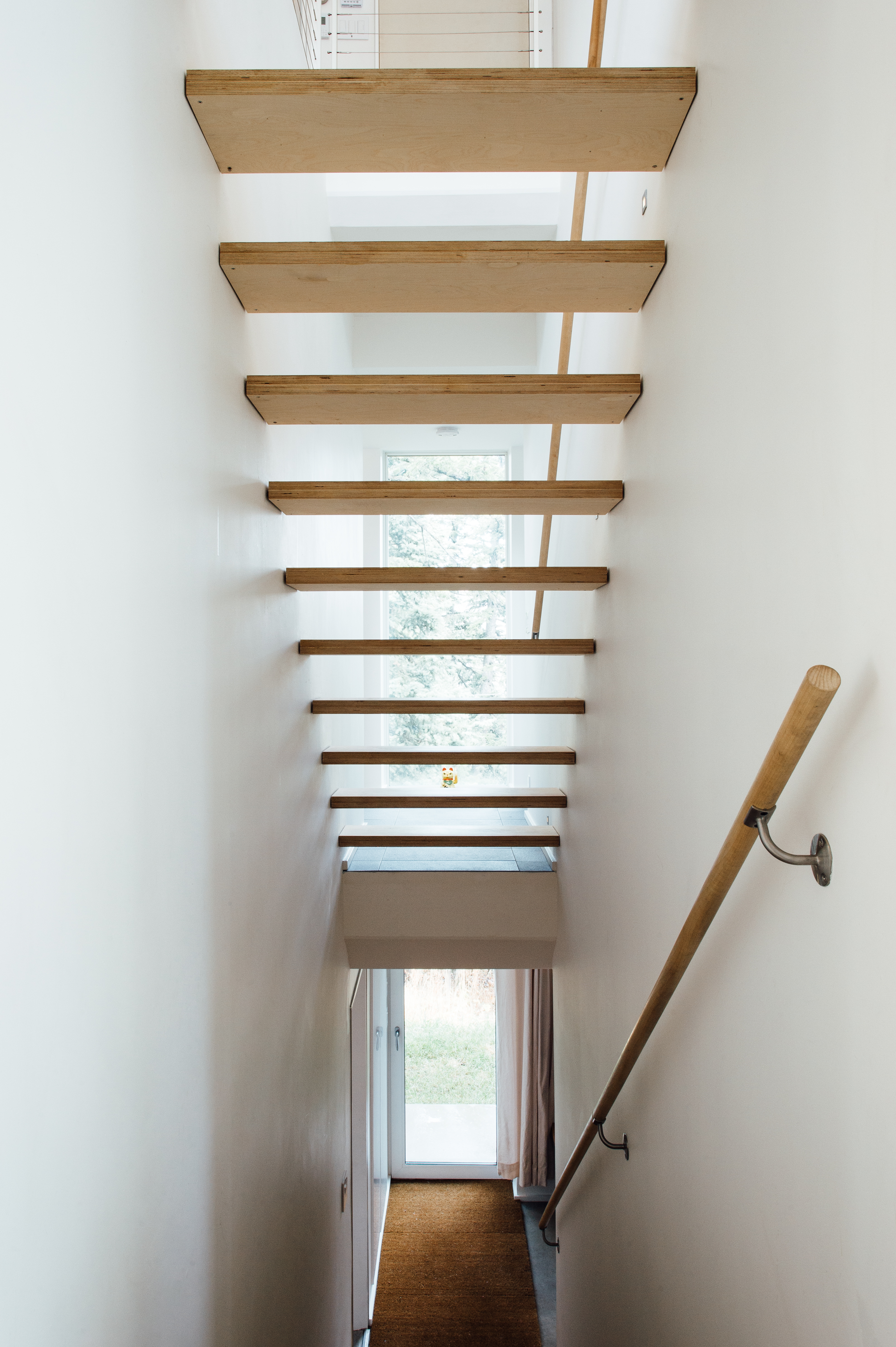 The goal was to show that--contrary to popular belief--it can be affordable to build green, and to create a perfect space for Joerg and his family. He set to work, and $282,600 later, he had a 2,400 square foot masterpiece, just right for his family of four. When entering the home, you're instantly in awe of the amount of light reflecting onto the stark white walls, and taken aback by the forest views that are visible from nearly every sitting spot in the house (including through the stunning floating staircase). Every window has been artfully placed to allow for maximum light, and for just the right amount of heat. Concrete floors provide thermal mass to distribute the heat coming in from the windows, and the 15” thick walls provide a whopping R-60 insulation value. (If some of this is sounding familiar, you may recall Summit Haus, designed by architect Chris Price while he was studying under Professor Joerg at the University of Utah. In a way, you could say 125 Haus is Summit Haus’ older brother--a couple of siblings we’re quite smitten with.) Joerg's masterful home boasts heating costs of around “six Starbucks lattes a month,” according to Joerg (around $22.) There is radiant heating in the concrete floors, no air conditioning, and it is so efficient that it can even significantly utilize the heat coming off of the light bulbs.