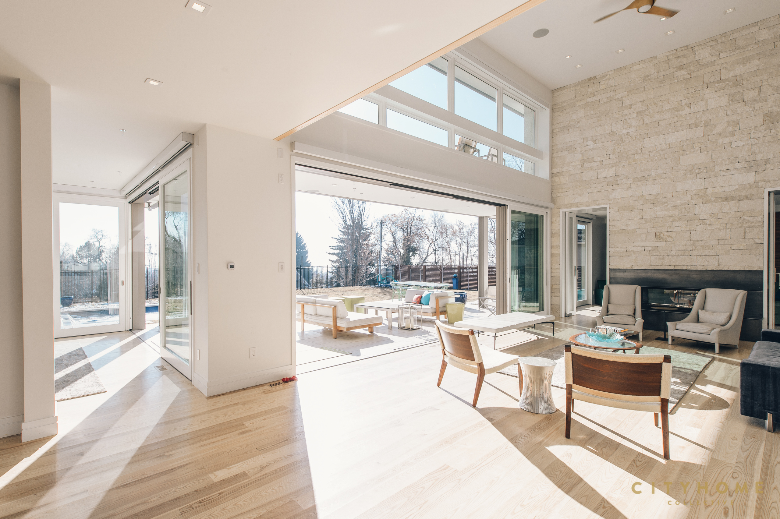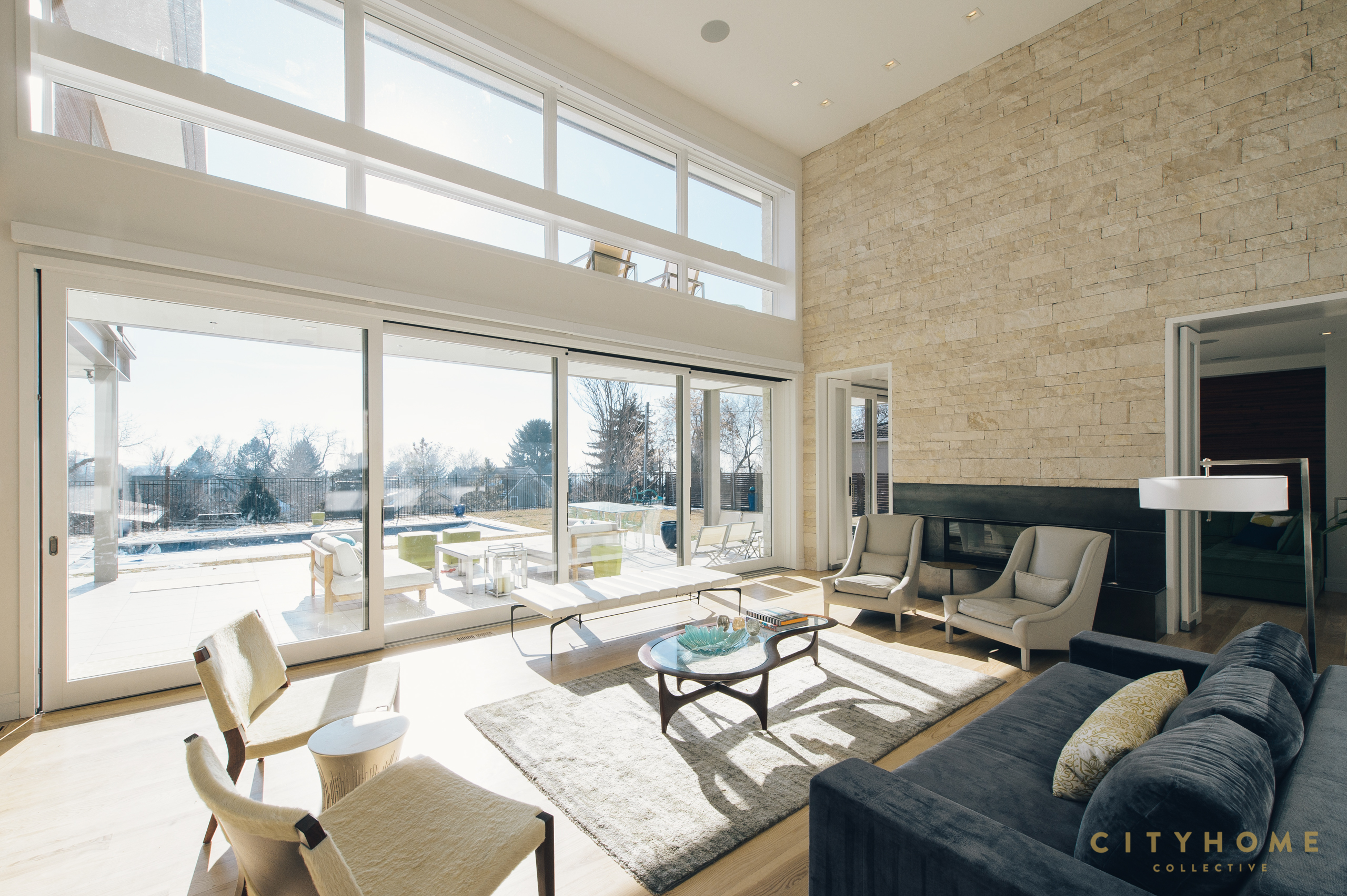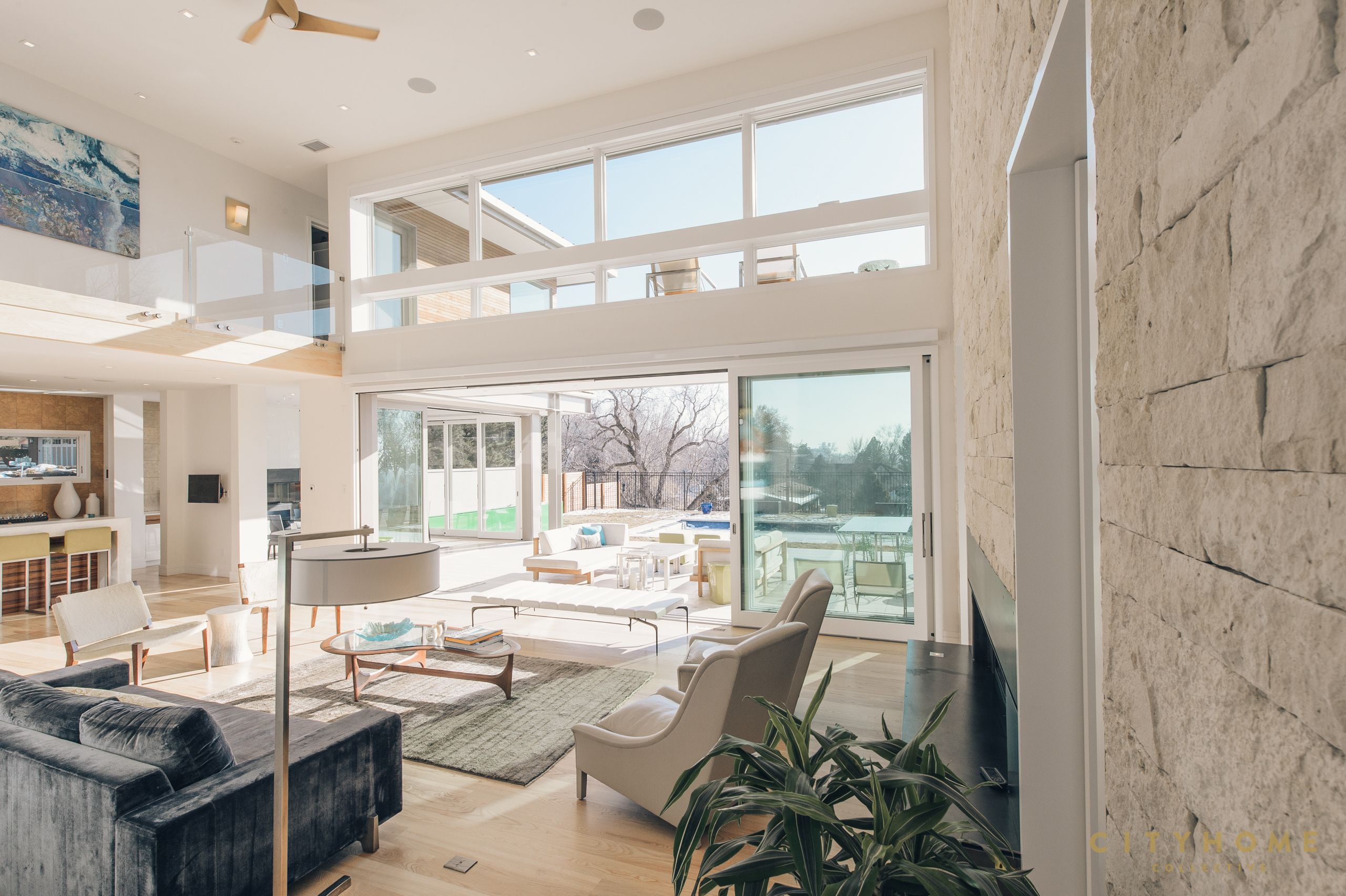 From there, the space opens into a downright cavernous entertaining area. The wall of windows [a few expertly-fitted, energy-efficient beauties by Marvin] opens almost completely, making the living room and back patio one fabulously fluid space. The aforementioned floor-to-ceiling limestone wall, which appears again in the living room, spills out onto the patio and continues along the exterior of the home [this is continuity at its finest, people].