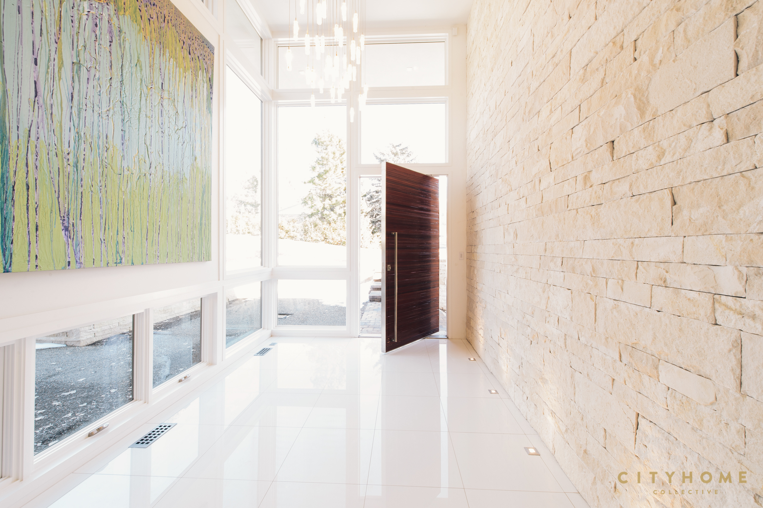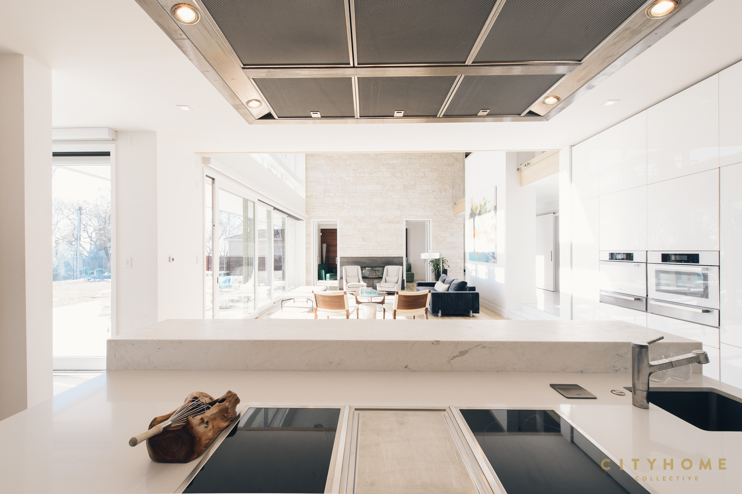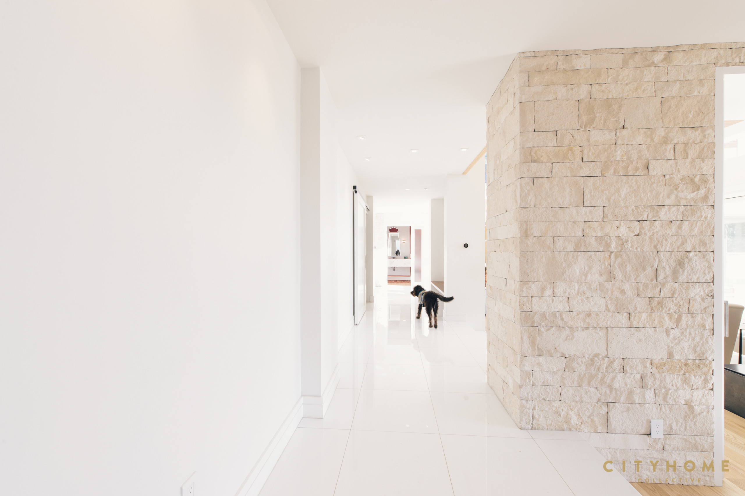 From there, the space opens into a downright cavernous entertaining area. The wall of windows [a few expertly-fitted, energy-efficient beauties by Marvin] opens almost completely, making the living room and back patio one fabulously fluid space. The aforementioned floor-to-ceiling limestone wall, which appears again in the living room, spills out onto the patio and continues along the exterior of the home [this is continuity at its finest, people].