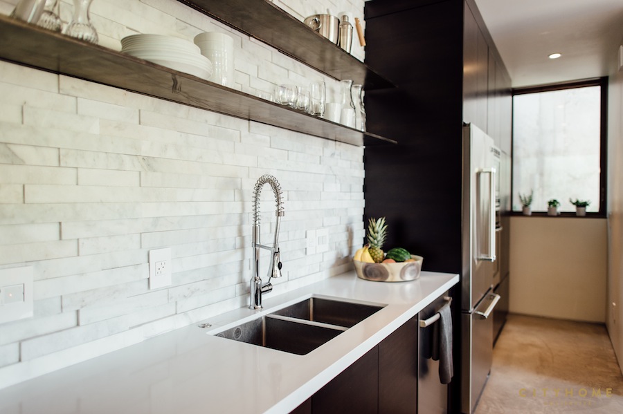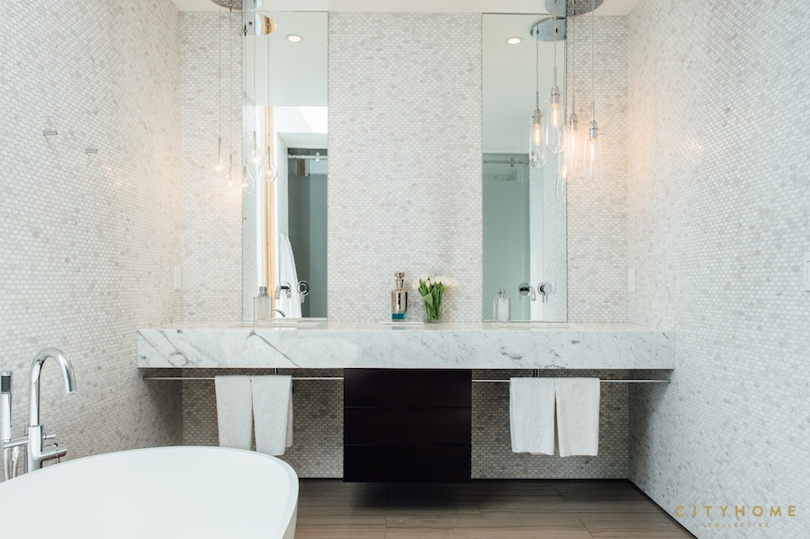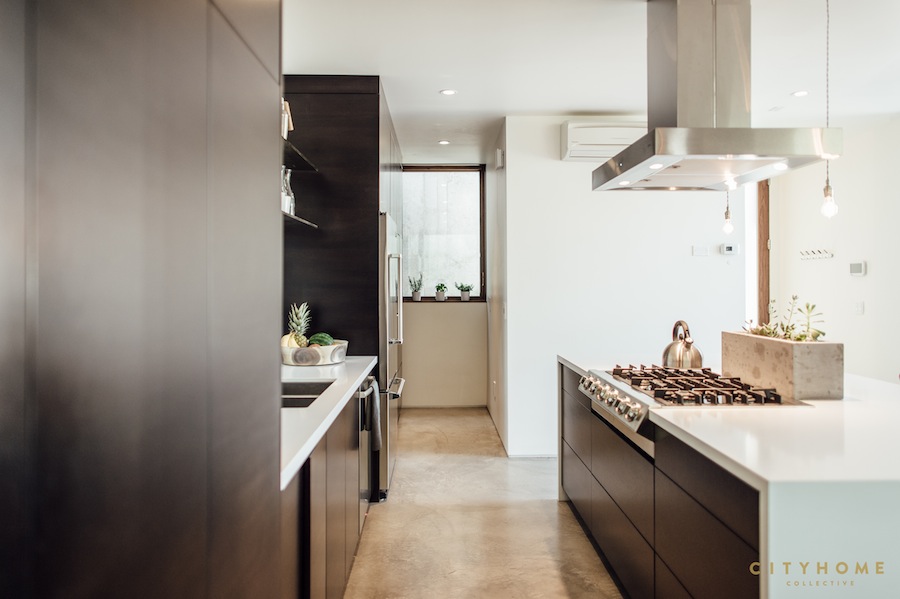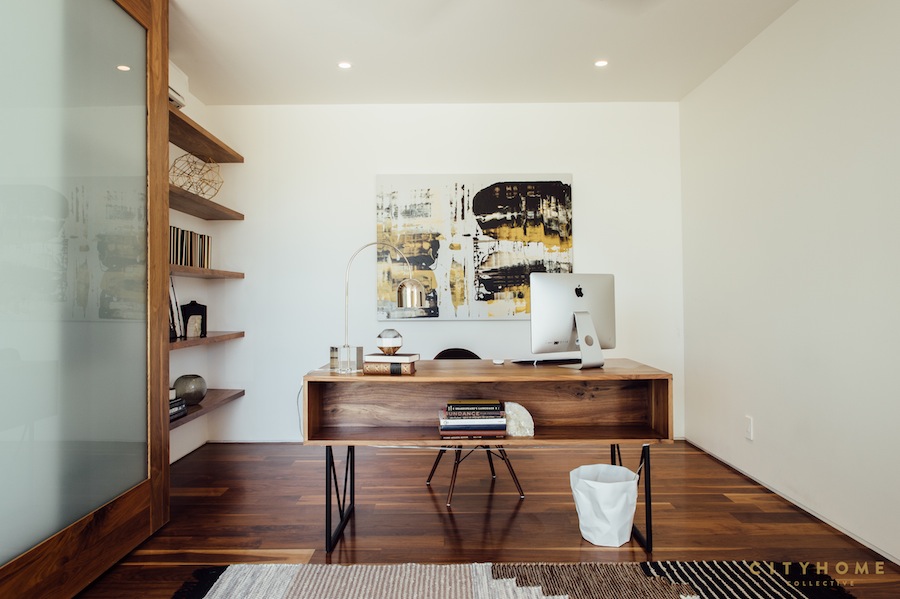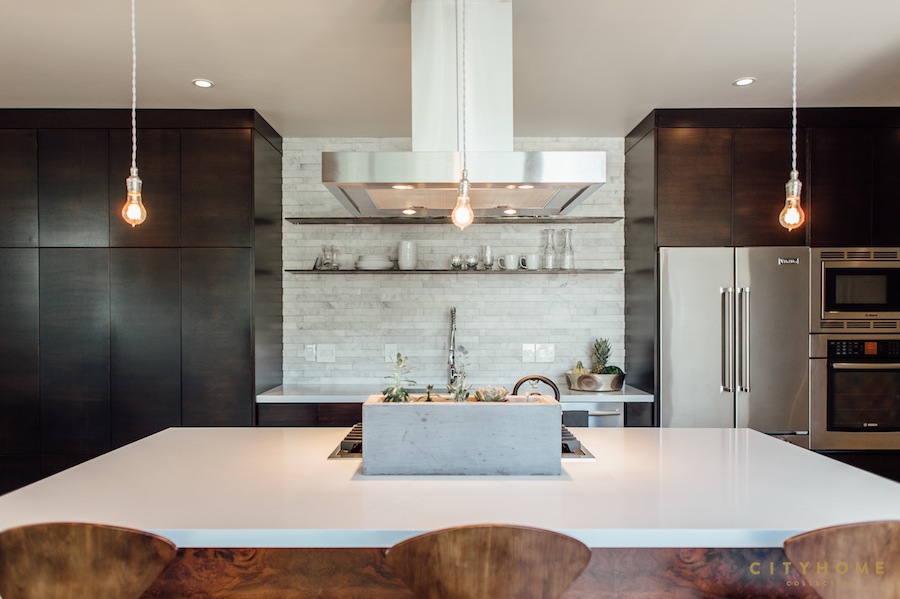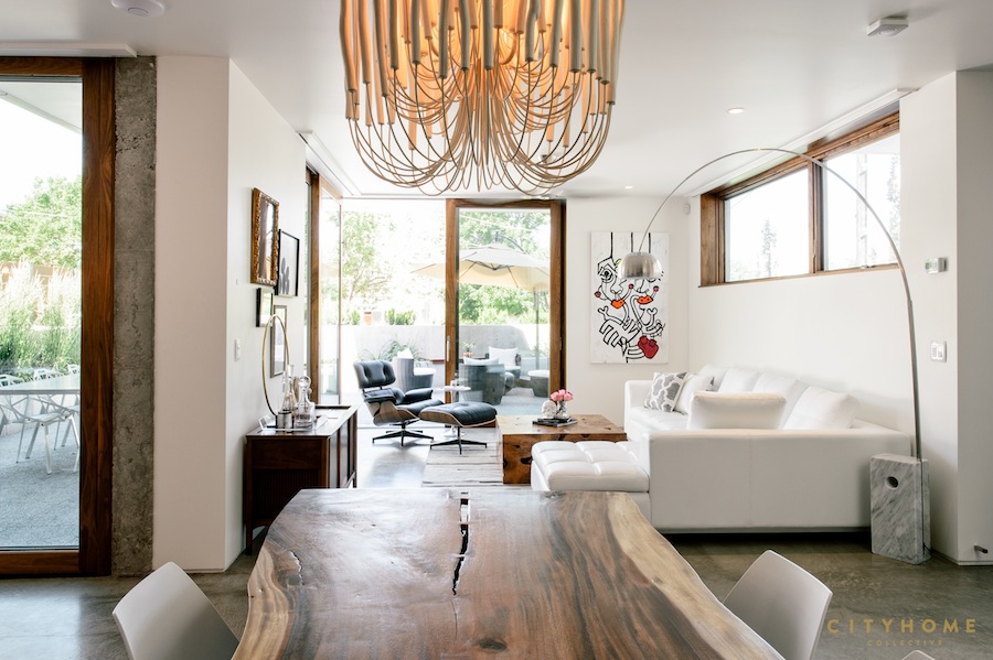Quoth Eileen Gray: “A house is not a machine to live in. It is a shell of a man, his extension, his release, his spiritual emanation. Not only its visual harmony, but its organization as a whole, the whole work combined together, make it human in the most profound sense.” The perfect home is akin to a well-fitting suit–it’s been so expertly tailored to one’s shape that it’s hard to imagine he was born, and lived much of his life, without it. It’s all at once completely custom and supremely innate. Like it was meant to be. From the very first stitch, the Chiaramonte home, a rare Marmalade modern, has been tucked and pinned to fit their every need. Every seam has been signed off on; every swatch hand-selected. The result is resplendent. This family wears one damn fine suit. Everything, from each of the bathroom vanities, to the burl wood-clad kitchen island, to the front door itself, is a simple, clean, and deliciously one-of-a-kind detail. Impactful finishing touches (the result of ongoing efforts by our own COLLECTIVE dame of design, Andrea Beecher) have been implemented here, to be sure, and the space is a true testament to the sentiment that less is, indeed, more. The furniture and decor has a clean-yet-curated feel. Like all good, interesting things, people, and outfits, the space hops between many points of inspiration, and never lulls to the boredom and safety of one note-ness. It’s eclectic in its detail while remaining minimalist and functional. What could have easily been a white, cold, concrete space is warmed by organic wood finishes. The home is luxe without ever feeling pretentious. It’s the handsome stranger with a smashing personality. The rarest of rarities.