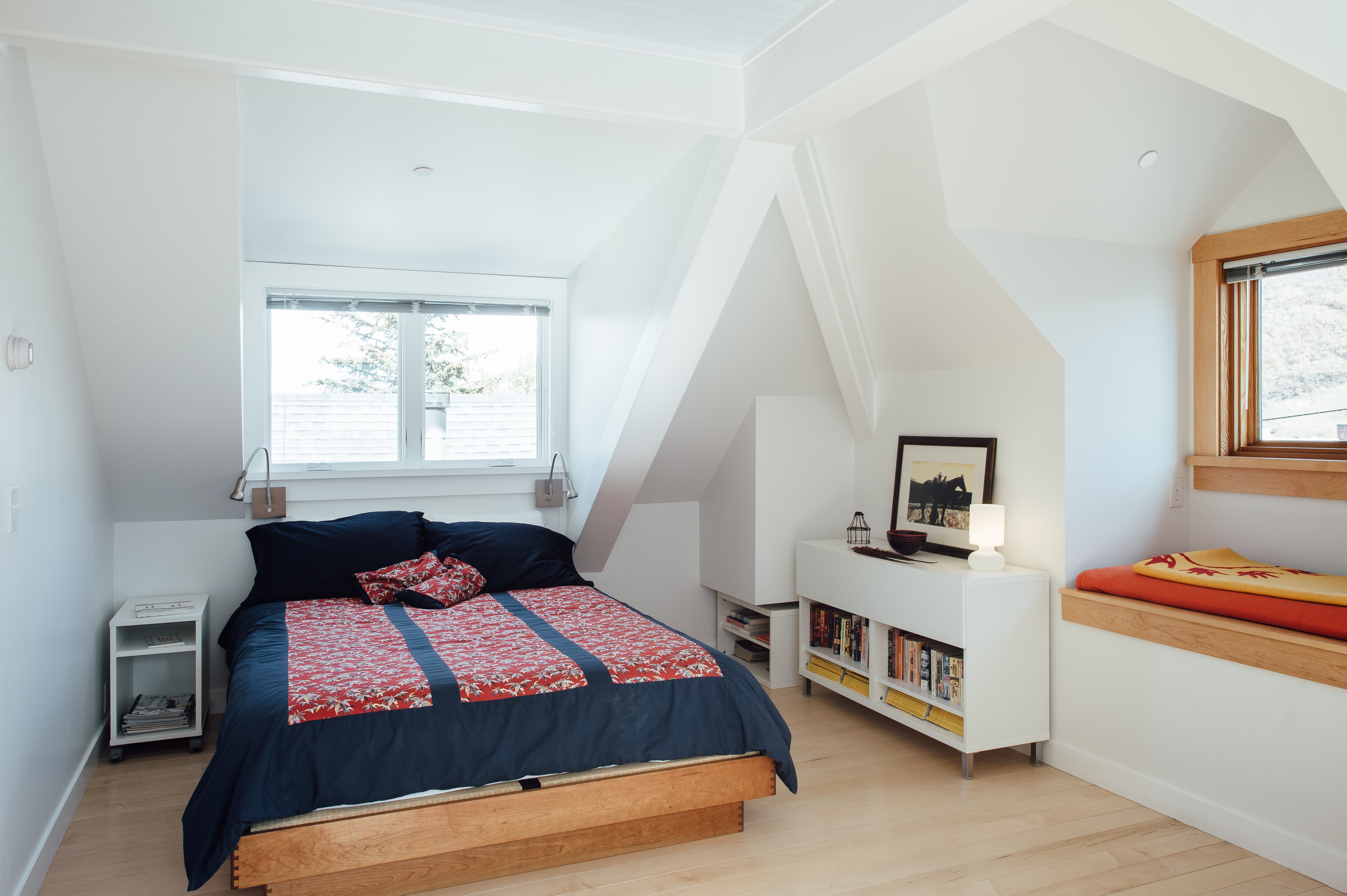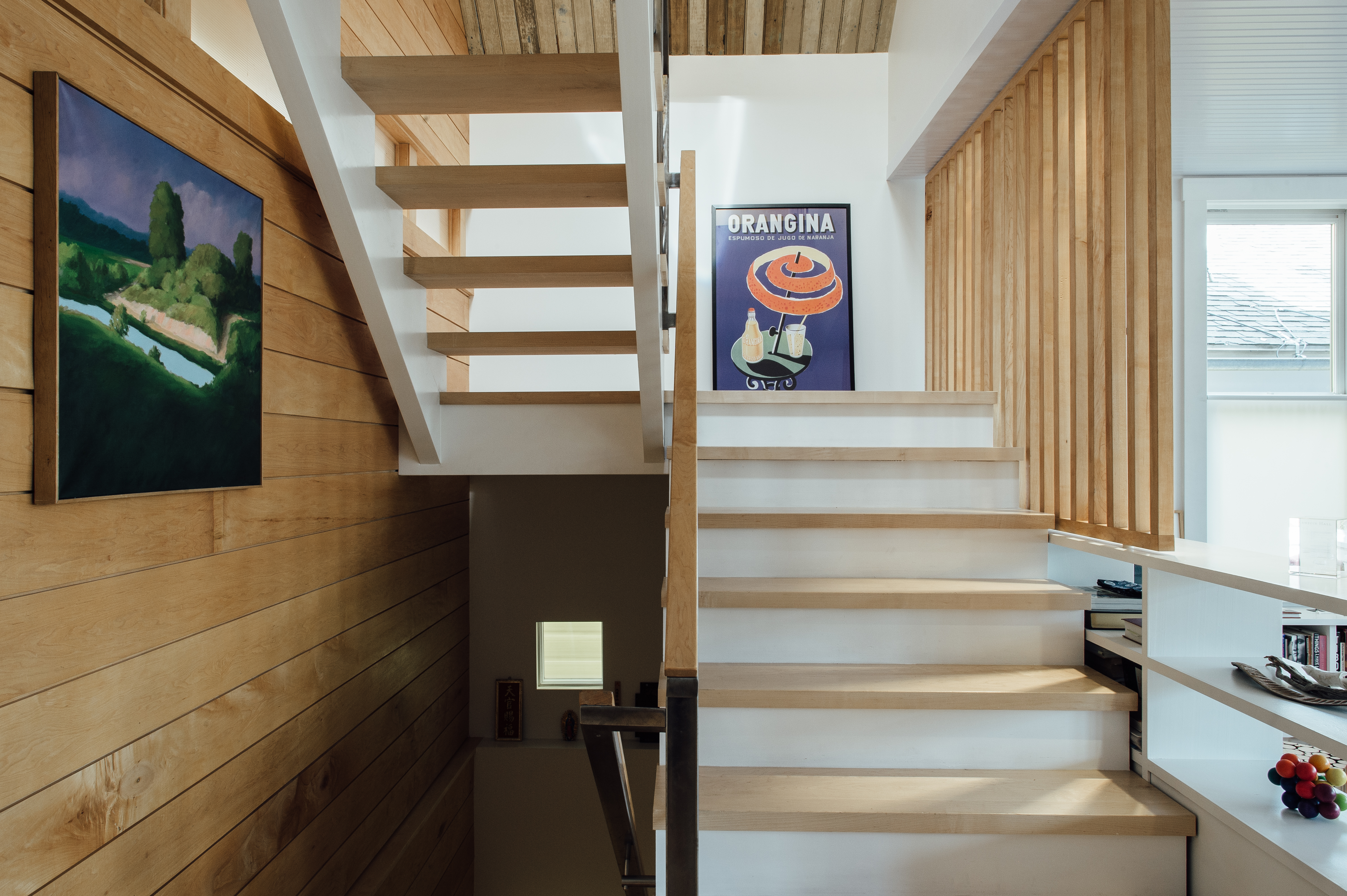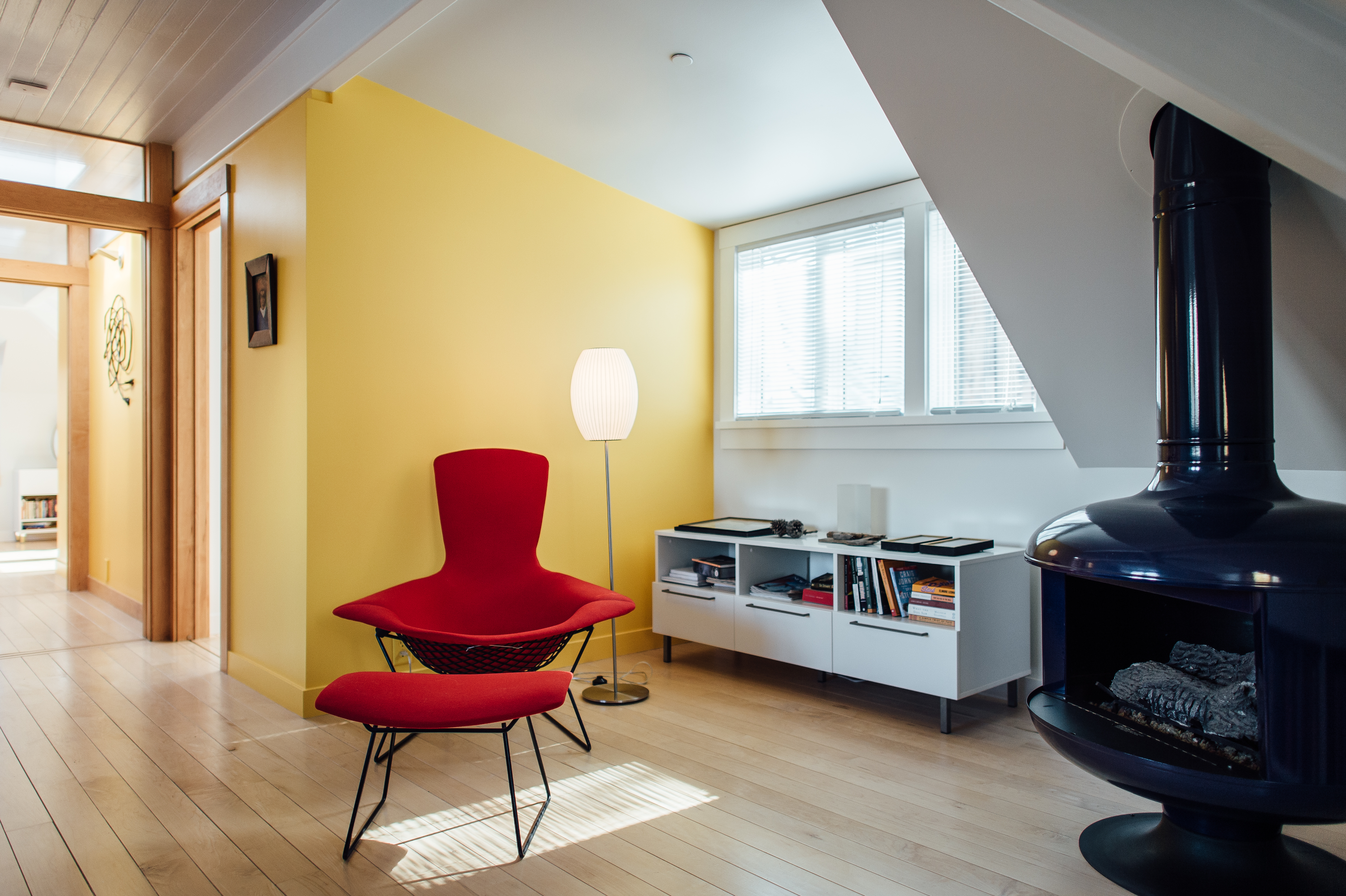 I noticed that the first house you remodeled had more traditional elements in the molding and trim woodwork and then you moved toward more modern detailing in the other houses. Can speak more to those design choices? We gave all the houses modern, open floorplans, and used white walls and line-of-sight window placement to help create the illusion of larger spaces than their actual tiny footprints. But with each house we’ve experimented with the materials and detailing, looking for ways to bridge the aesthetics between the Old (Victorian exteriors) and the New (modern interiors). On the first (Yellow, 1998), we designed traditional interior window trim and moldings to match the Victorian exterior, but used small splashes of bright color as well (a little bit of color goes a long way in small, interior spaces). The flooring is fir throughout. On the second (Red, 2000), we used oiled, vertical-grain heartwood fir throughout, to match the original rough-sawn fir roof structure that we discovered after sand-blasting off a century of black soot. In the new basement we used a smooth concrete floor and a board-formed concrete wall as more modern contrasts (although board-forming is the traditional method and the plank widths echo the exterior siding). We also built a very modern tile/concrete/wood bathroom, and kitchen with honed granite counters. We also brought the red siding into the kitchen, and created a fir and Japanese-glassed clerestory-wall between kitchen and bath. In the third (Blue [or blurple], 2009), we used clear maple heartwood throughout for a lighter look & feel. The floors were sealed to keep them as light & white as possible, but the walls were oiled to a slightly darker shade. The lines of the Victorian glass clerestories on the front porch were then continued inside as modern maple & polycarbonate clerestories on the main floor. In the fourth (Green, 2013) [not pictured], we used white oak throughout for both floors and walls. In most cases we left the wood as light as possible, but in some spaces, for contrast, we oiled the wood to a darker, more traditional color. The streetside interior walls and vestibule in the great room were detailed to match the Victorian exterior, but from that point on the house has a modern vocabulary throughout, including white-painted steel to support the loft, glass stairway and bridge to the new rear addition.