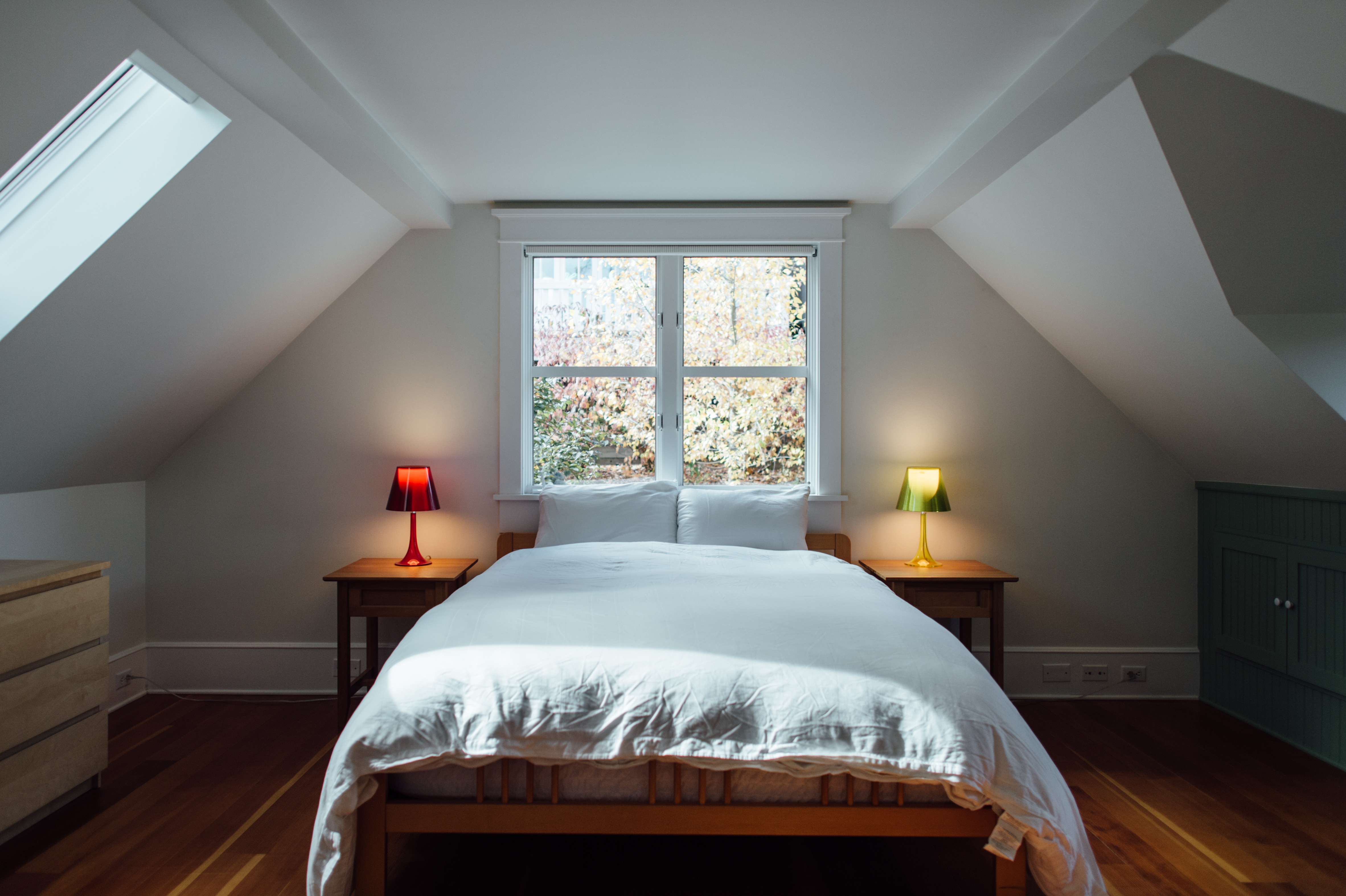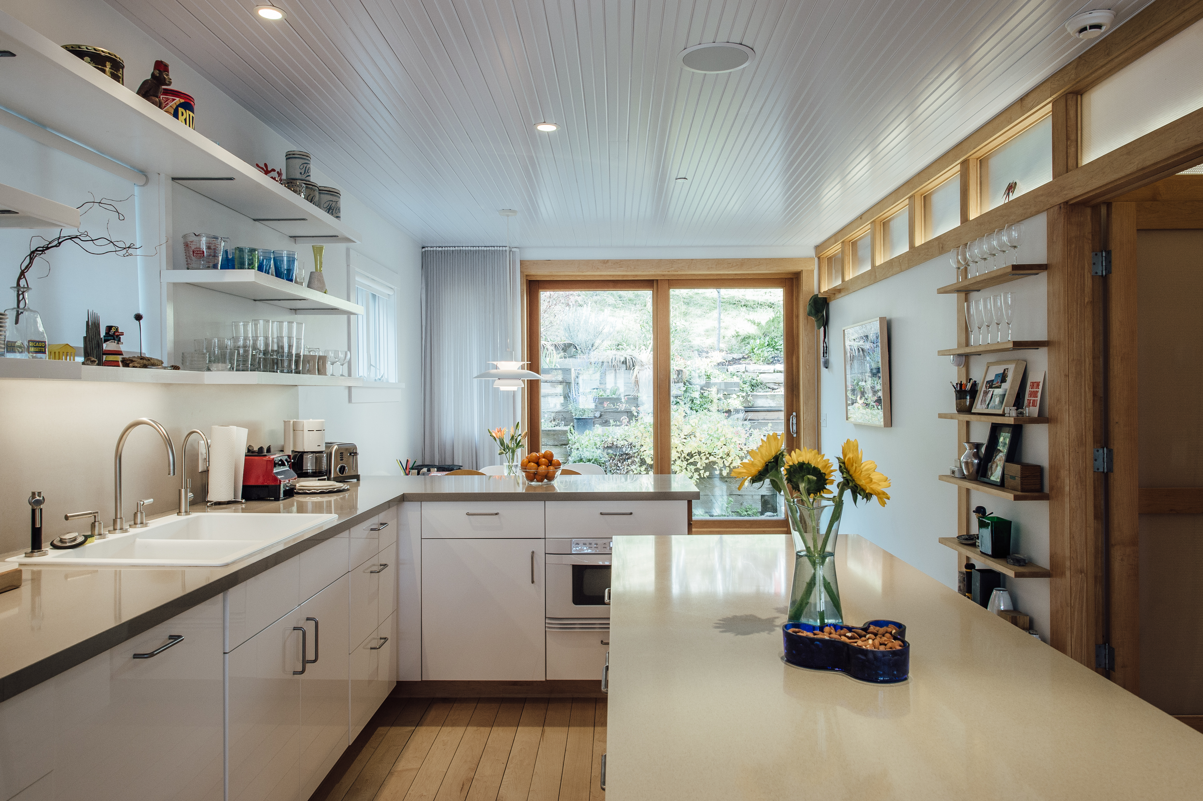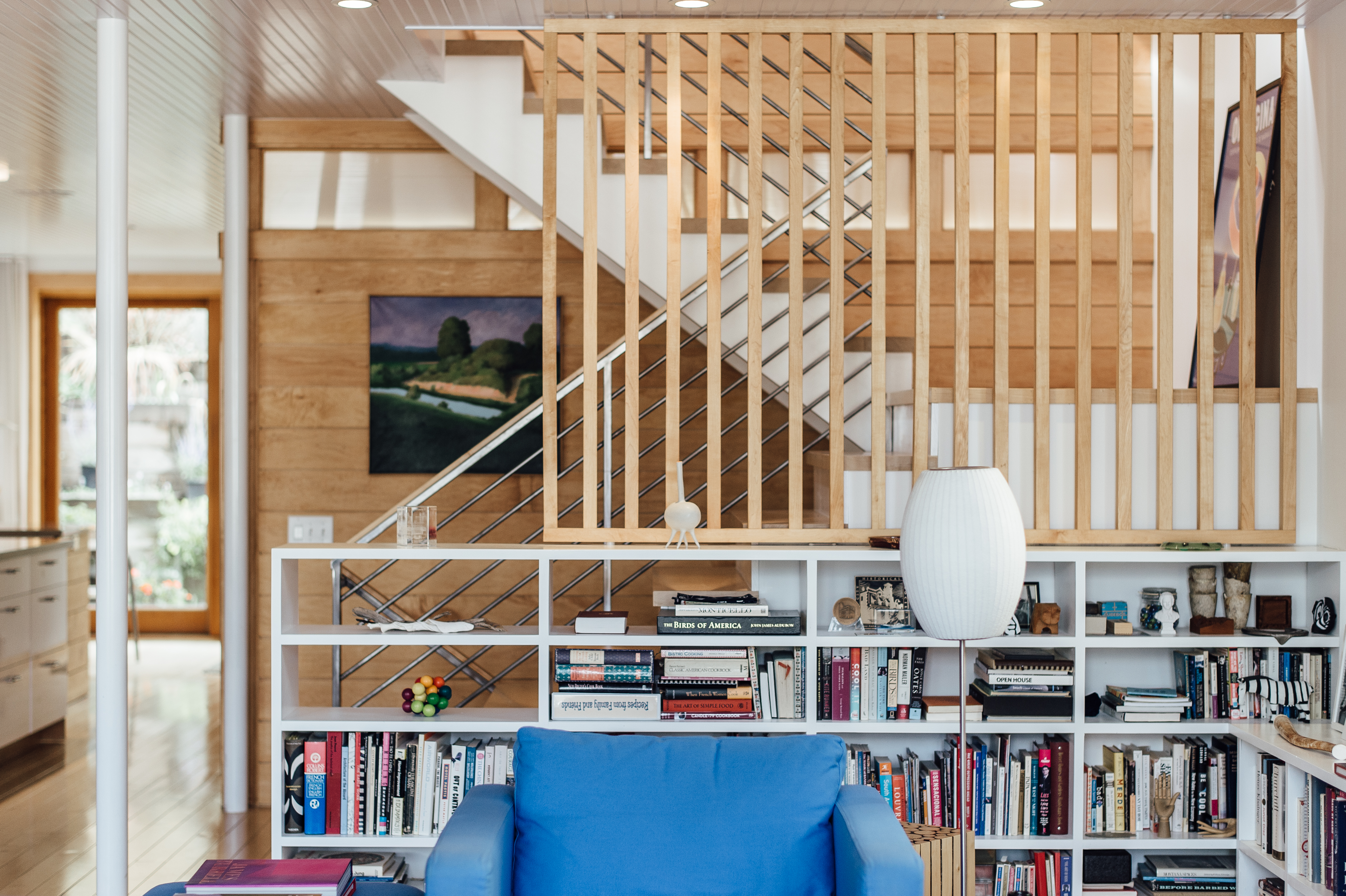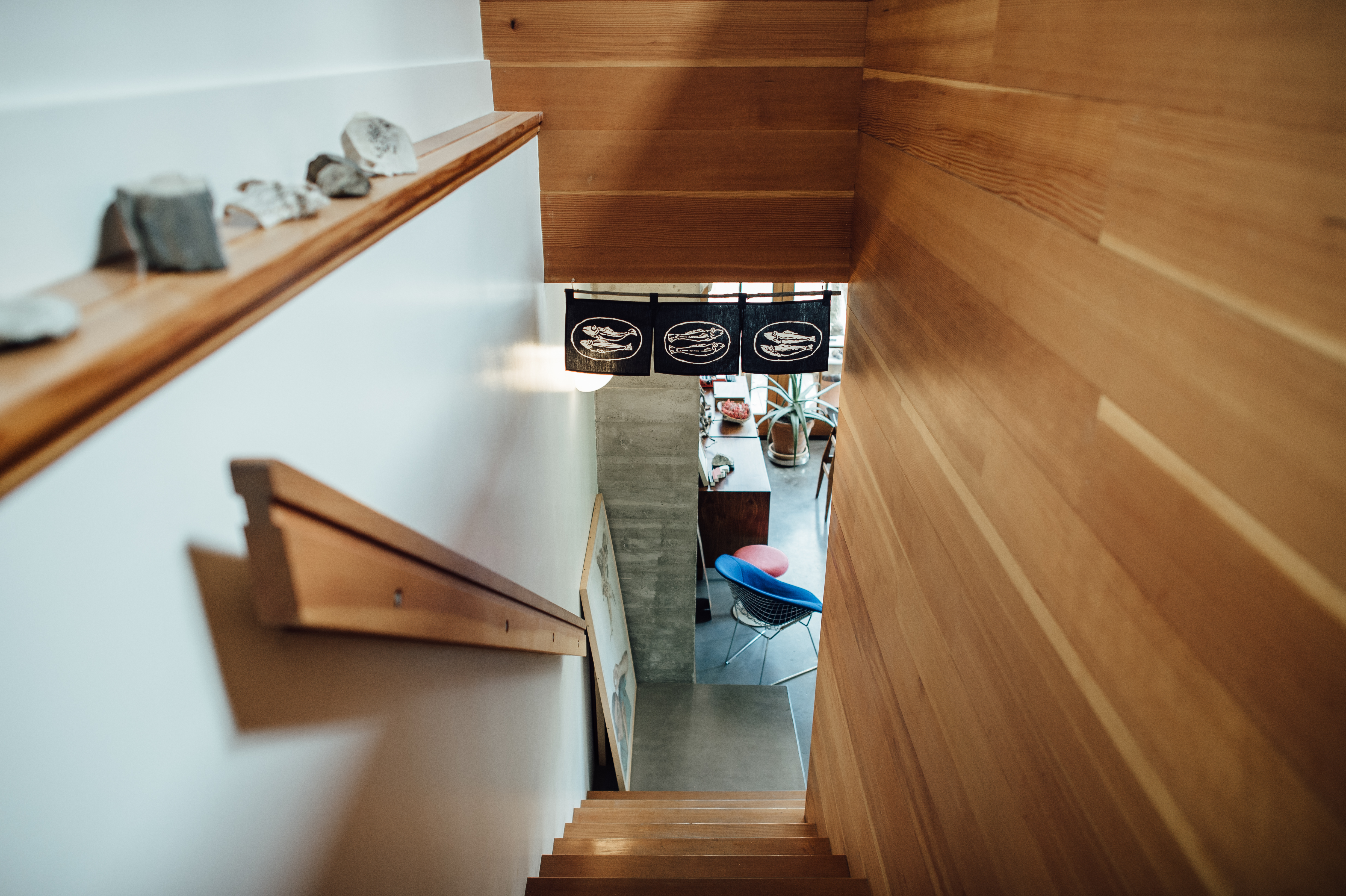 I noticed that the first house you remodeled had more traditional elements in the molding and trim woodwork and then you moved toward more modern detailing in the other houses. Can speak more to those design choices? We gave all the houses modern, open floorplans, and used white walls and line-of-sight window placement to help create the illusion of larger spaces than their actual tiny footprints. But with each house we’ve experimented with the materials and detailing, looking for ways to bridge the aesthetics between the Old (Victorian exteriors) and the New (modern interiors). On the first (Yellow, 1998), we designed traditional interior window trim and moldings to match the Victorian exterior, but used small splashes of bright color as well (a little bit of color goes a long way in small, interior spaces). The flooring is fir throughout. On the second (Red, 2000), we used oiled, vertical-grain heartwood fir throughout, to match the original rough-sawn fir roof structure that we discovered after sand-blasting off a century of black soot. In the new basement we used a smooth concrete floor and a board-formed concrete wall as more modern contrasts (although board-forming is the traditional method and the plank widths echo the exterior siding). We also built a very modern tile/concrete/wood bathroom, and kitchen with honed granite counters. We also brought the red siding into the kitchen, and created a fir and Japanese-glassed clerestory-wall between kitchen and bath. In the third (Blue [or blurple], 2009), we used clear maple heartwood throughout for a lighter look & feel. The floors were sealed to keep them as light & white as possible, but the walls were oiled to a slightly darker shade. The lines of the Victorian glass clerestories on the front porch were then continued inside as modern maple & polycarbonate clerestories on the main floor. In the fourth (Green, 2013) [not pictured], we used white oak throughout for both floors and walls. In most cases we left the wood as light as possible, but in some spaces, for contrast, we oiled the wood to a darker, more traditional color. The streetside interior walls and vestibule in the great room were detailed to match the Victorian exterior, but from that point on the house has a modern vocabulary throughout, including white-painted steel to support the loft, glass stairway and bridge to the new rear addition.