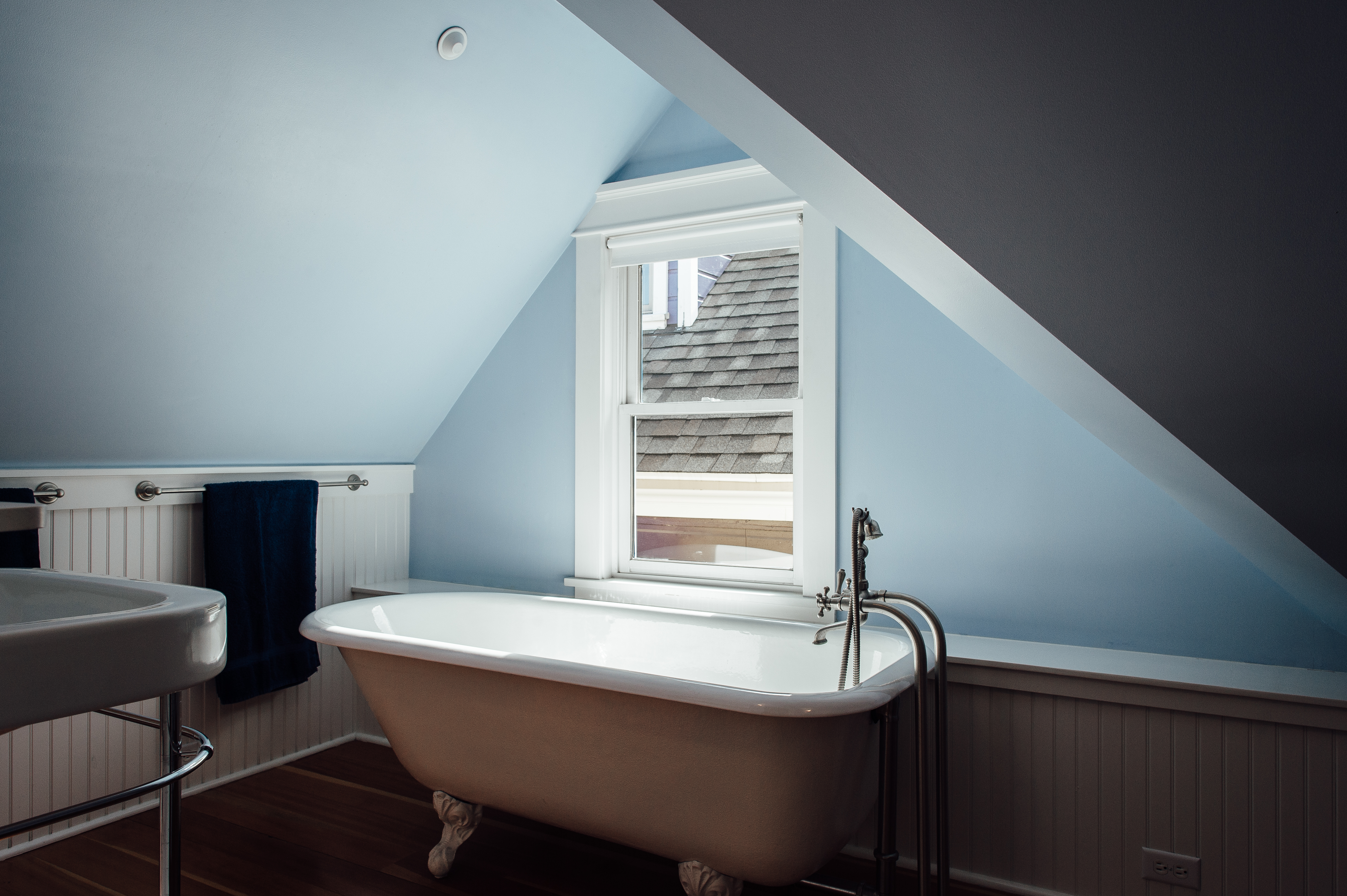 Though the spaces are separate, they seem to all work as parts of one cohesive whole, and the contemporary and historic styles work wonderfully together. What was the design process with each of them? For each of the three homes on Park Ave, the goal was to turn one floor of livable space into three floors, without greatly changing the relationship of their front facades to the street. We did this by taking advantage of the street’s downhill slope, lifting the houses about 20” (or three porch steps) to build full basements with single garages on the downhill side. Then we opened up the attics with steel framing to create bedrooms and baths above, turning the original, one-floor houses into three floors, without greatly changing their connection to the street. On the exteriors, the historic facades had been removed or covered up over time, so we replicated the original appearance based on old photos, which included rebuilding the missing bay window on 557. About 1/3 to 1/4 original siding, with new siding milled to match the profile of the originals (each house is slightly different). All new wooden windows to replicate originals that had been removed, replaced. And for the blue house, we rebuilt the entire bay window that had been removed in the '70s.
