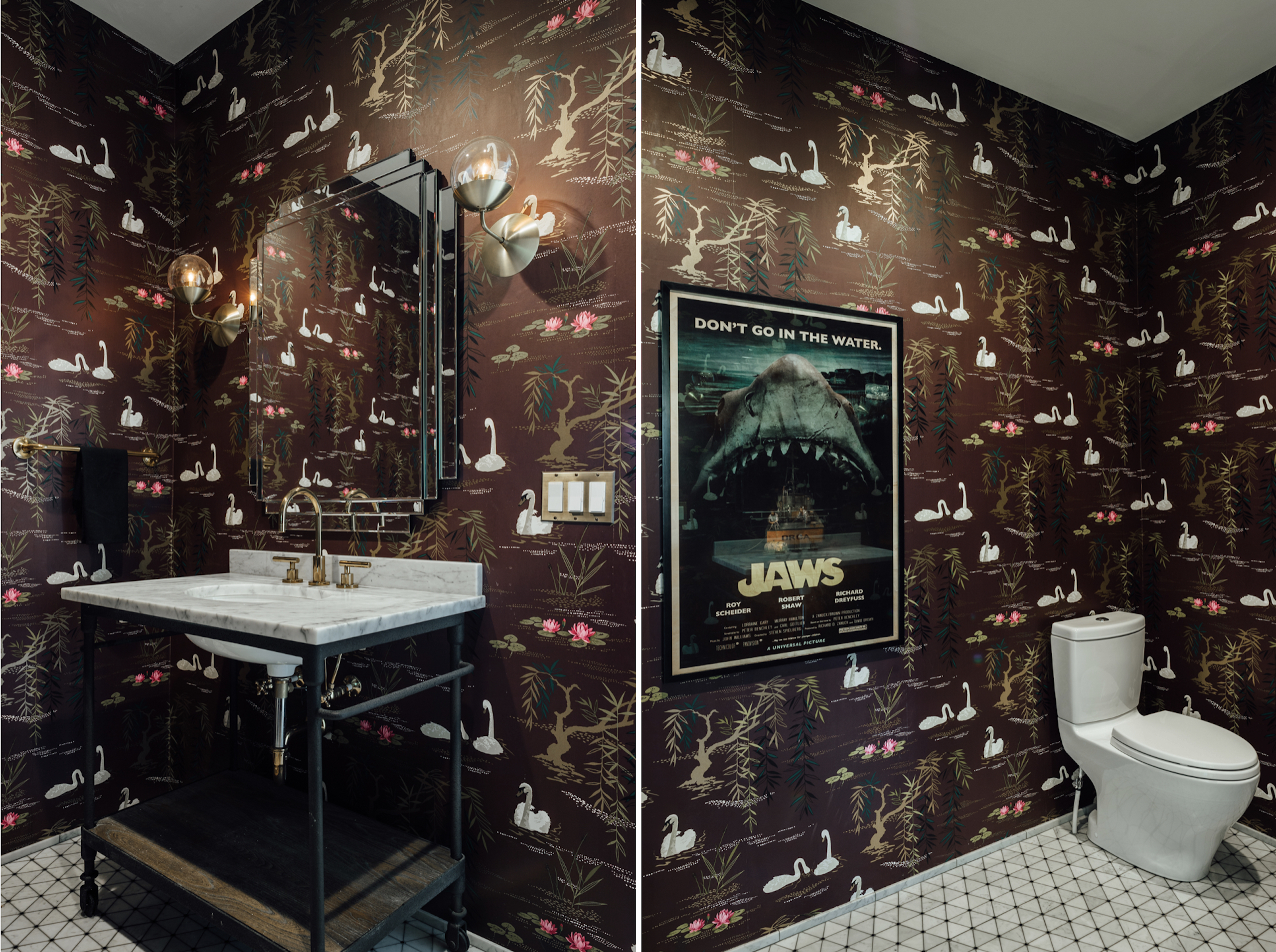 This one comes to us courtesy of our very own cityhomeDESIGN team. We admit we’re slightly partial, but the perfect execution of a WC that’s equal parts moody, playful, and sophisticated is a feat that ought not to be taken lightly. Plum (puce?) wallpaper runs no risk of heavy-handedness when it’s punctuated with swans and water lilies. The addition of fab brass hardware and a particularly playful poster ensure this spot never takes itself too seriously.