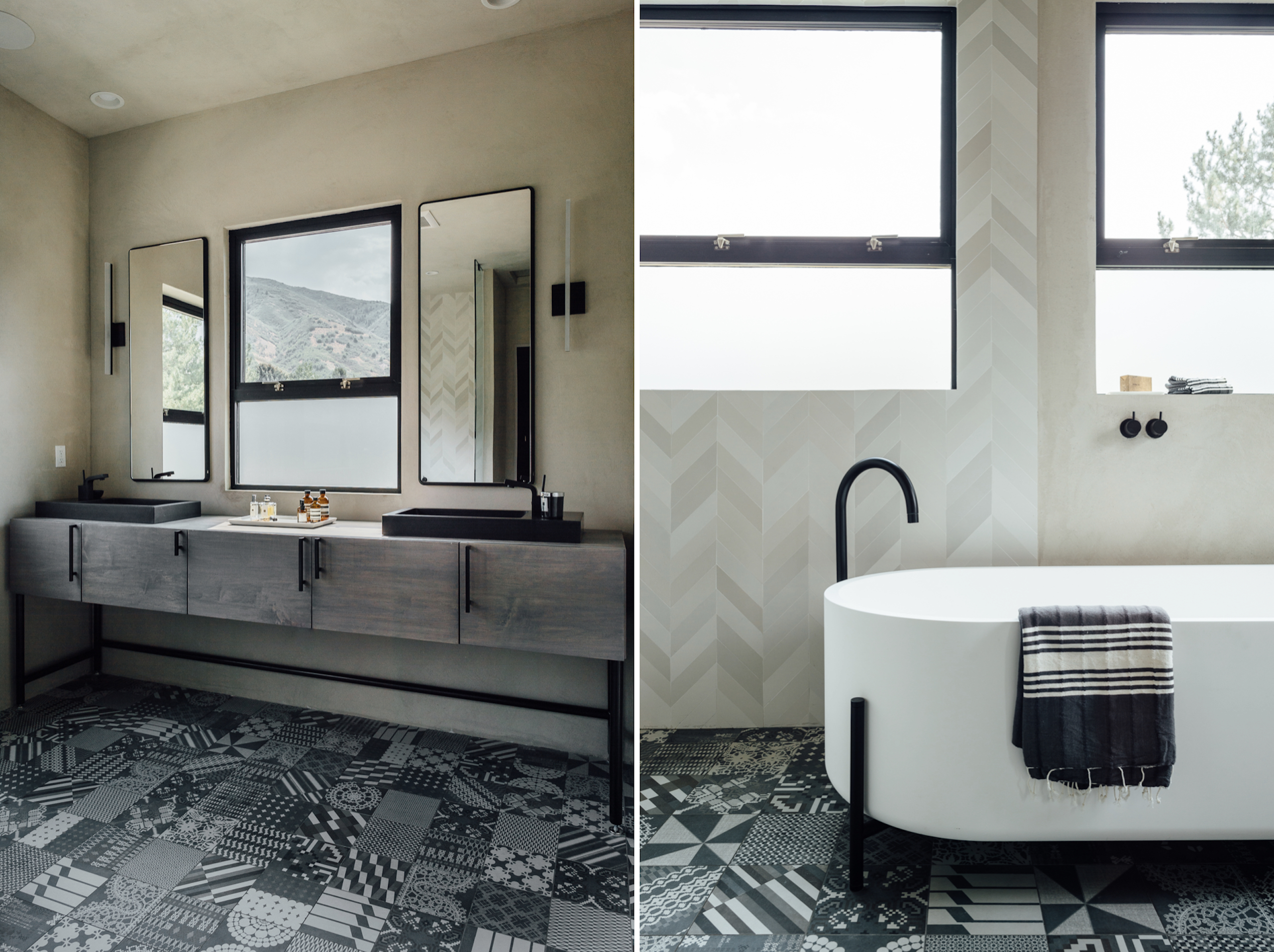 Another of our own design projects, this one, and let’s start with that bathtub: unique in form and fabulous in function. A tour-de-force among free-standing tubs. And, the rest of this lovely lavatory follows simple-yet-chic suit, as all the elements tie together in a delightfully deliberate way. The beveled edges of the vanity mirrors artfully reflect the shape of the aforementioned spout, and black fixtures throughout lend themselves to a vibe that is both clean and congruent. Round it all off with a touch of impeccable tile work and cabinetry, and this loo is elegant utility, defined.