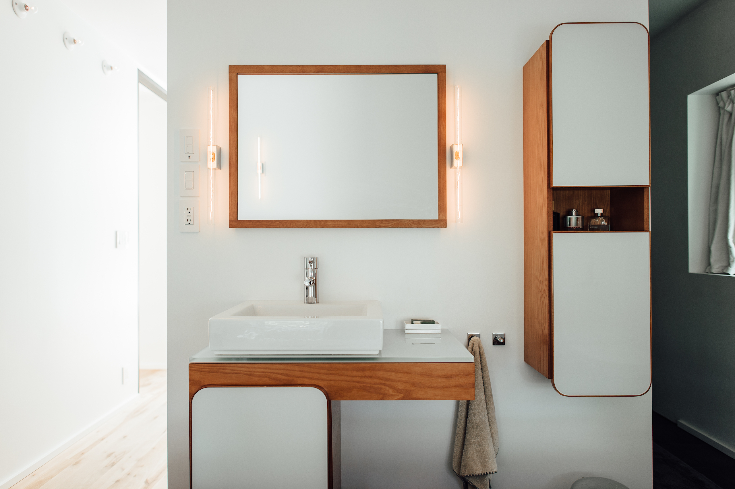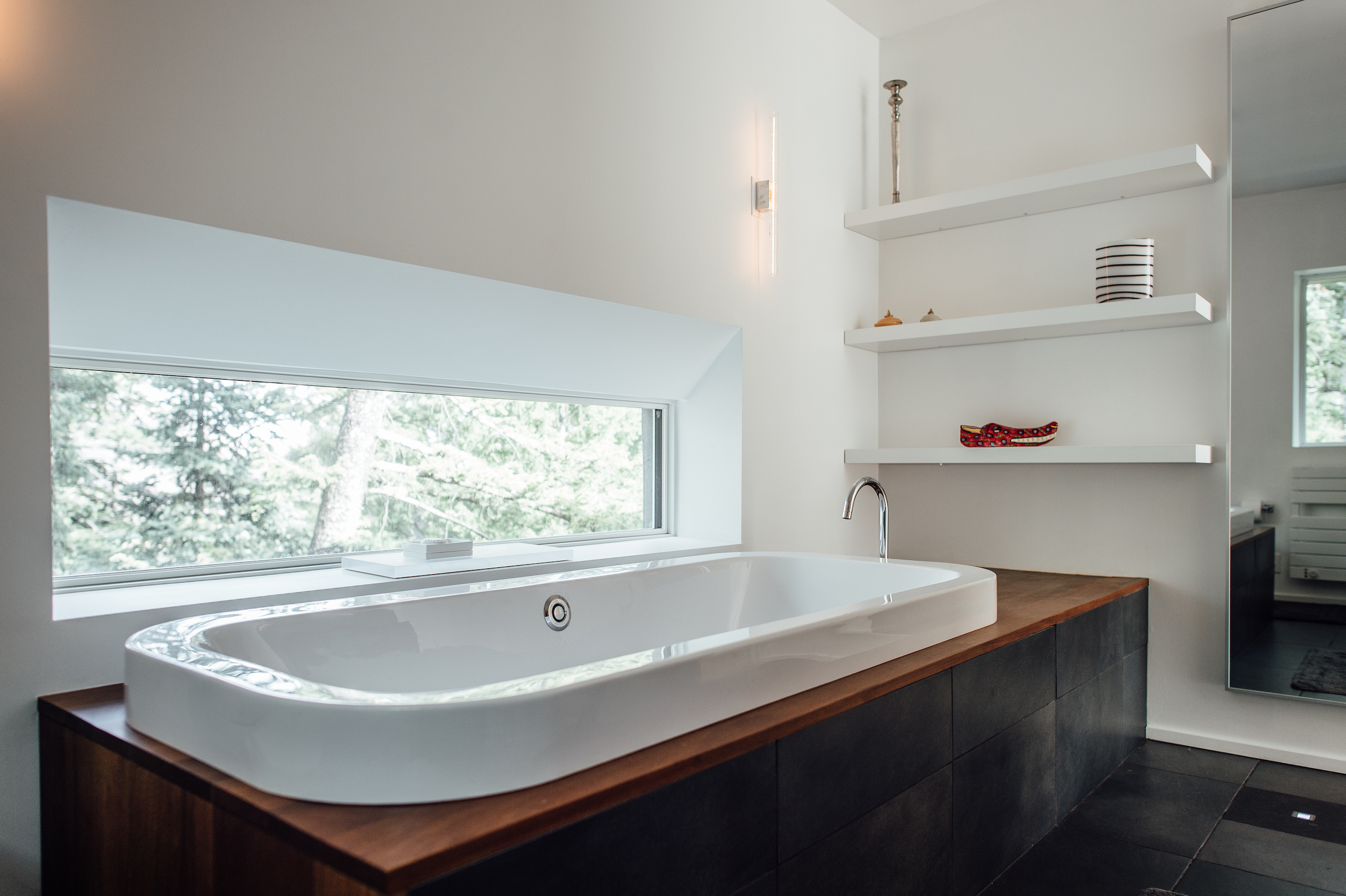 We’ve marveled before at the architectural excellence and ecological integrity of 125 Haus, and for good reason. The entire build boasts clean lines and warm vibes, and the resident baño doubles down on that sentiment. The fixtures, faucet, and cabinet fronts are all delightfully minimal, and wood accenting serves as an homage to a certain mid-mod ski lodge aesthetic that is ever-so pleasing. Plus, considering window placement, that tub looks to be an unequivocally top spot for a soak. Book in hand. Immersed in bubbles. Snow falling…wet and warm while enjoying the storm.